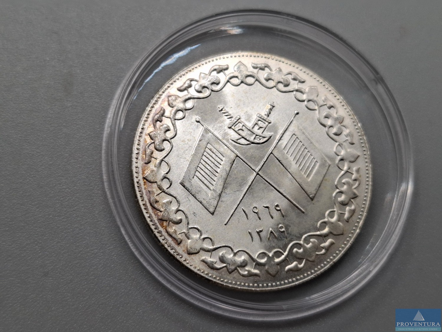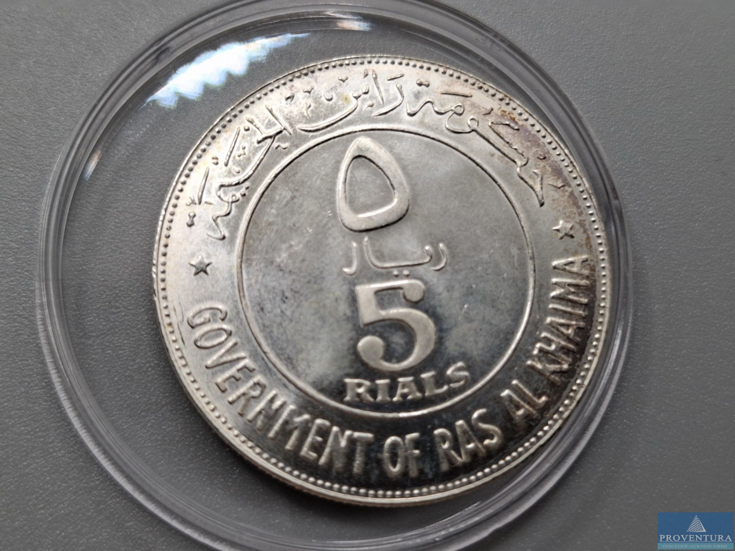 Серебряная монета Рас аль-Хайма 5 рияла 1389/1969 г. серебряная .835 15 гр грубого веса, KM3, потускнел
