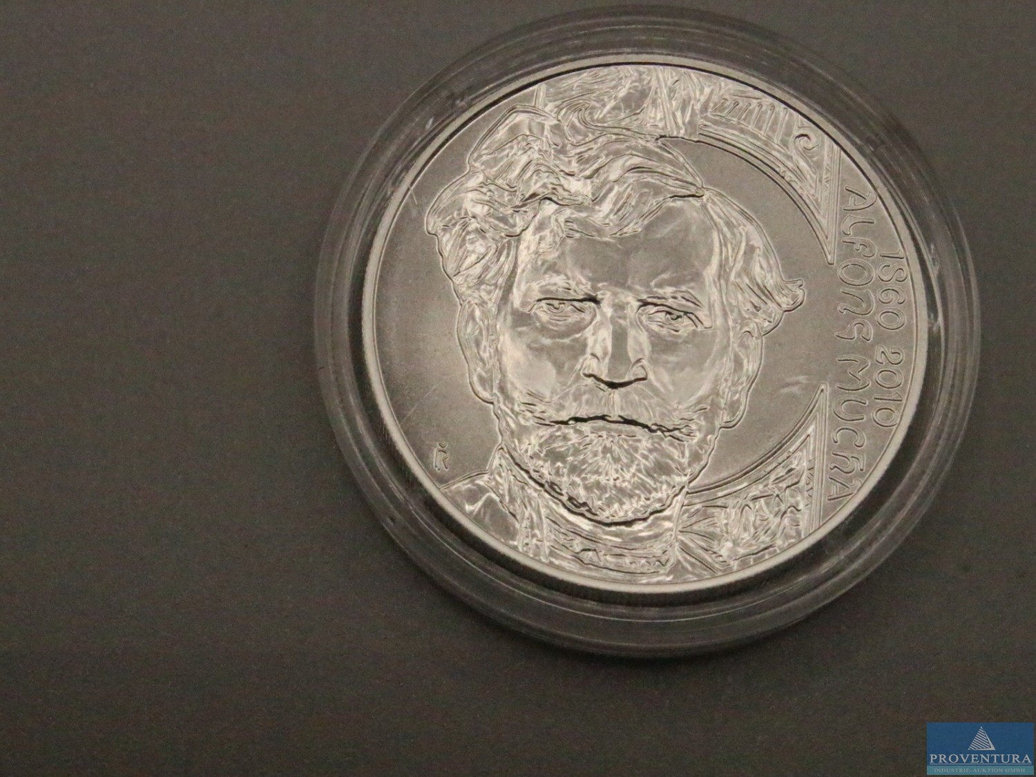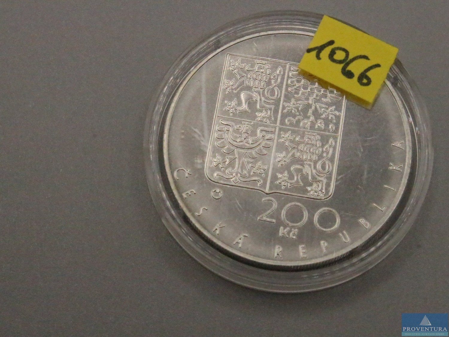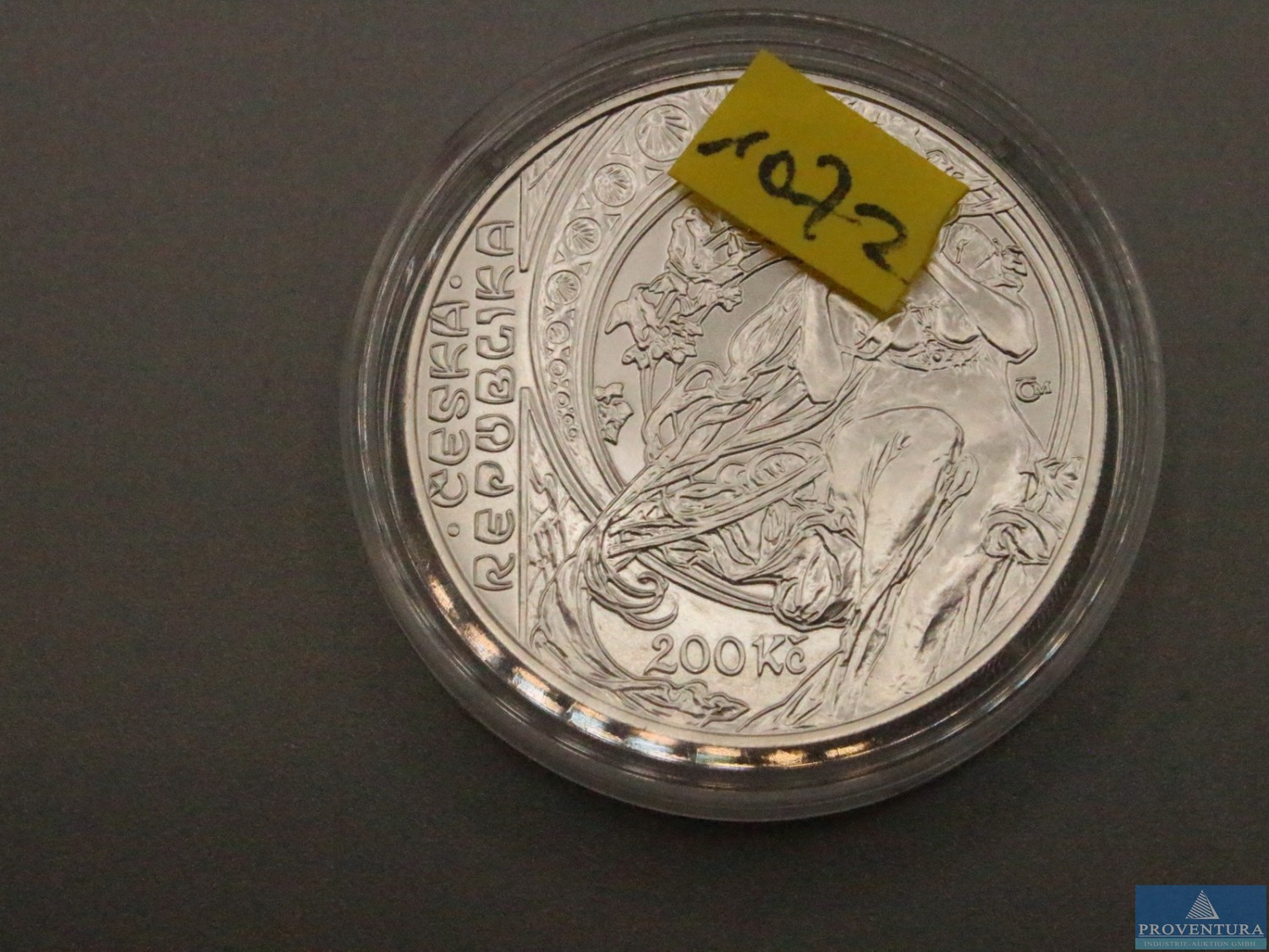 Серебряная монета Чешской Республики 200 корон Alfons Mucha st, серебряная .900 грубый вес 13 гр, KM114, тираж 10 100 штук, инкапсулированна