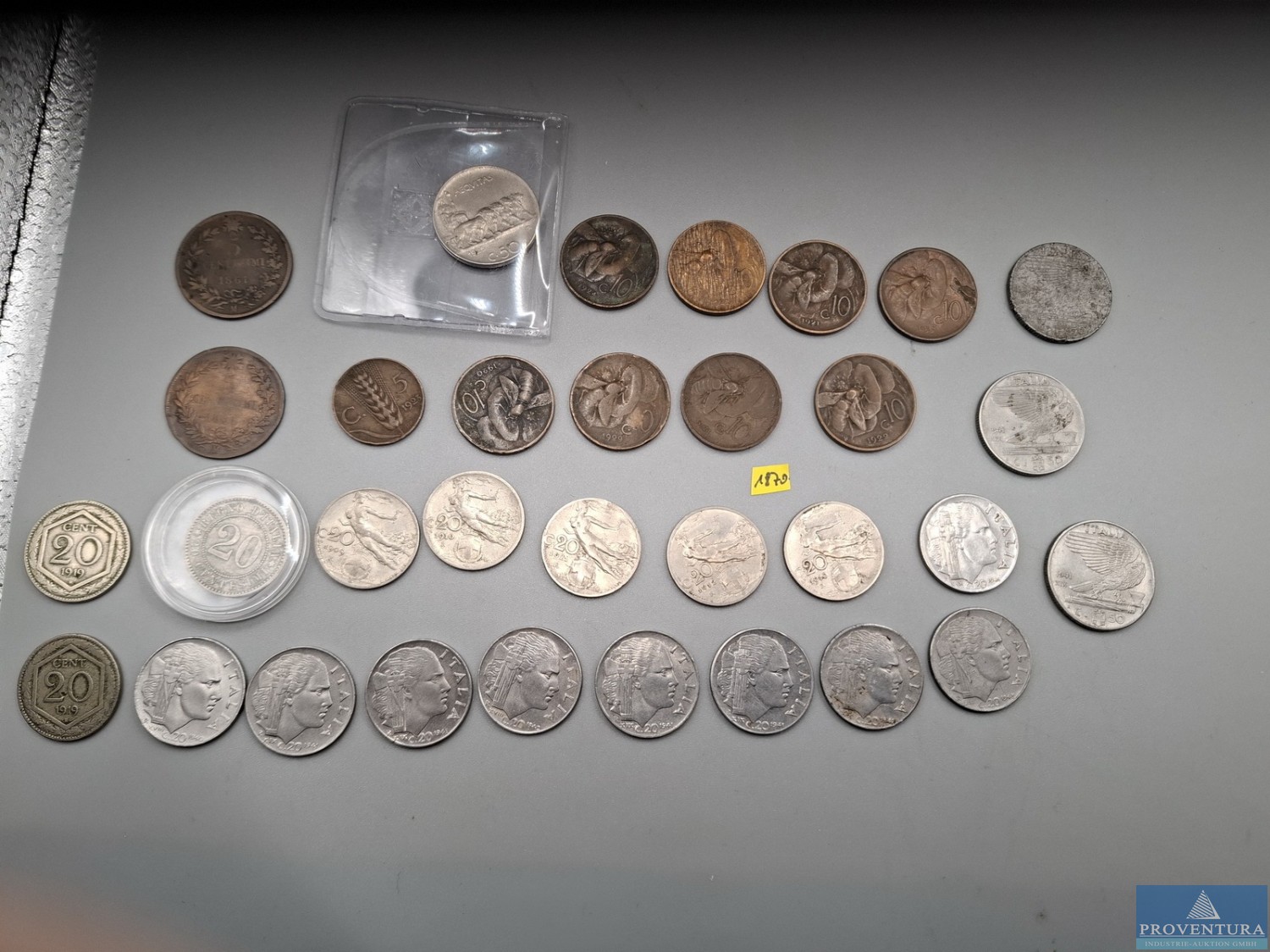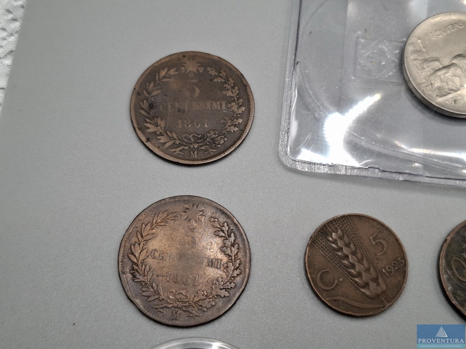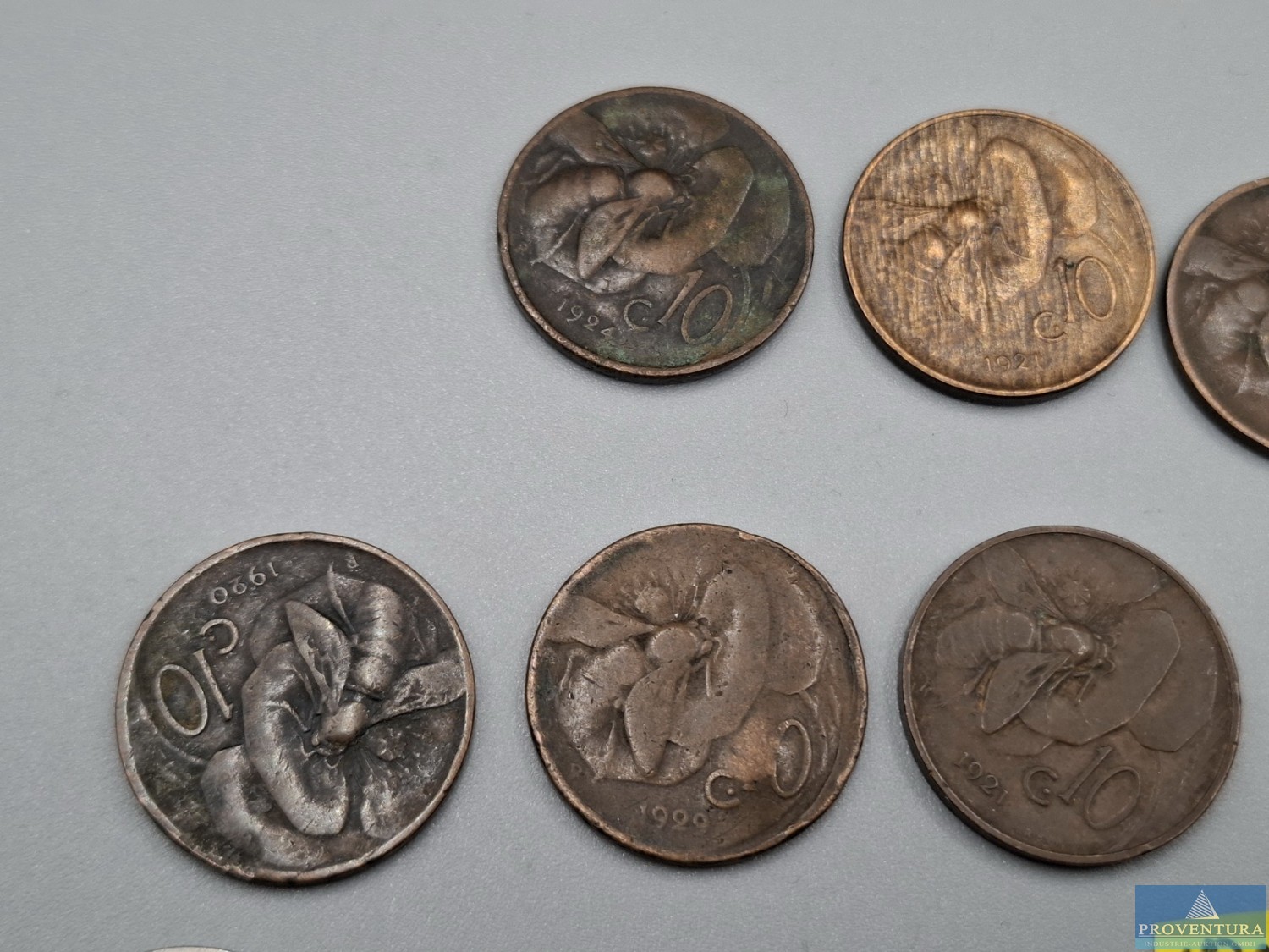 Обращение монет в Италии до 1945 года: 2x 5 центесими 1861M, 1925, 8x 10 центесими пчела 1920-1929, 50 центесими 1925, 3x 50 центесими 1941, 2x 20 центесими 1919, 1x 1894, 8x 1940-1941, 5x 1909-1921, всего около 32 моне