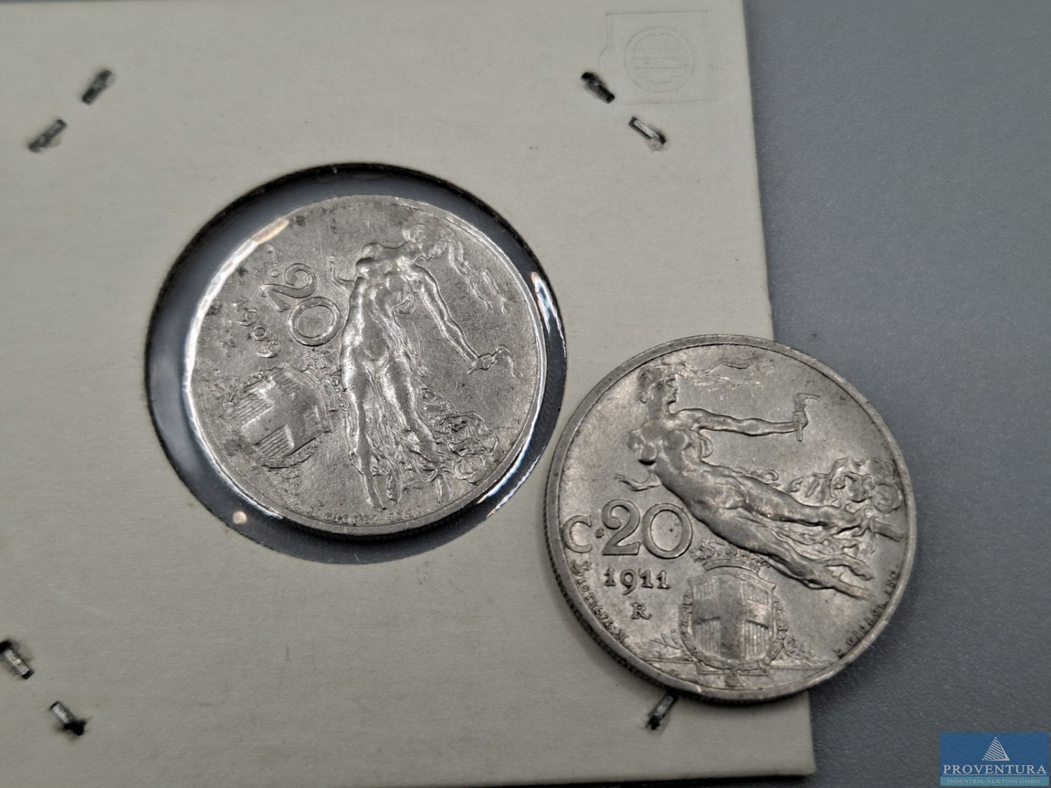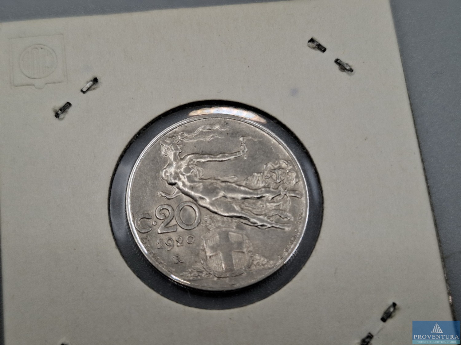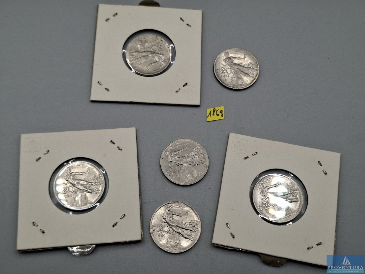 Монеты в обращении: Италия: 20 центезими, 1909, 1911, 1920, 2x 1921, 1922, в основном EF+