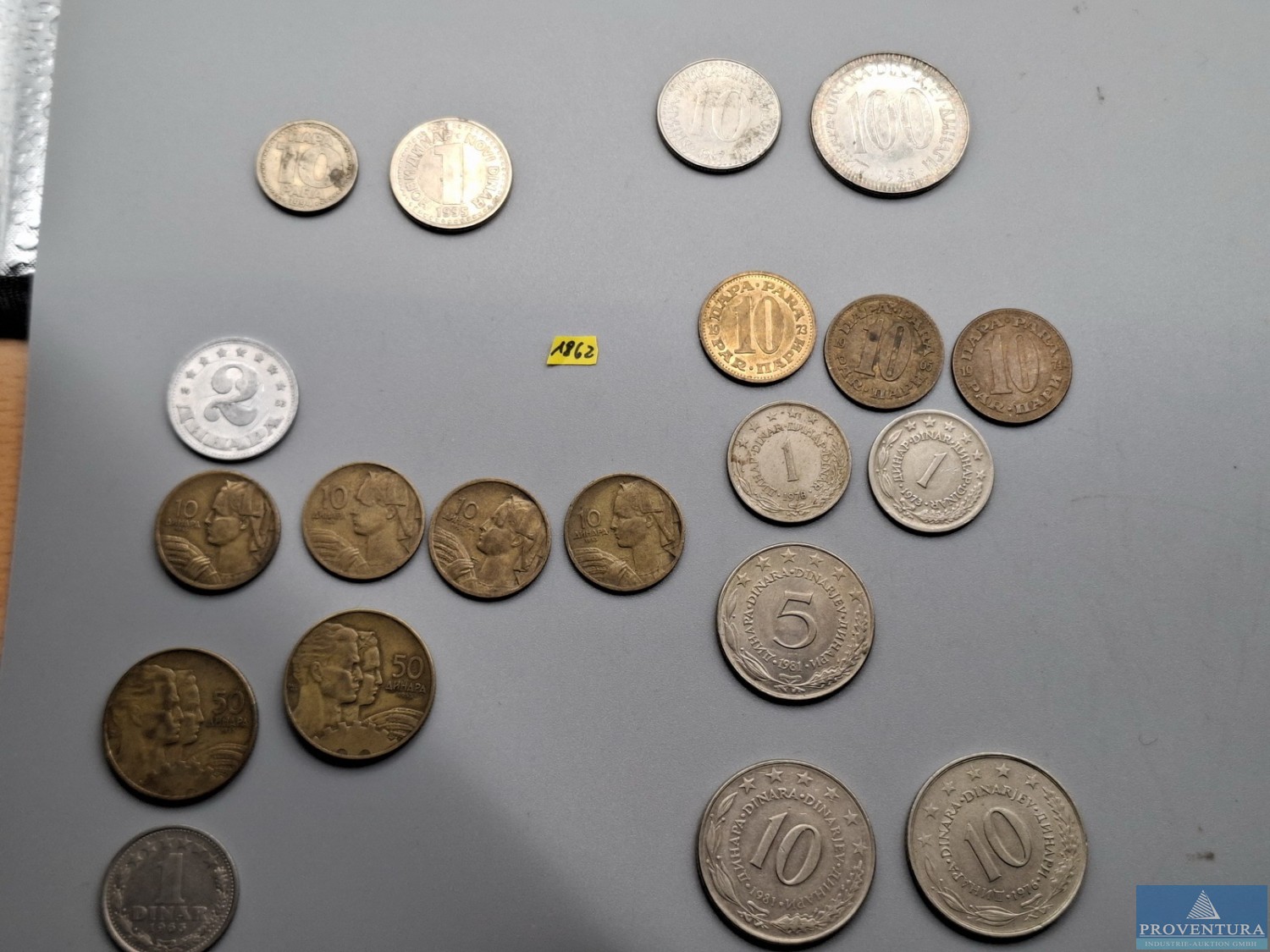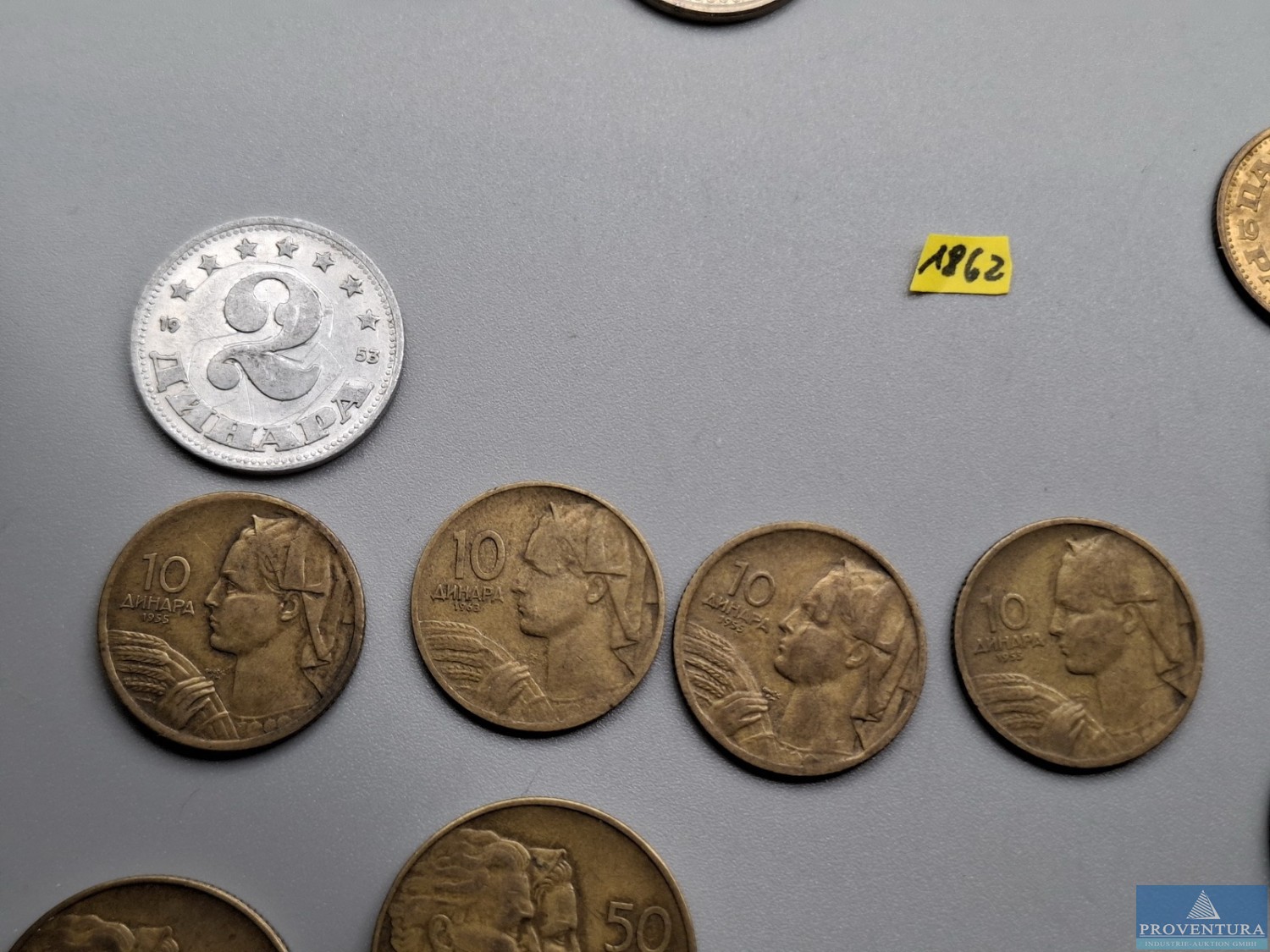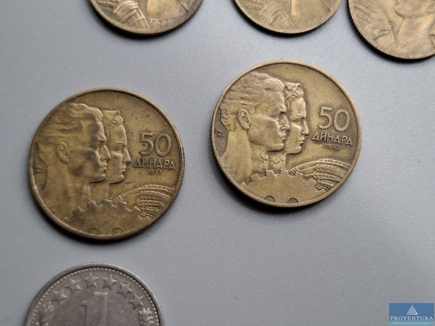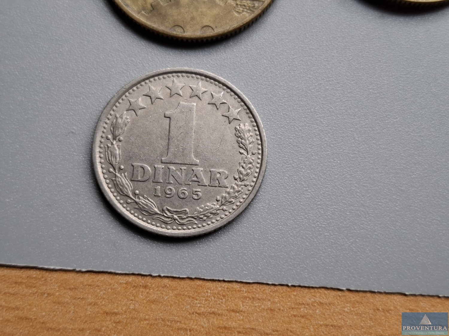 Обращение: монеты Югославии 1938 года — 1 динар, 2 динара, 1955 года — 10 динаров, 20 динаров, 50 динара, 1953 года — 1 динара, 2 динара, 5 динаров, 1963 года — 1 динара, 10 динара, 50 динара, 1965 года — 5 пара — 1 дина