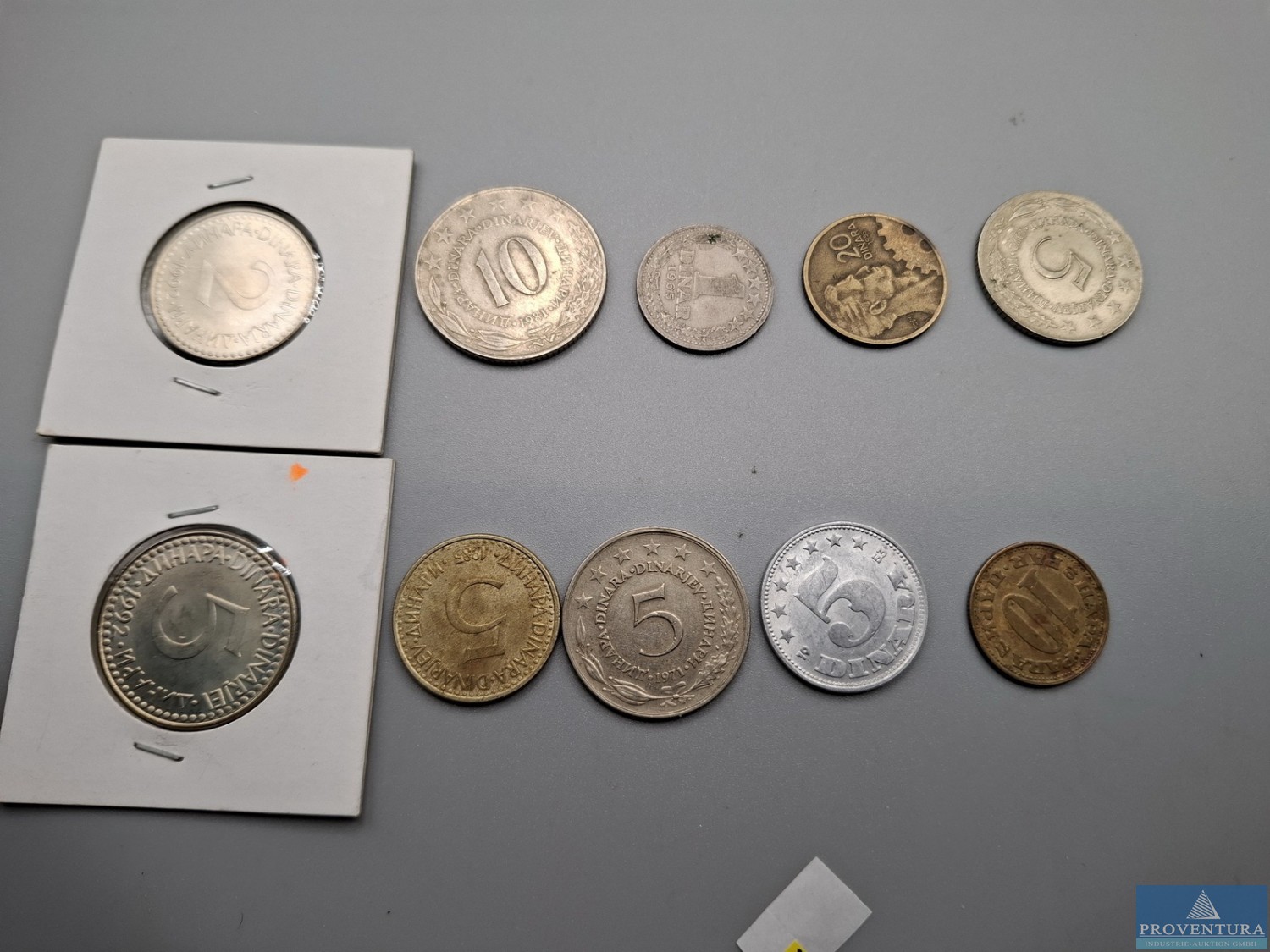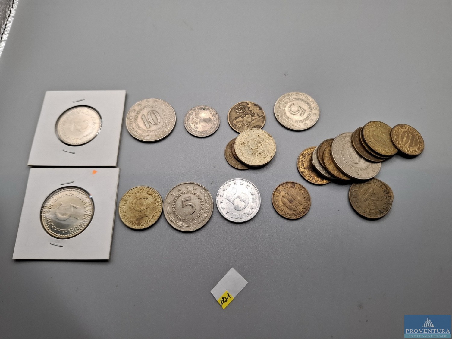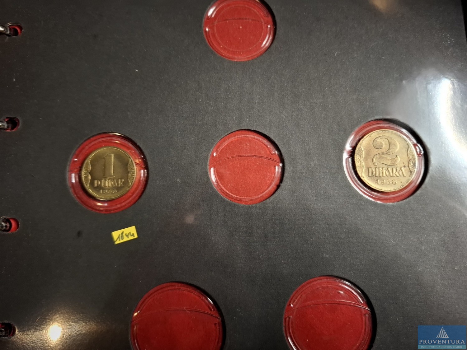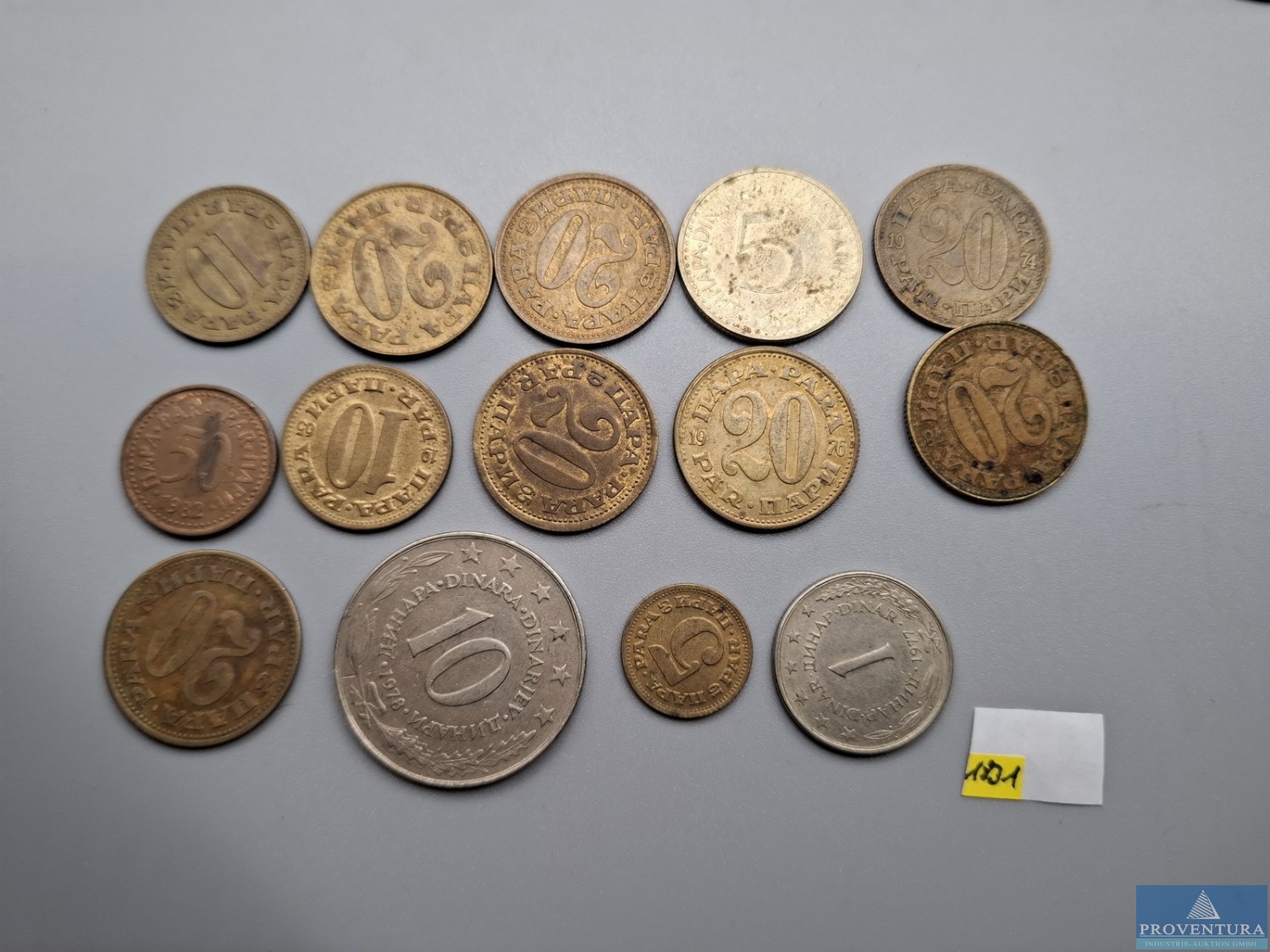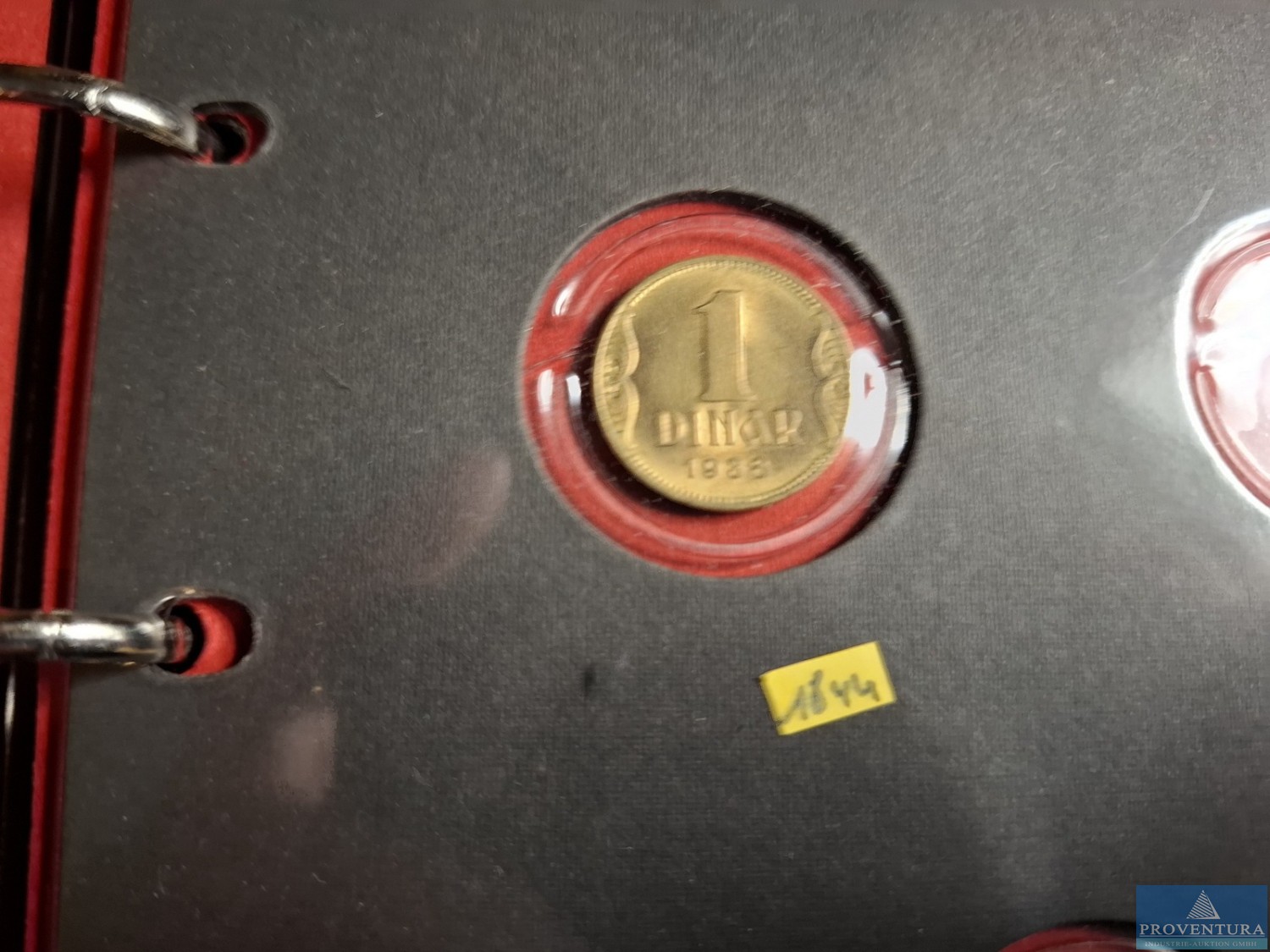 Обращение: монеты Югославии 1938 года — 1 динар, 2 динара, 1955 года — 10 динаров, 20 динаров, 50 динара, 1953 года — 1 динара, 2 динара, 5 динаров, 1963 года — 1 динара, 10 динара, 50 динара, 1965 года — 5 пара — 1 дина