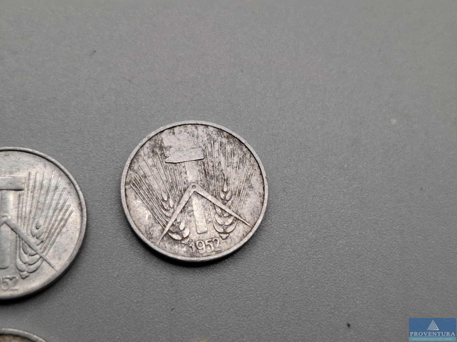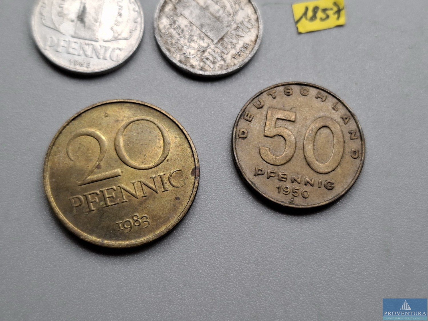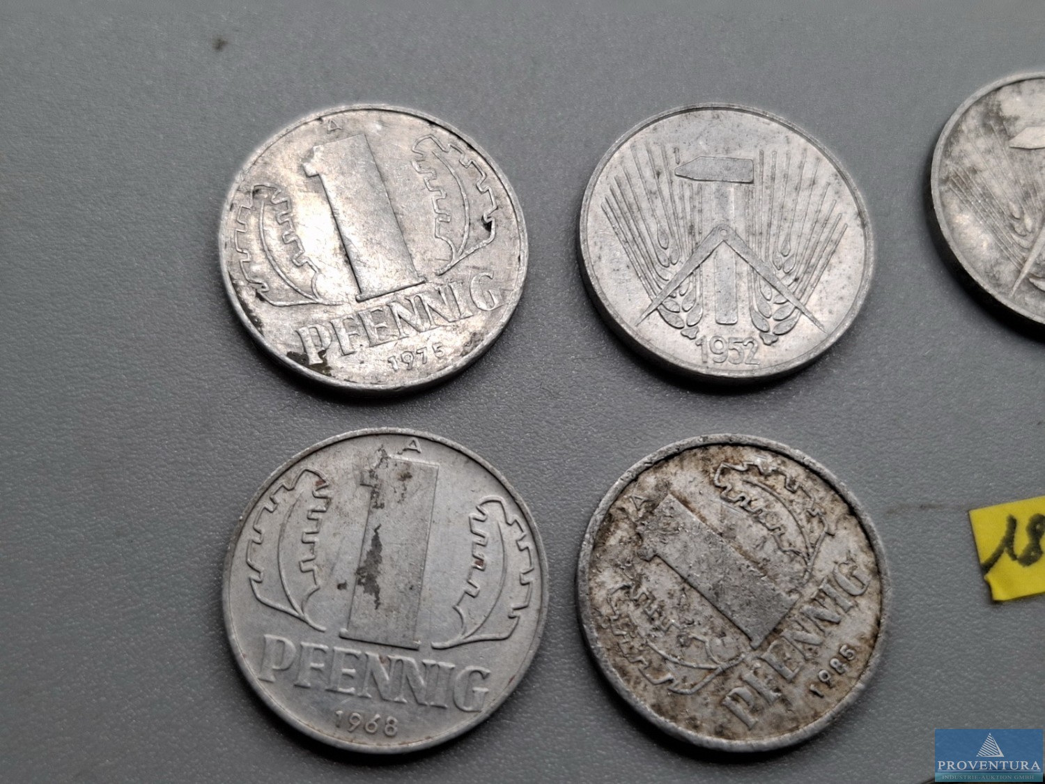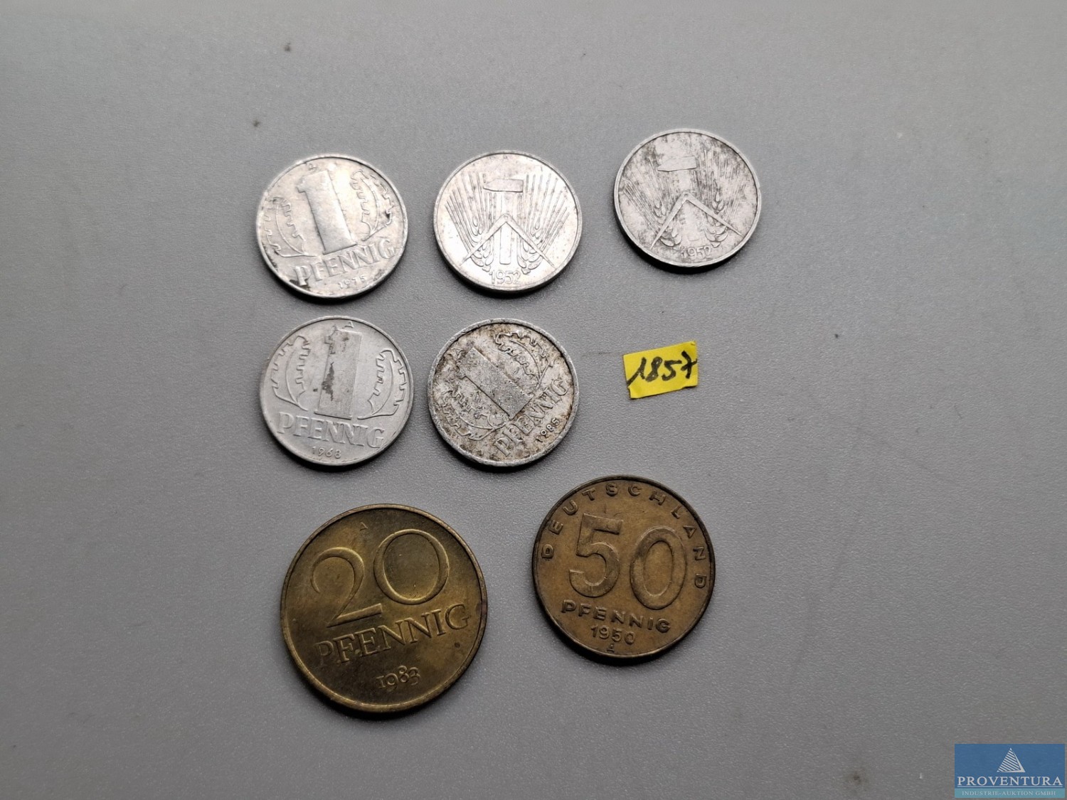 Оборотные монеты: ГДР 50 Пфенниг 1950 А, 1x 20 Пфенниг 1983, 2x1 Пфенниг 1952A, 2x1 Пфенниг 1968 1975
