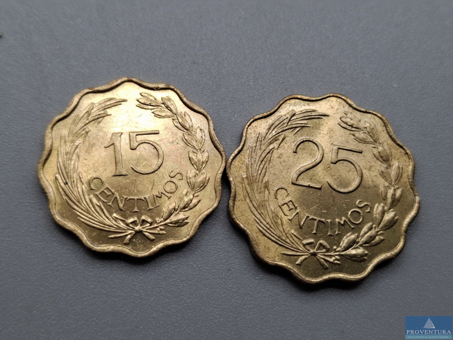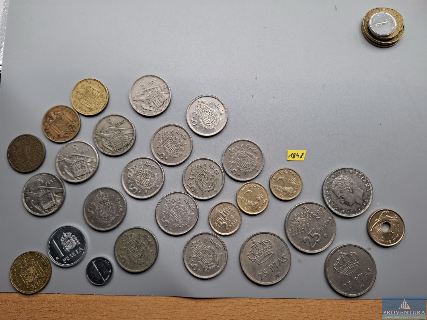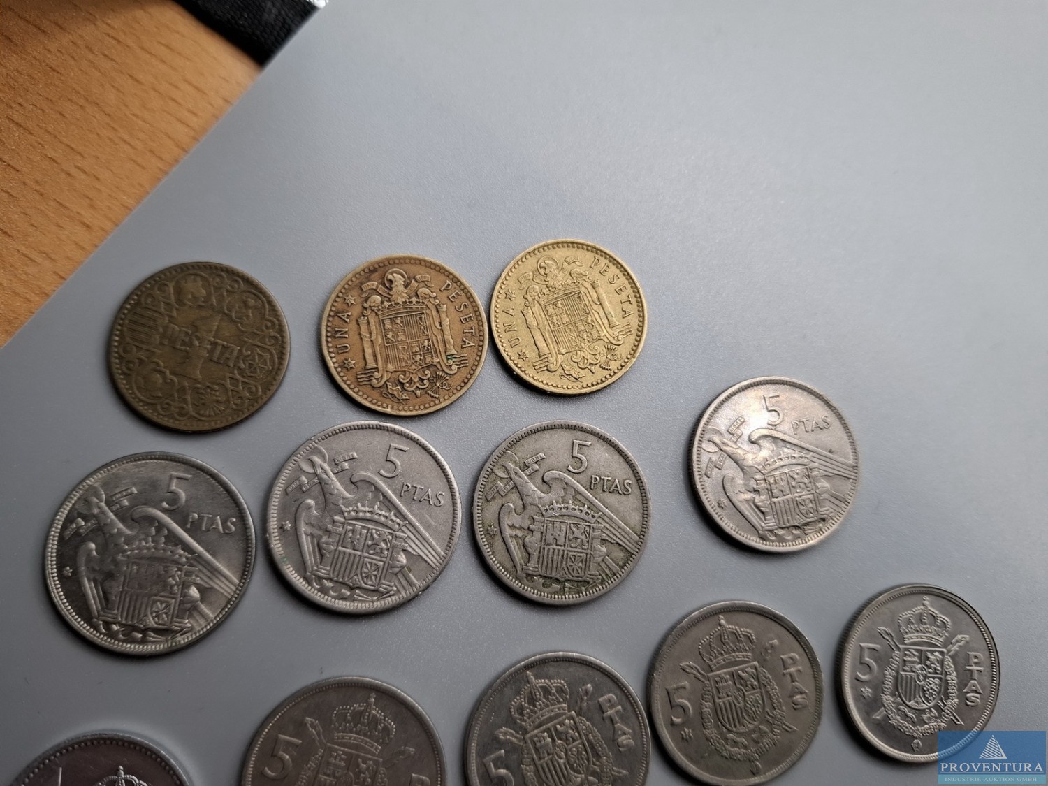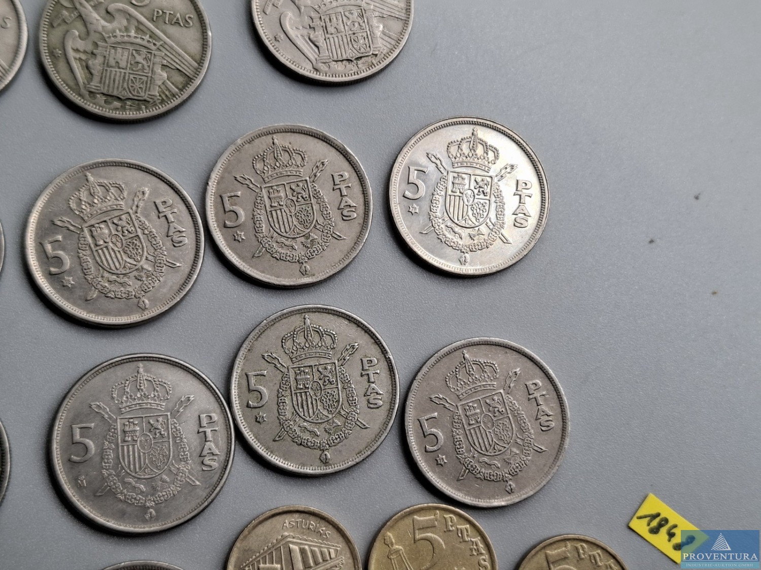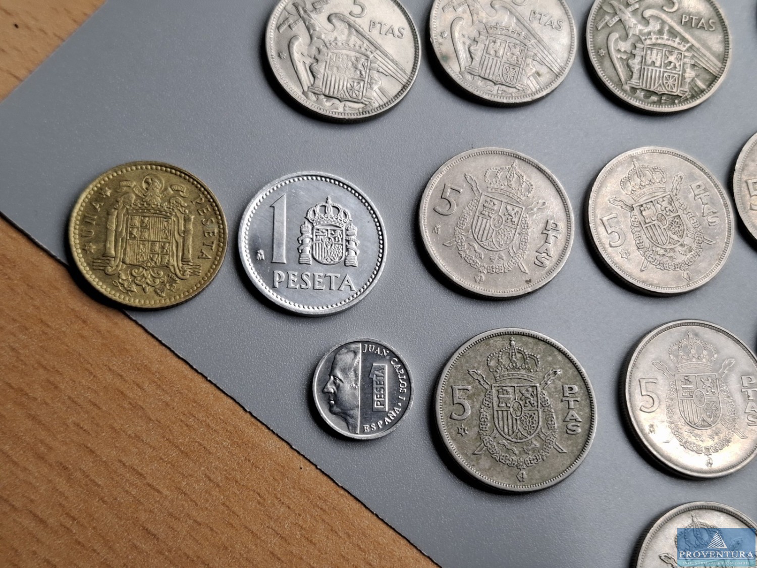 Обращение монет Испания с 1944 года: Франко 4x5 песет, 3x1 песета, Хуан Карлос 5x25 песет, 12x5 песет, 3x1 песета.