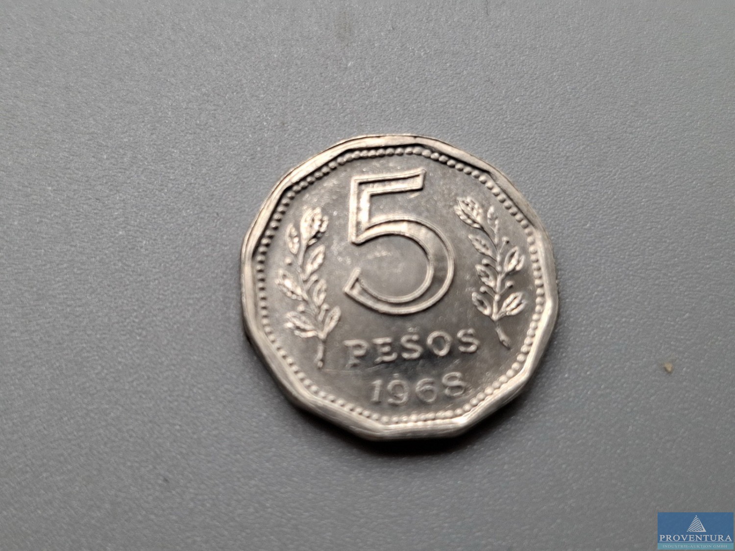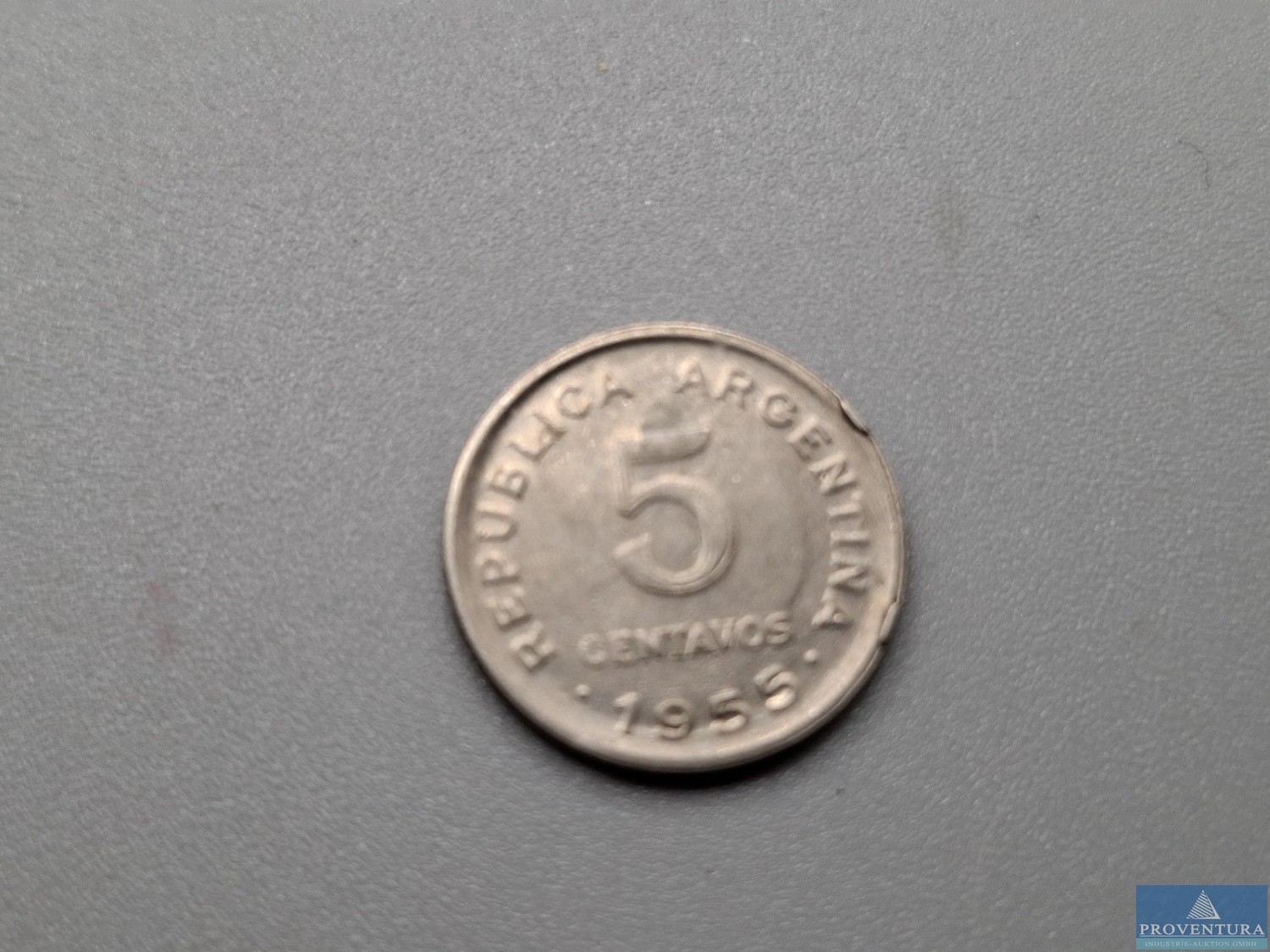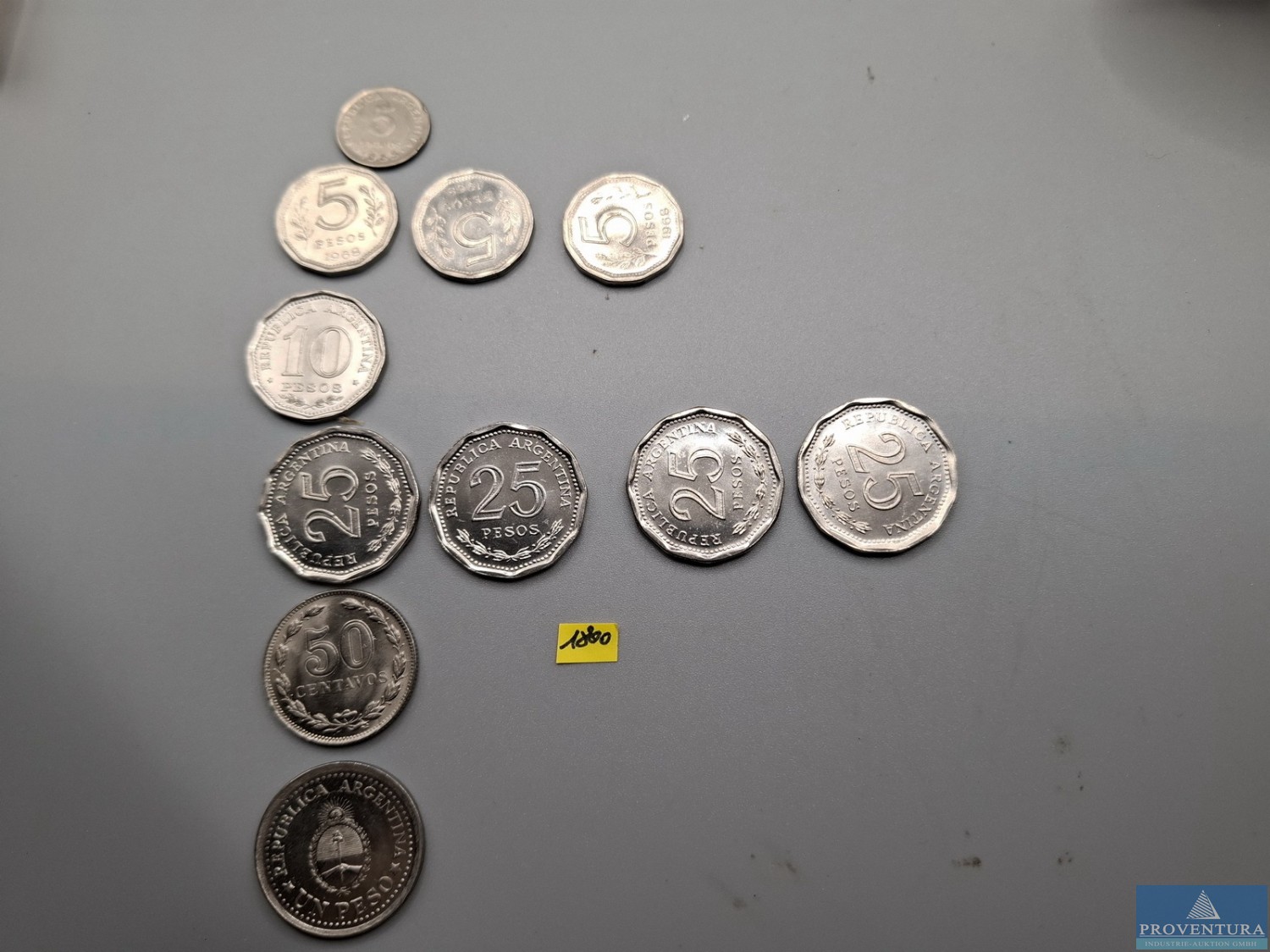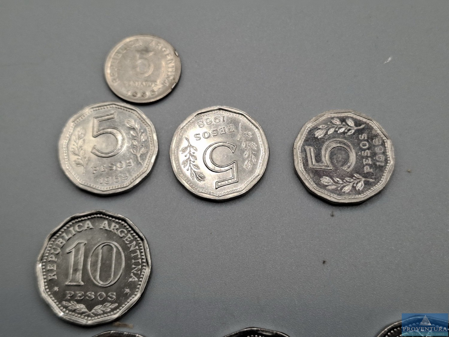 Оборотные монеты Аргентины с 1955 года: 4x 25 песо, 1x 10 песо, 3x 5 песо, 1x 1 песо, 1x 50 сентаво, 1x 5 сентав