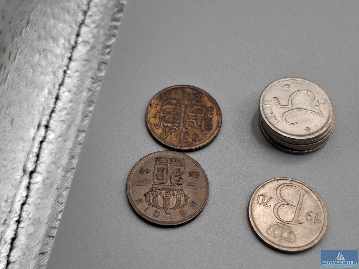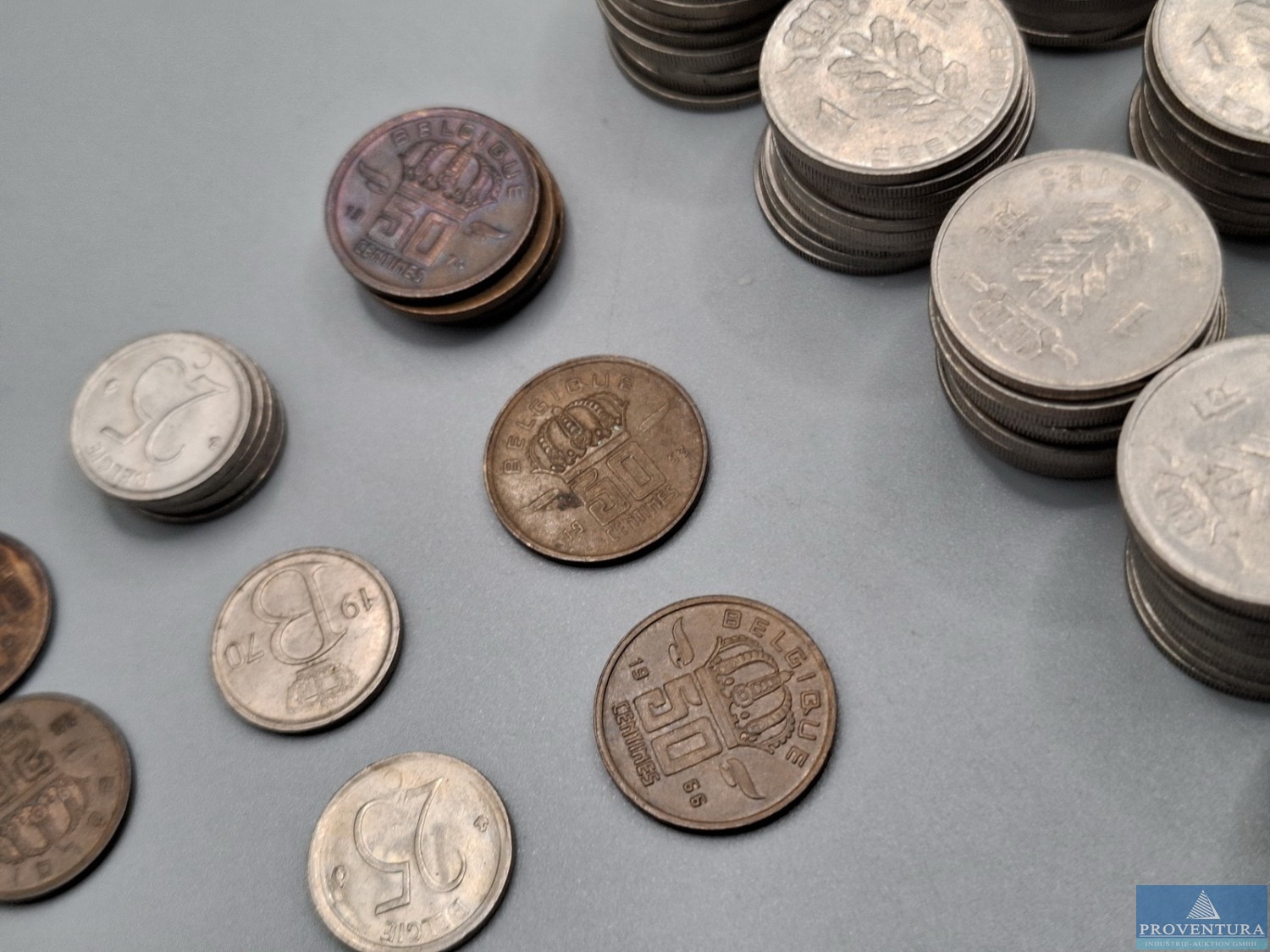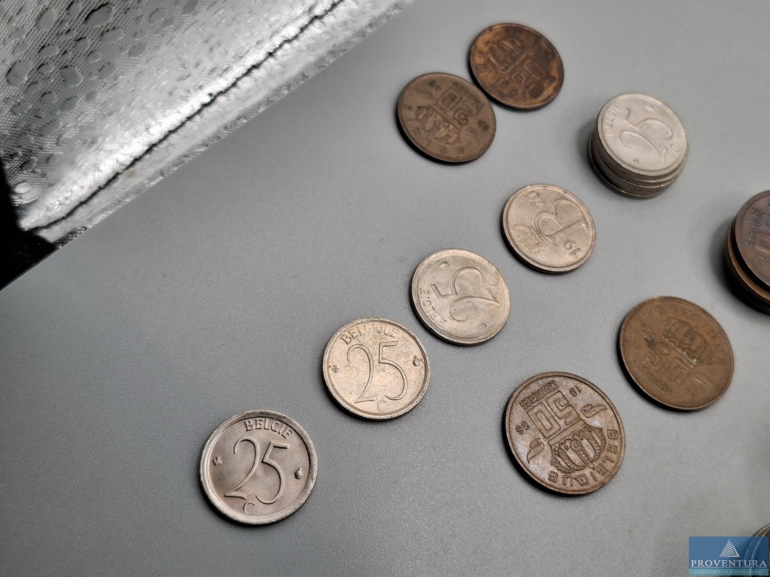 Монеты обращения в Бельгии с 1950 года: 2x 20 сантимов, 9x 25 сантимов. 7x 50 сантимов, 95x 1 франк 1950-1988, 5x 1 франк 1989-1993, 1x 1 франк 1994, 50x 5 франков 1950-1988, 10x 5 франков 1989-1993, 1x 5 франков 1998, 13x 10 франков, 1x 20 франков, всего 194 штук