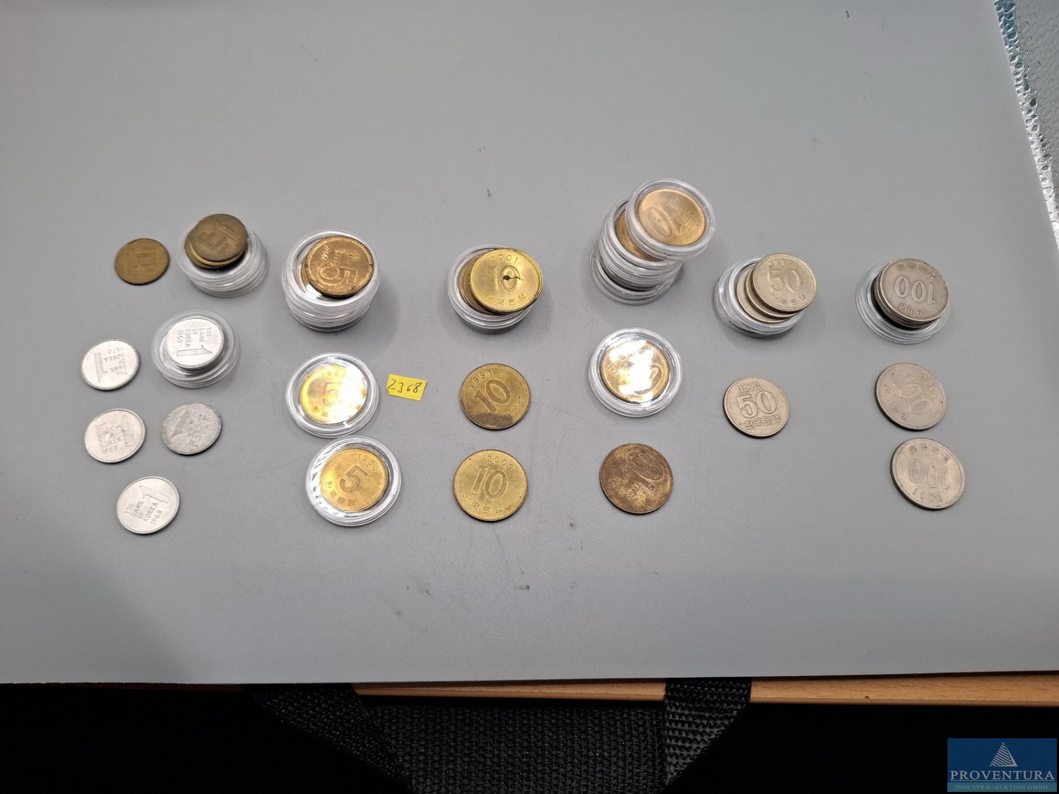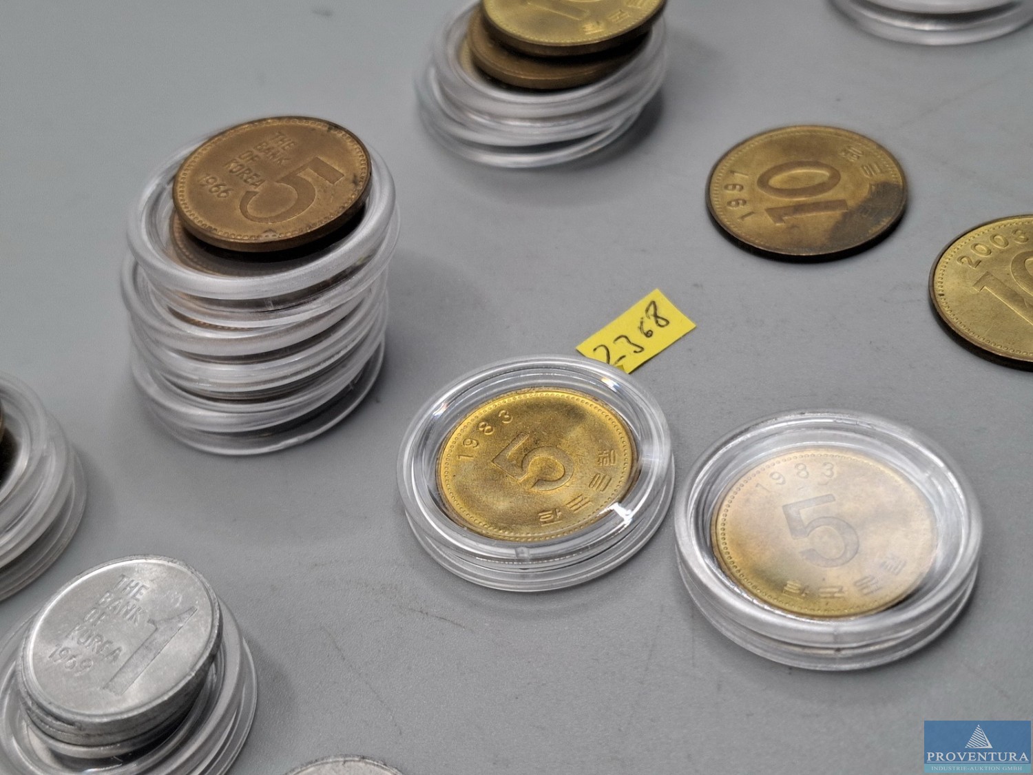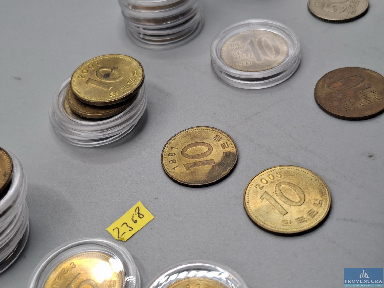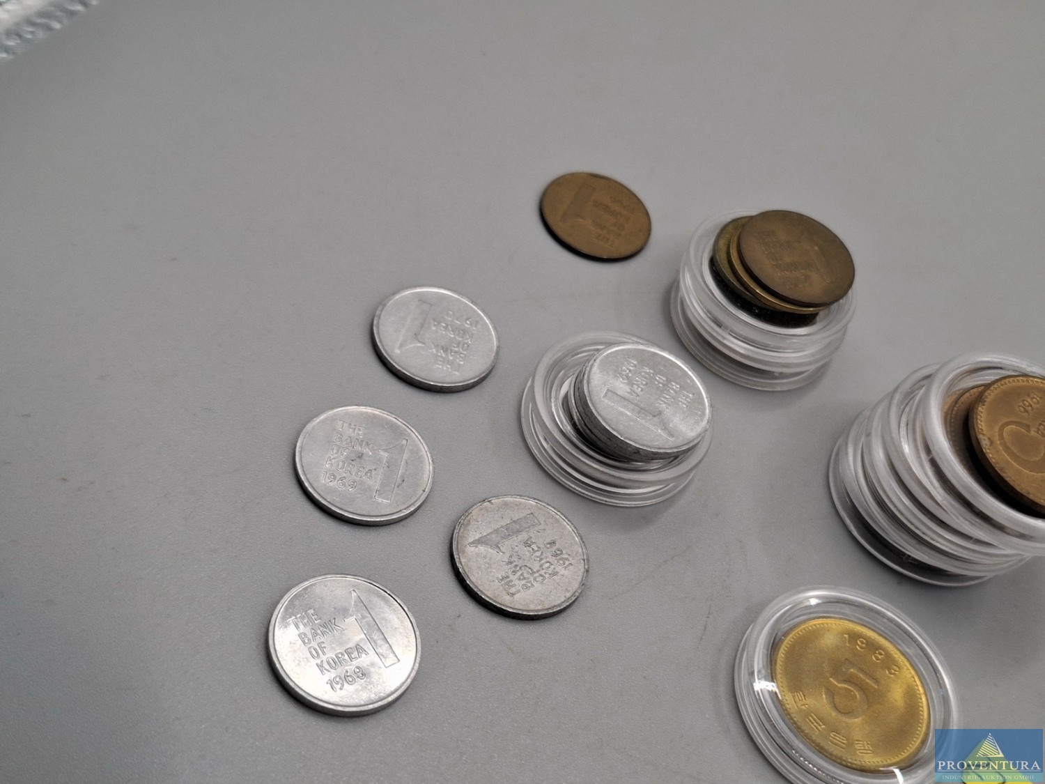 Монеты обращения: южнокорейская 15x 1 вон, 12x 5 вон, 19x 10 вон, 6x 50 вон, 7x 100 вон, примерно 59 моне