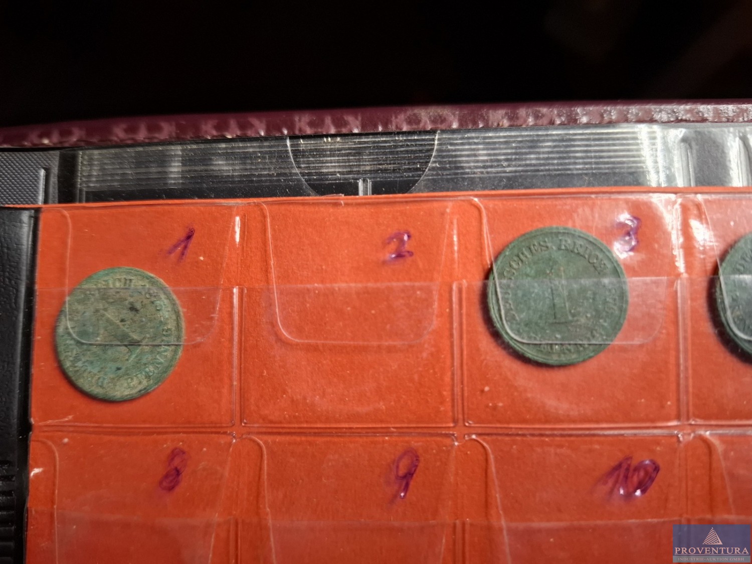 Оборотные монеты Германской империи 153 монеты в альбоме 1875-1942, 1875-1889 6x 1 пфенниг, 3x 2 пфенниг, 1890-1914 29x 1 пфенниг, 4x2 пфенниг, 1917, 1919-1922 7x 50 пфенниг, 1923 10x 200 марки D, 1924 Рентенпфенниг 4x 5 пфенниг, 5x 10 пфенниг, 1x 50 пфенниг 1924A, 1924-1936 Рейхспфенниг 6x 1 пфенниг, 1x 2 пфенниг, 3x 5 пфенниг, 7x 10 пфенниг, 1936-1940 HK 51x 1 Pfennig, 10x2 Pfennig, 4x5 Pfennig, 1940-1942 HK Zink 2x 1 Pfennig, 2x5 Pfennig. Продажа согласно § 86 StGB / Раздел 3