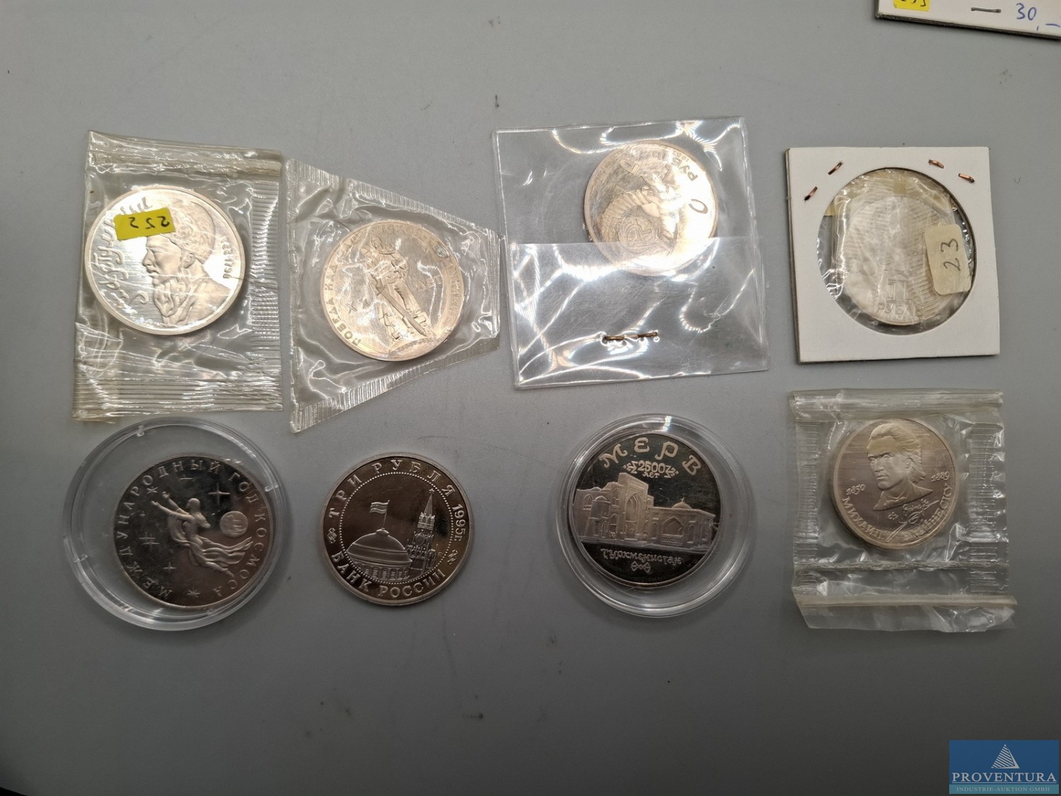 Оборот монет СССР 4x1 рубль 1x3 рубля Россия 2x 3 рубли 1x 5 рублей всё pp, СССР 1 рубль 1991 стр. Магтымгулы Пирагия Y283, 1965 20-летие конца войны Y135, 1987 175-летие битвы при Бородине Y203, 1985 Всемирный фестиваль Y199, 1989 Y233, Россия 3 рубля 1995 год космоса Y297, 50-летие завоевания Кёнигсберга Y380, Туркменистан 5 рублей 1993, 5 рублей 1993 Троице-Сергиева-Лавра Y324, всего 8 моне