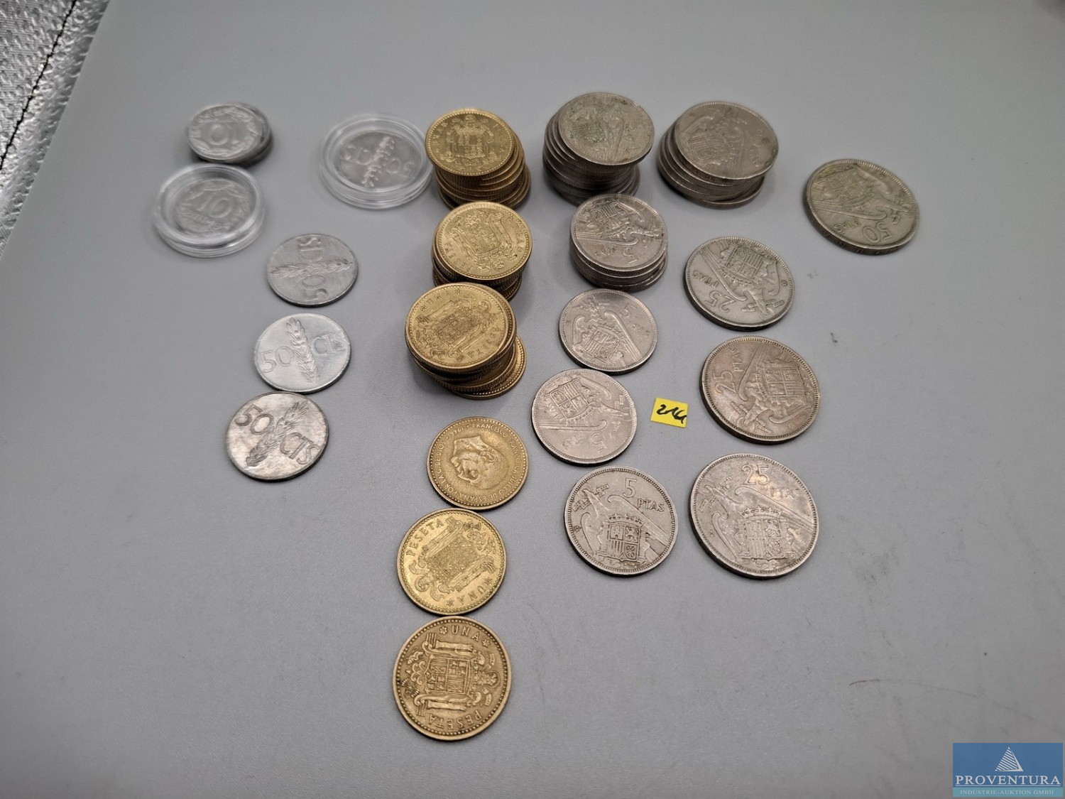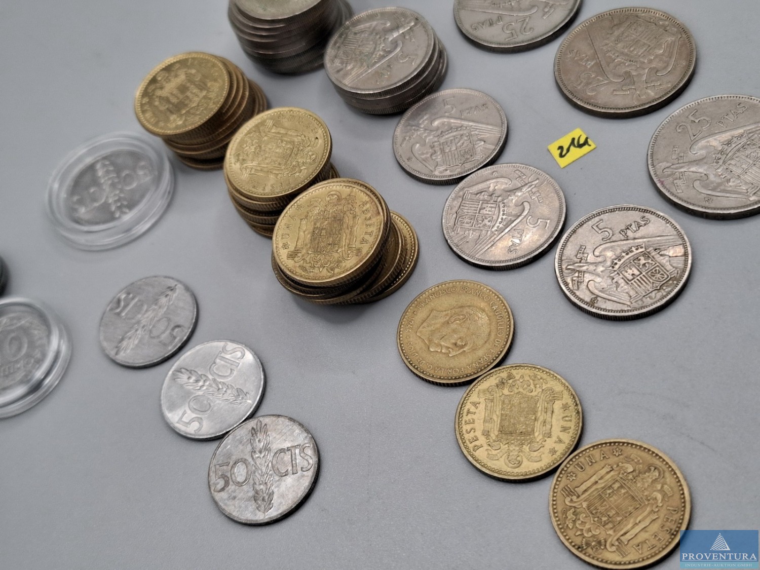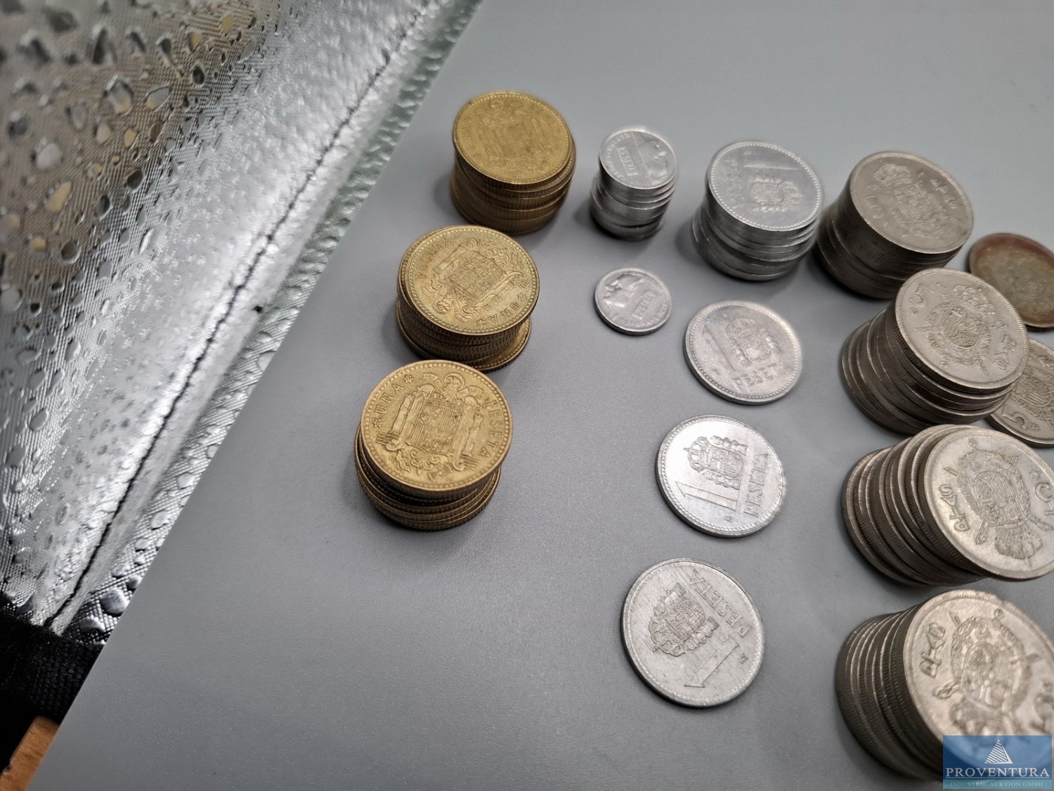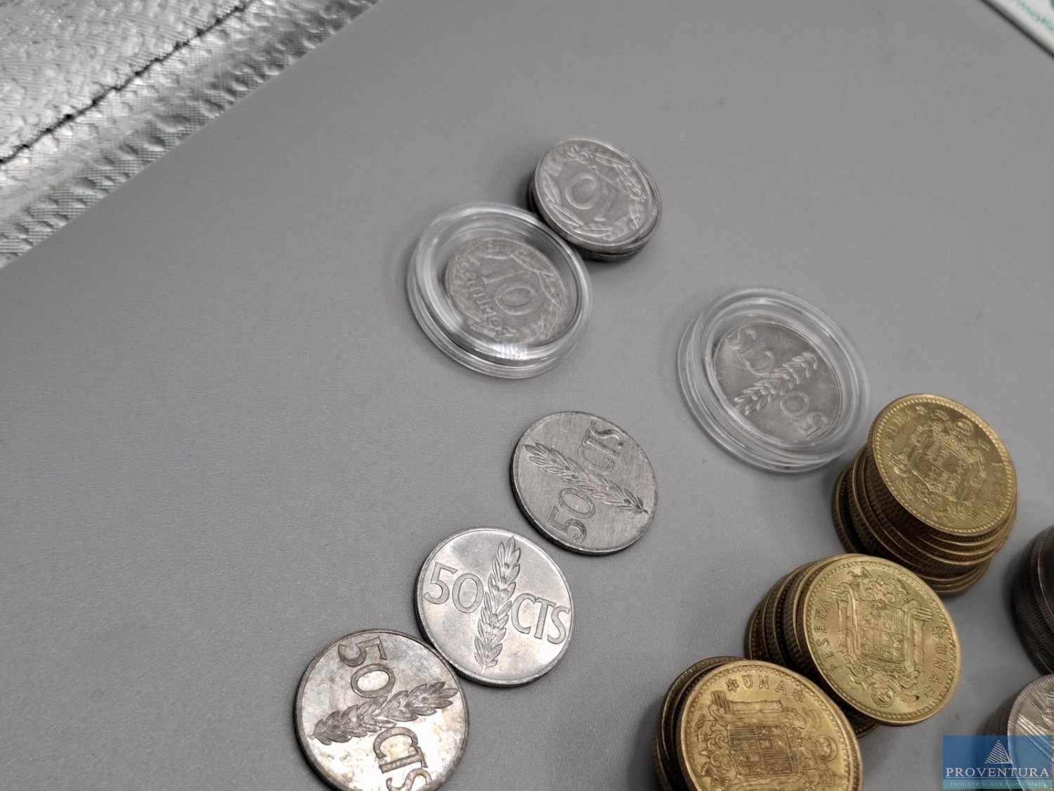 Обращение монет: Испания: Хуан Карлос с 1975 года — 39x 1 песета, 76x 5 песет, 1x 10 песет, 23x 25 песет, 2x 50 песет, 3x 100 песет, PTA 1 404,-, всего около 144 моне