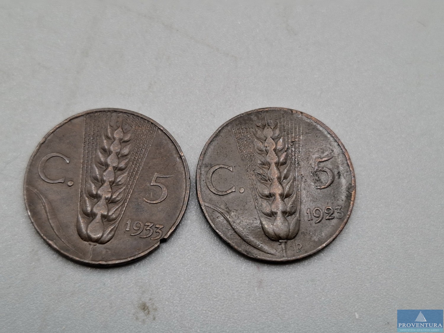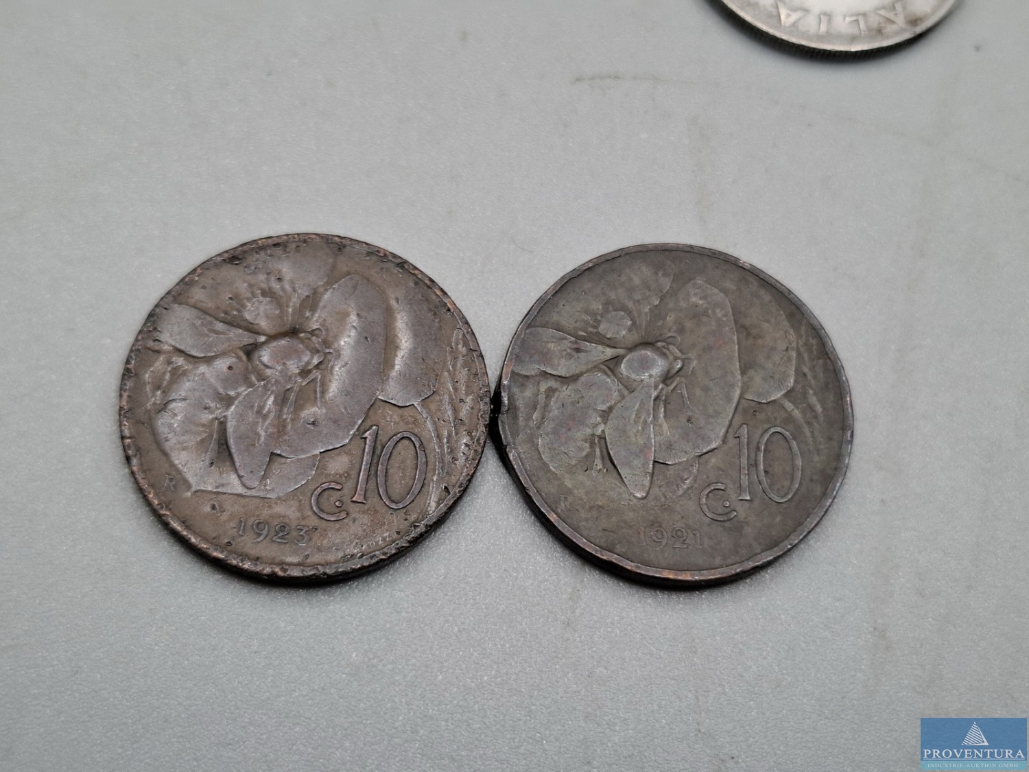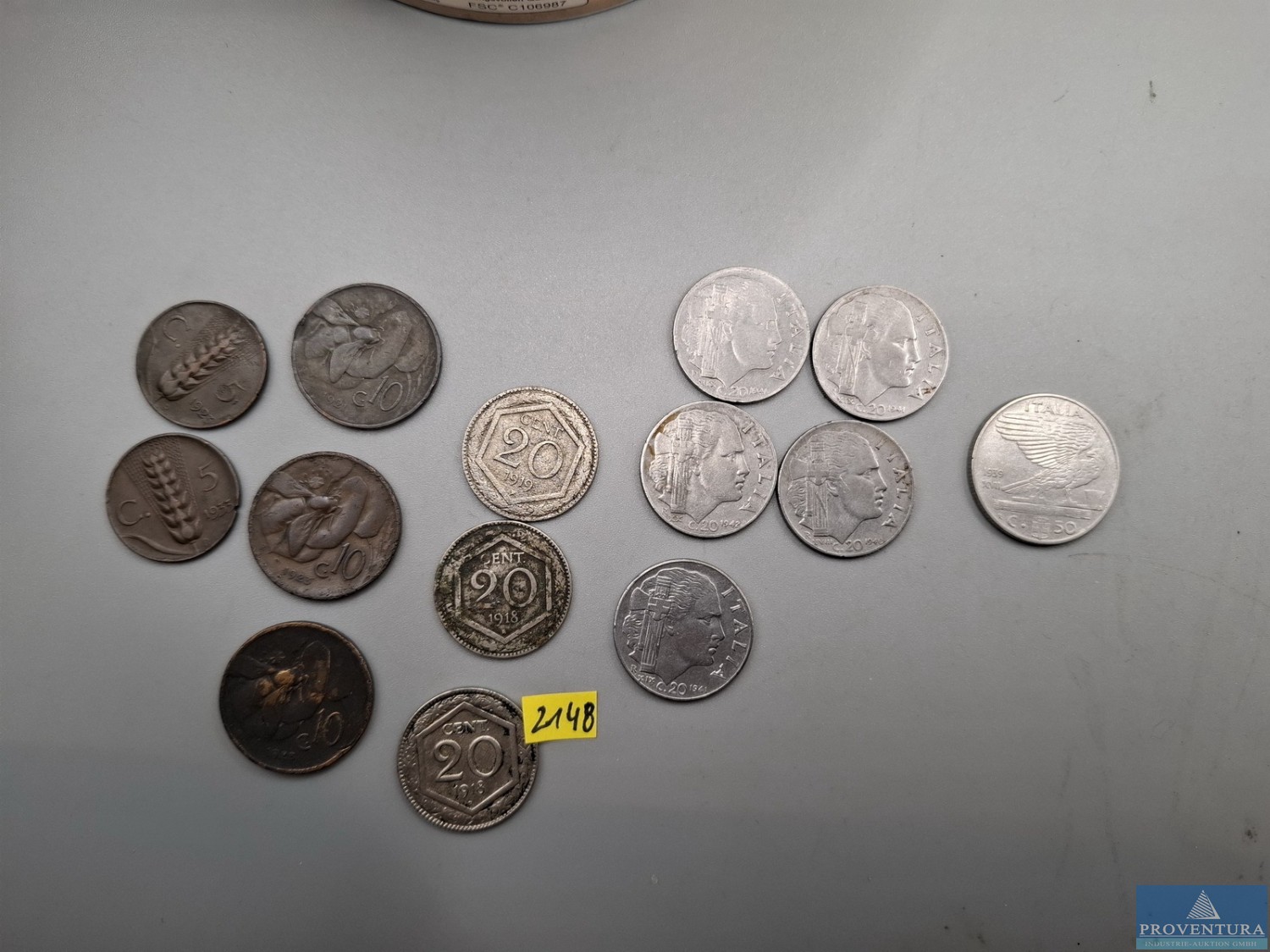 Монеты в обращении в Италии до 1944 года: 5 центесими 1923, 1933, 10 центесими 1921, 2x 1923, 20 центесими 2x 1918, 1919, 1940, 3x 1941, 1942, 50 центесими 1939, всего около 14 моне