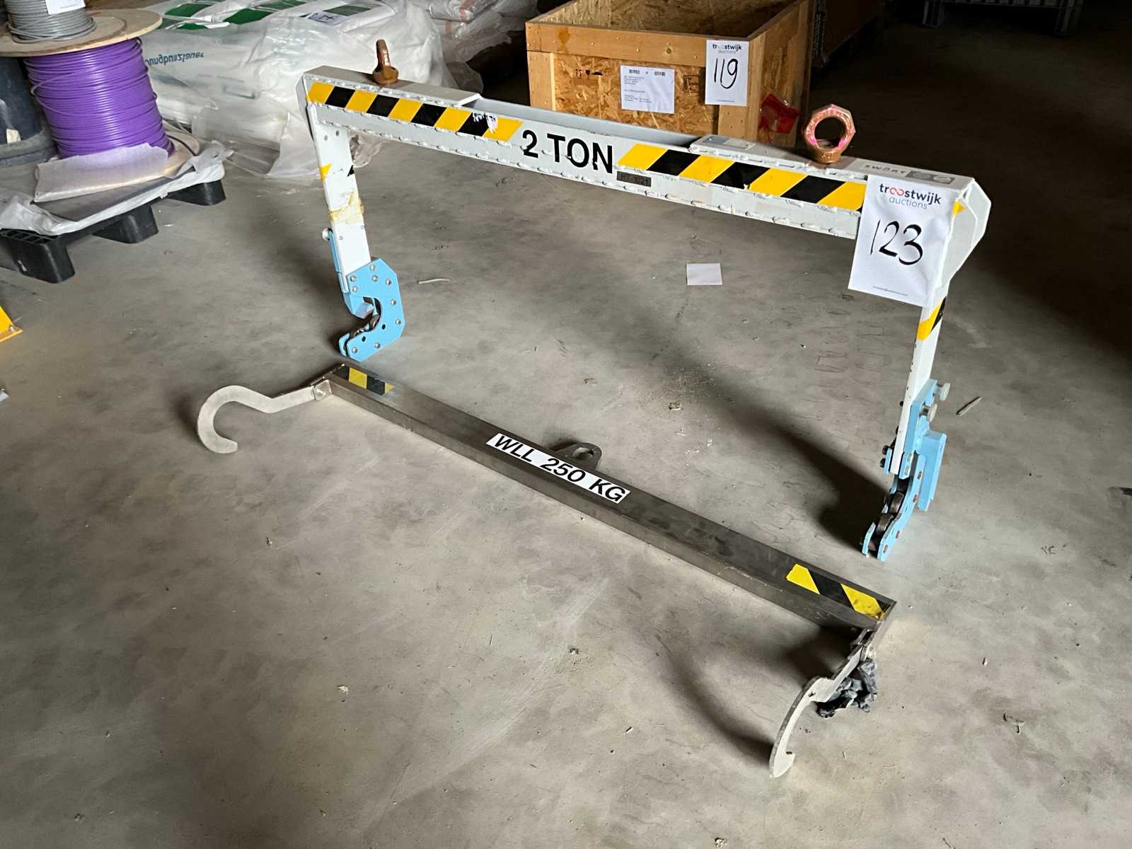 1x stainless steel lifting beam, capacity 250 kilograms, width 1600 millimetres, 1x lifting beam, capacity 2000 kilograms, width 1660 millimetres. Auction-ID: A1-43459-123