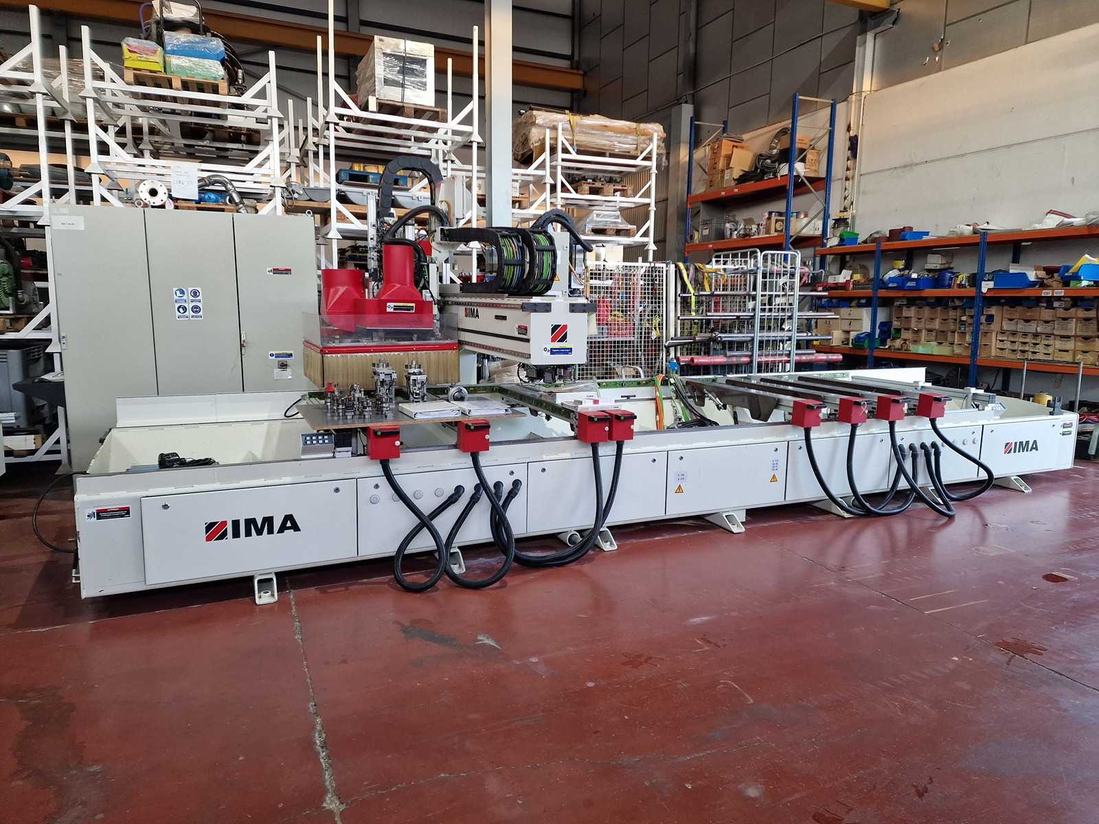 - Usable working area approx. 5000 x 1400 mm. - Axis C. - Tool magazine with 18 positions. - Electrospindle: power 7.50 KW, automatic tool change, for HSK F63 tool holder. - Vertical holes in the x-axis direction: 11. - Vertical holes in the y-axis direction: 11. - Horizontal holes in the x-axis direction: 1 + 1. - Horizontal holes in the y-axis direction: 1 + 1. - Edging unit with edge loader for 2 coils. - IMA numerical control. - 8 benches. - Lifting modules for heavy parts. - SIEMENS 2BL1100-2NC00-1S-Z vacuum pump, 2.35 KW motor. - Tools (10) and add-ons (3) that appear in the photographs are included. - Operating conditions of this machine: unchecked. - This item is delivered loaded by truck. The costs of dismantling and loading are those that are specified as additional costs. Auction-ID: A7-44536-18
