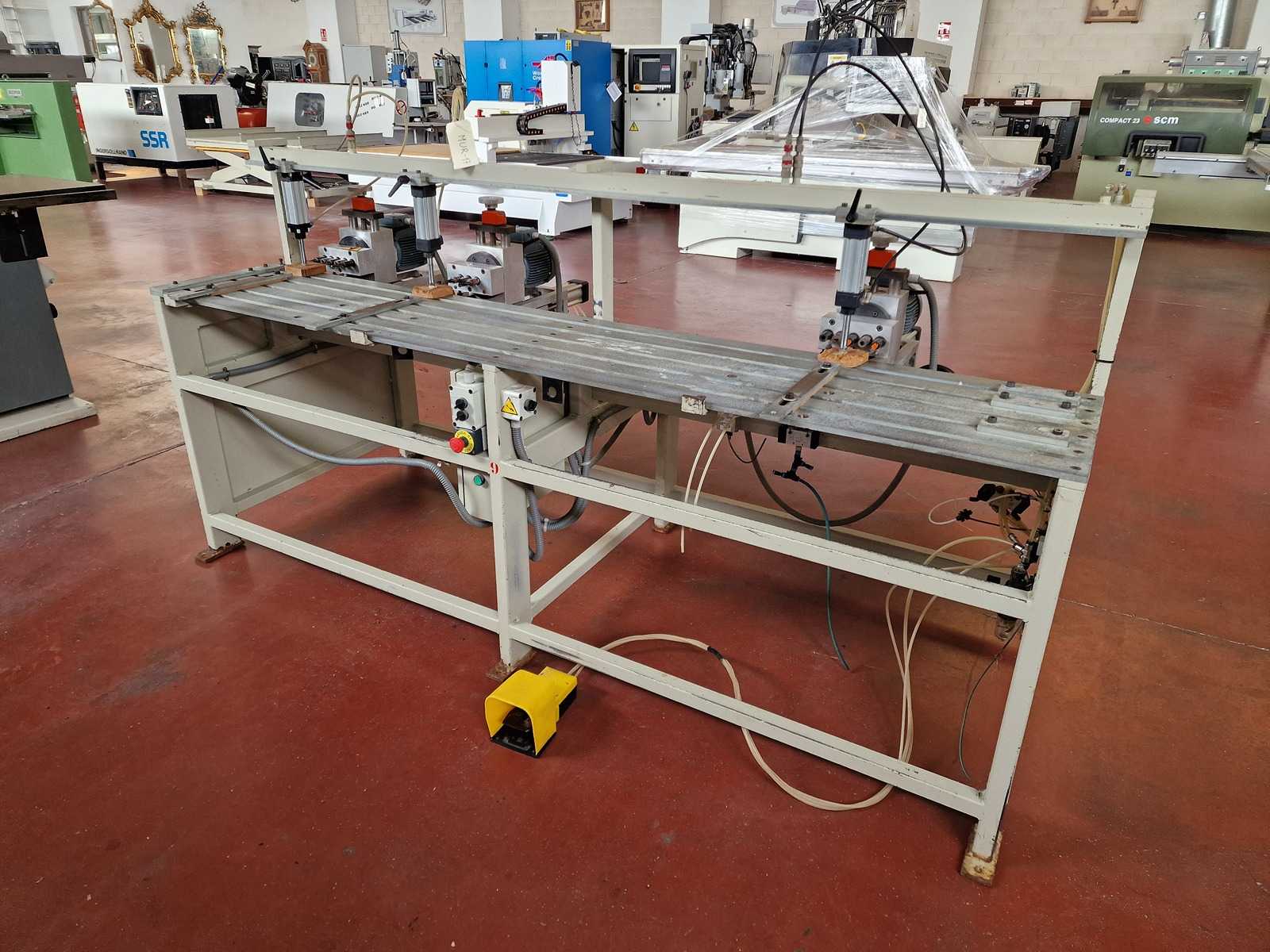 - Table dimensions approx. 2500 x 500 mm. - 2 x Side Horizontal Heads: 1.50 KW-2815 rpm motors, 5 bits 32mm apart. - 1 x Central Horizontal Head: 1.50 KW-2815 rpm motor, 3 x 32mm separated drill bits. - 3 vertical pneumatic grippers. - Pedal operation. - Operating conditions of this machine: unchecked. - This item is delivered loaded by truck. The costs of dismantling and loading are those that are specified as additional costs. Auction-ID: A7-44536-31