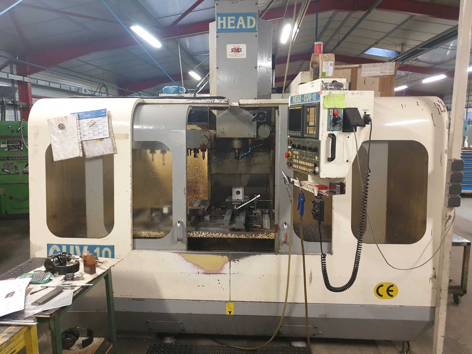Manufacturer: HEAD / KENTModel: CUV-10 (KMV 10)Year: 1999Robust CNC vertical machining center, Meehanite cast iron construction, suitable for machining single parts and small to medium series.Numerical control: FANUC OMDStructure: Meehanite cast ironTurcite B-coated slidesRigid threadPortable electronic crankFull protective guardSprinkler systemWork light and end-of-cycle lampToolboxRaces:X: 1,020 mmY: 510 mmZ: 510 mmDistance between spindle nose and table: 105 to 740 mmTable: Dimensions: 1,200 × 600 mmT-slots: 18 mm – 3 groovesMax. permissible load: 1,000 kgSpindle:Speed: 30 – 7,500 rpmTransmission: ZF gearbox – 2 rangesCone: BT 40Engine power: 11 kWFeeds:Fast feed (X,Y,Z): 24 m/minWorking feed: 1 – 10,000 mm/min Toolchanger: Capacity: 20 toolsMax. tool weight: 6 kgBidirectional selectionMachine dimensions: 2,880 × 2,420 × 2,980 mmFloor space required: 4,000 × 3,000 mmNet we ...