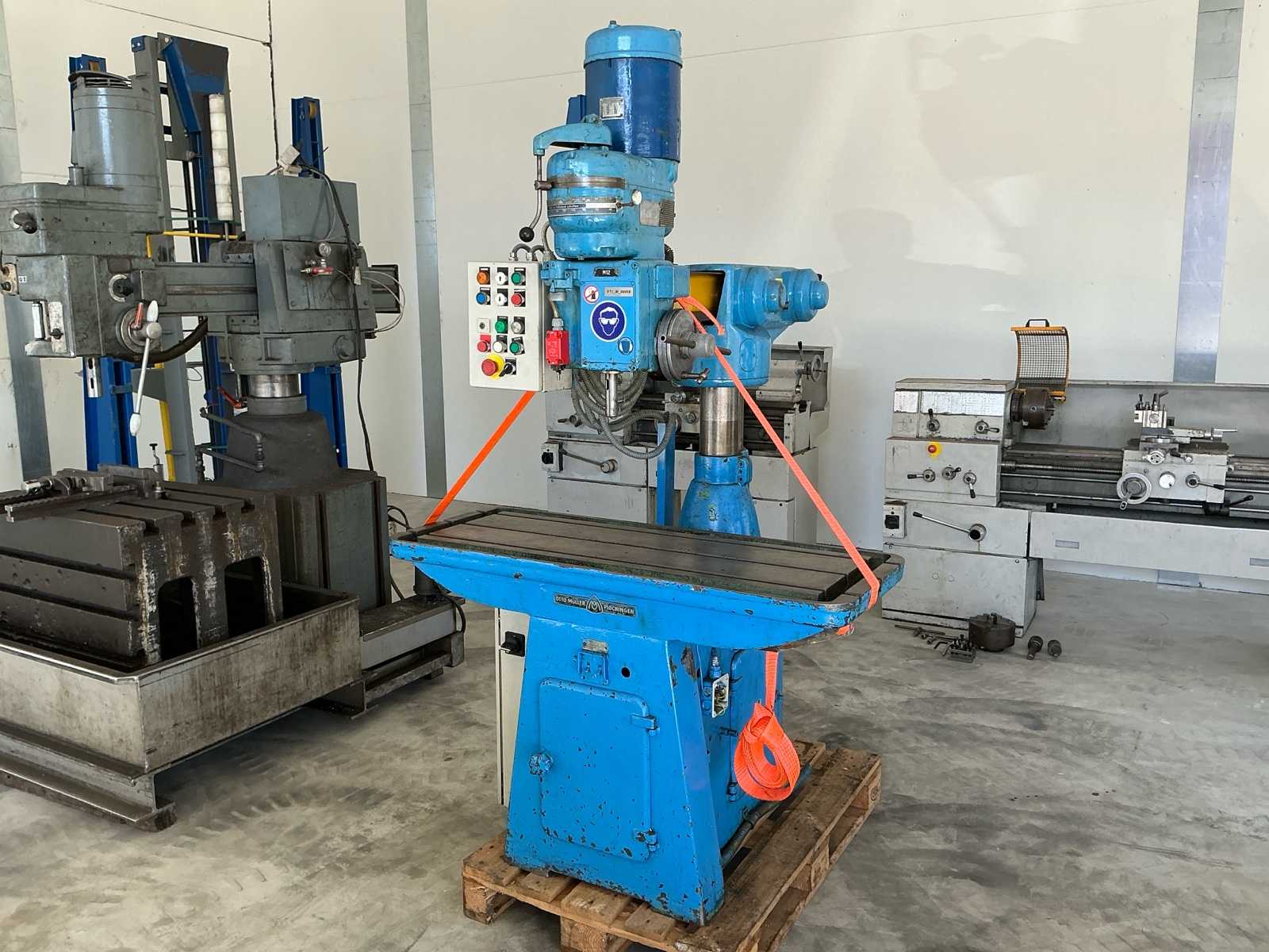 Equipped with: Otto Müller, M12, fast radial drilling machine, connection: 380 V – 50 Hz, mechanically switched speed, radially adjustable arm, vertical arm adjustment along column, spindle with hand feed, solid cast iron work table with T-slots, drill spindle holder (Morse): 30mm, longitudinal travel drill chuck (X-axis): 750 mm, height travel arm (Y-axis): 350 mm, spindle diameter: 55 mm, max drilling depth: 125 mm, speed: 2400 rpm, dimensions: 175x130x215cm (LxWxH), Power supply: 380V Auction-ID: A1-41991-41