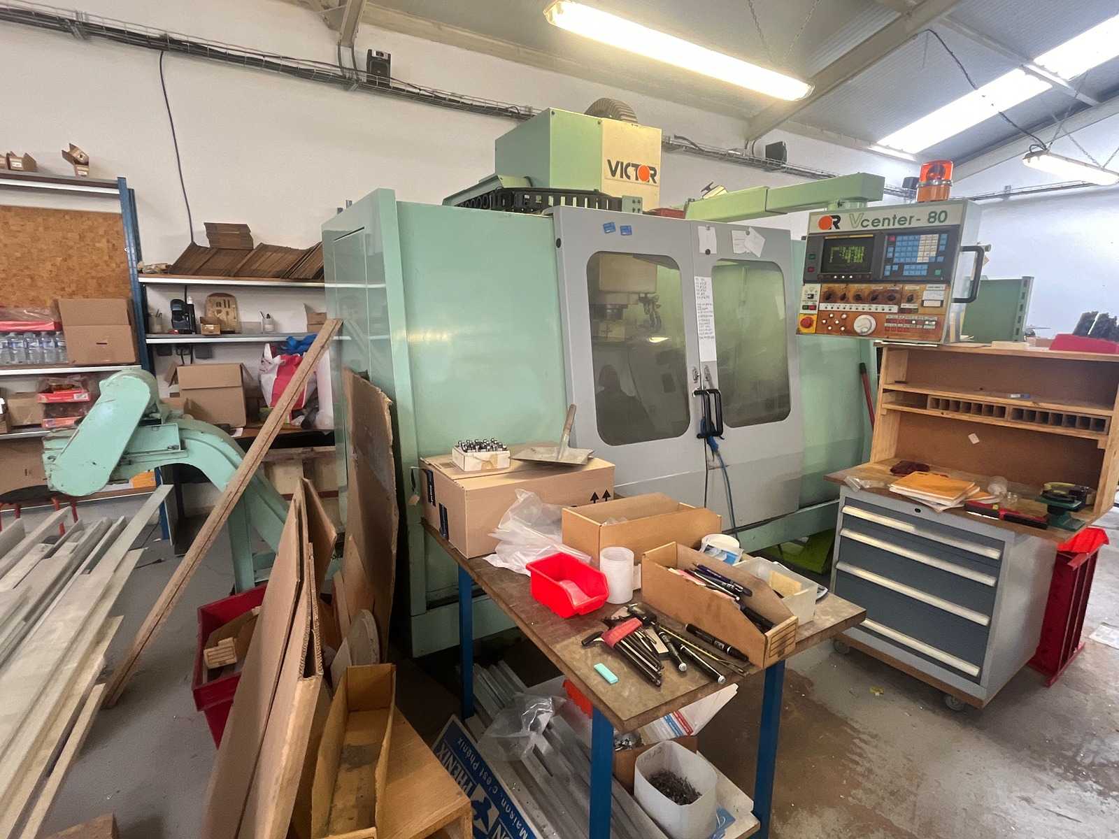 Manufacturer: VICTORYear: 1996Type: CNC Vertical Machining CenterNumerical Control: FANUC Series O-MStrokes: X 800 mm / Y 500 mm / Z 510 mmTable: 1100 × 500 mm – max. load 600 kgGuides: Prismatic slides with Turcite-B coatingSpindle: 60–6,000 rpm – BT40 / SK40 taper – 7.5 kW (continuous) / 11 kW (30 min)Tool changer: 24 tools – exchanger arm – 2.5 s tool-tool – max. tool Ø 80 mmWeight (kg): approx. 6000Notes: Mehanite heavy construction machining centre. Good working condition. Auction-ID: A1-44765-213
