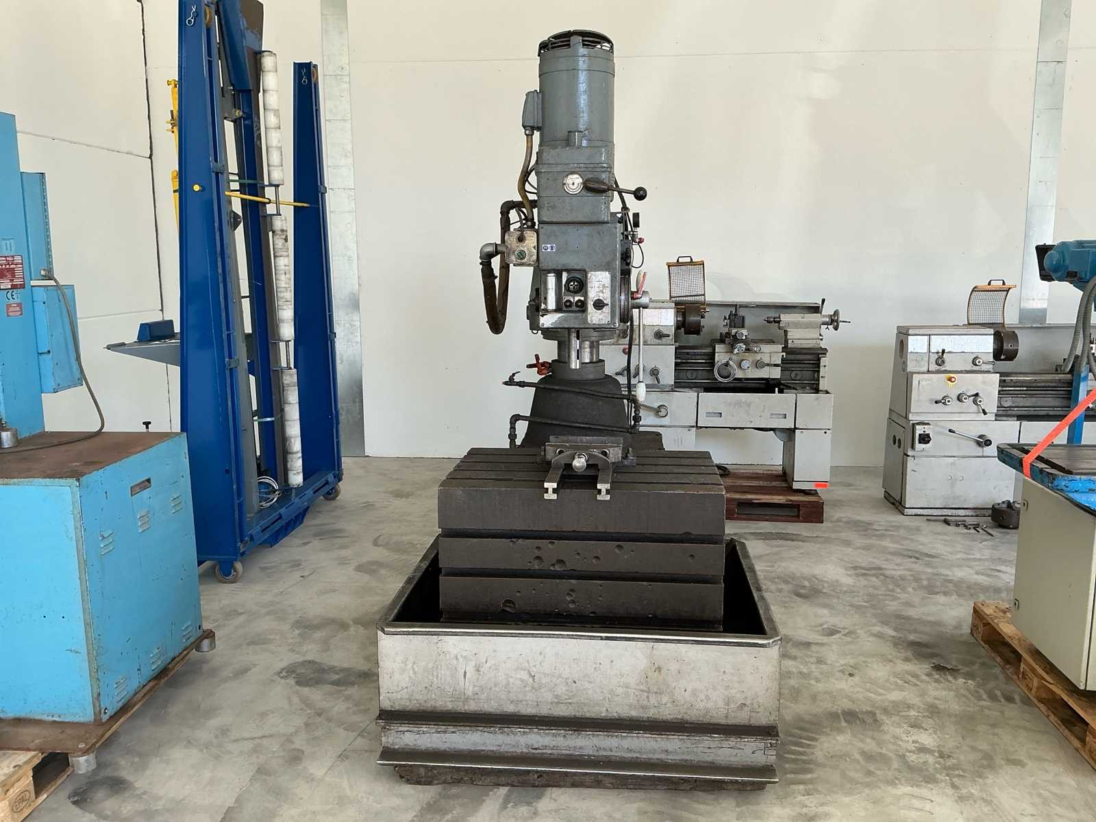 Equipped with: Otto Müller, SR30 Fast Radial drilling machine, drill spindle holder (morse): 40mm, longitudinal travel drill chuck (X-axis): 750 mm, height travel arm (Y-axis): 450 mm, spindle diameter: 70 mm, max drilling depth: 150 mm, speed: 2400 rpm, dimensions: 175x120x235cm (LxWxH), power supply: 380v, 2-speed motor (approx. 650 / 2780 rpm), mechanically switched speed, radially adjustable arm, vertical arm adjustment along column, m spindle with manual feed, refrigeration system, solid cast iron work table with T-slots Auction-ID: A1-41991-42