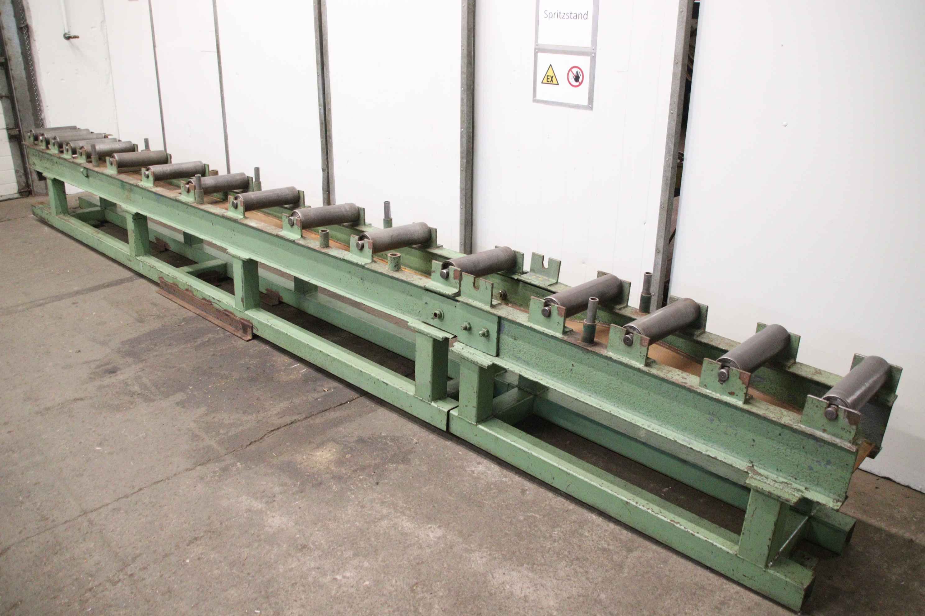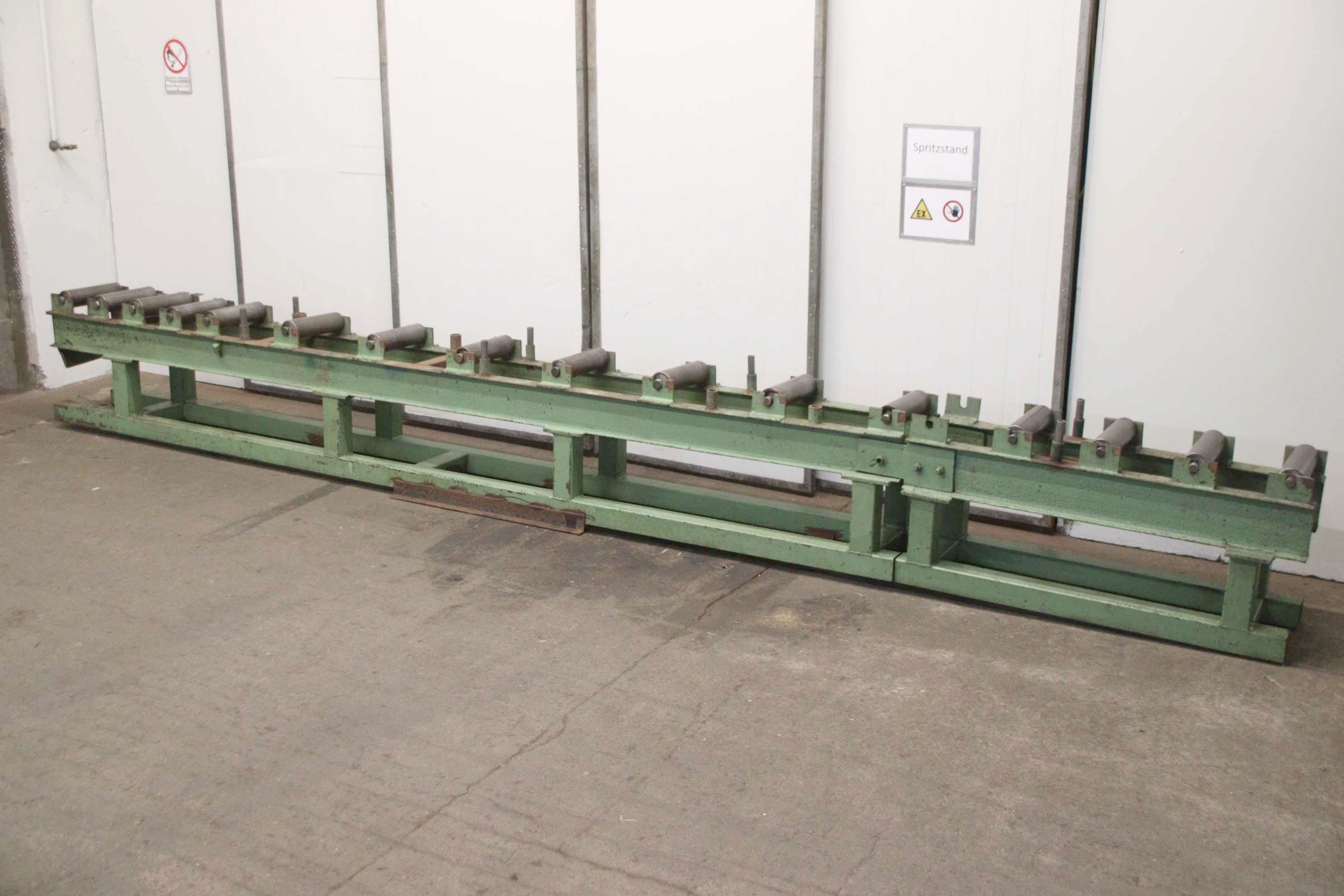 Roller conveyor, conveyor belt, roller conveyor, saw roller stand, saw roller stand, sawhorse, saw roller conveyor -Roller conveyor: 2-part saw roller conveyor, solid design -Total length: 6255 mm / 1500 mm unscrewable -Rolls: Ø 100 x 350 mm -Roller spacing: see photos -Price/Delivery: complete -Dimensions total: 6255/540/H750 mm -Total weight: 950 kg