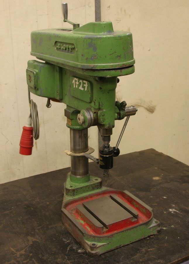 Bench drill, stand drill, pillar drill, pillar drill -Manufacturer: Ixion, bench drill type BT13ST -Clamping table: 170 x 170 mm -Travel: 210 mm -Spindle holder: drill chuck B16 -Projection: 180 mm -Speeds: 420 - 2100 rpm stepless -Pillar: diameter 65 mm -Spindle stroke: 70 mm, with fine stop -Motor: AEG 0.7/1.0 kW -Voltage: 380V -Dimensions: 620/235/H800 mm -Weight: 70kg