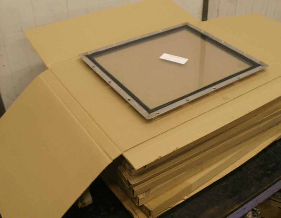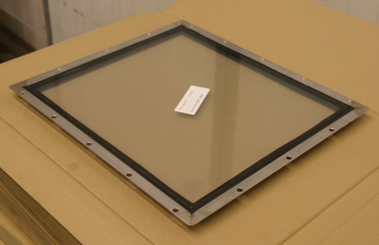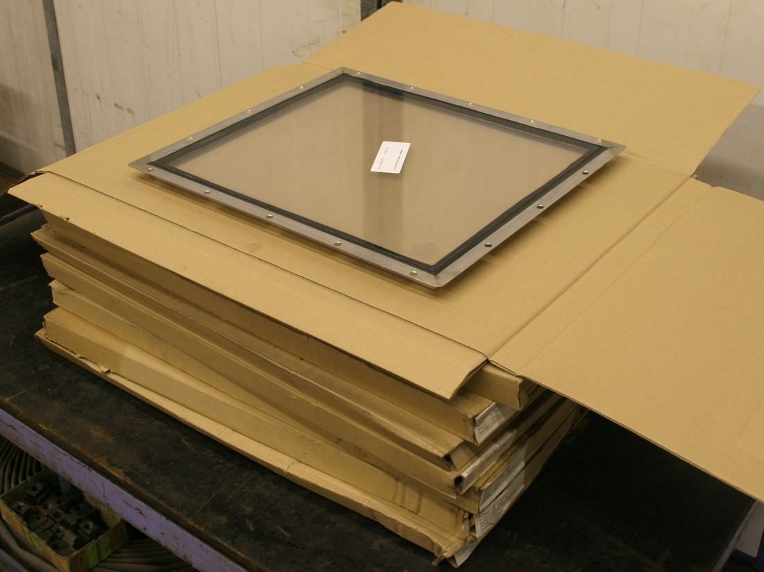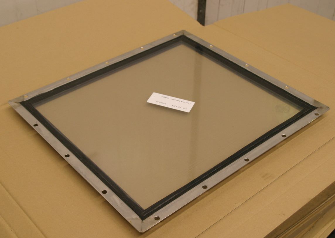 Security windows, security enclosures -for machine tools, grinding machines, machining centers -Frame: made of stainless steel -Dimensions: 387 x 438 mm -Frame: 475 x 425 mm -Glass thickness: 20 mm -Number: 8 discs available Price: per piece -Weight: 6 kg/piece
