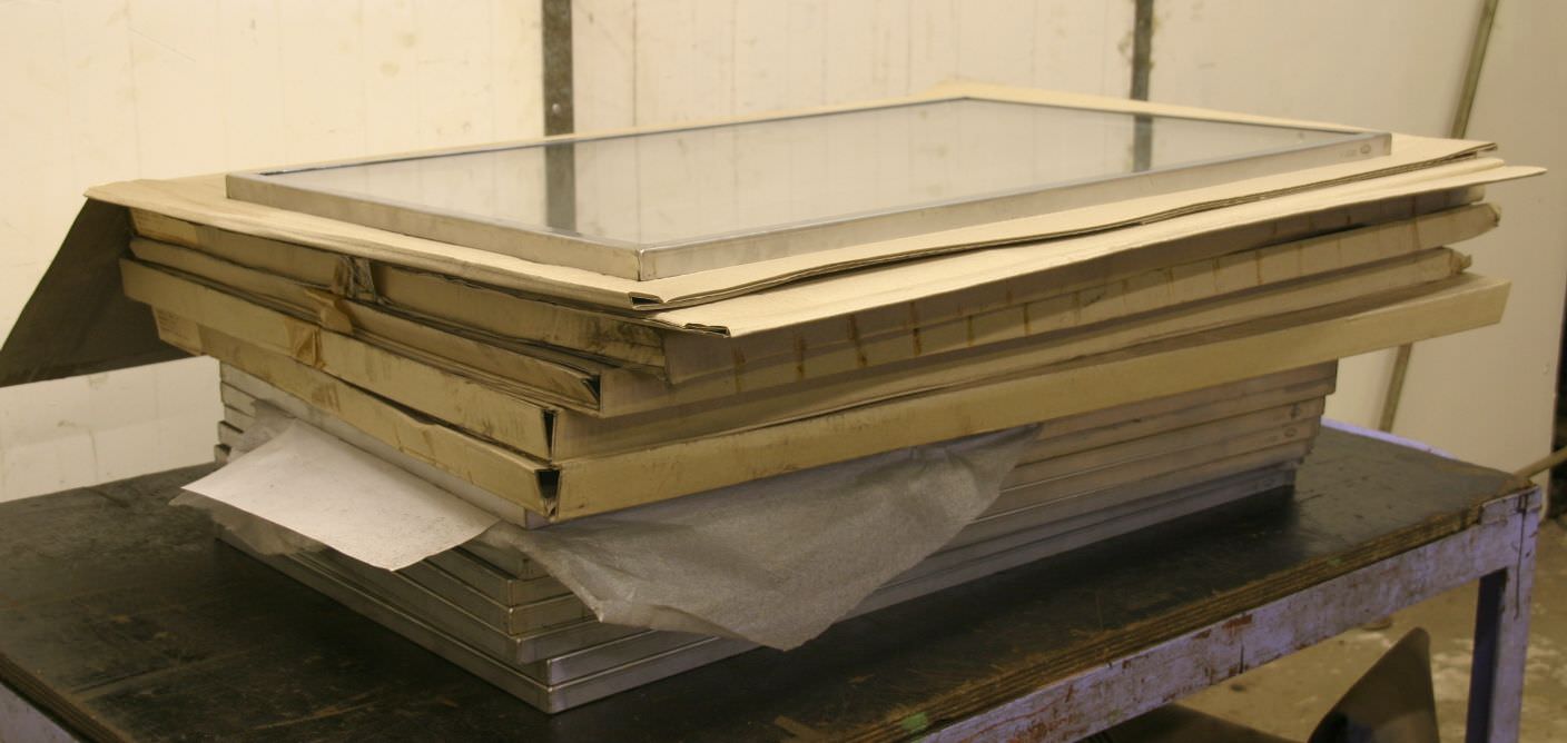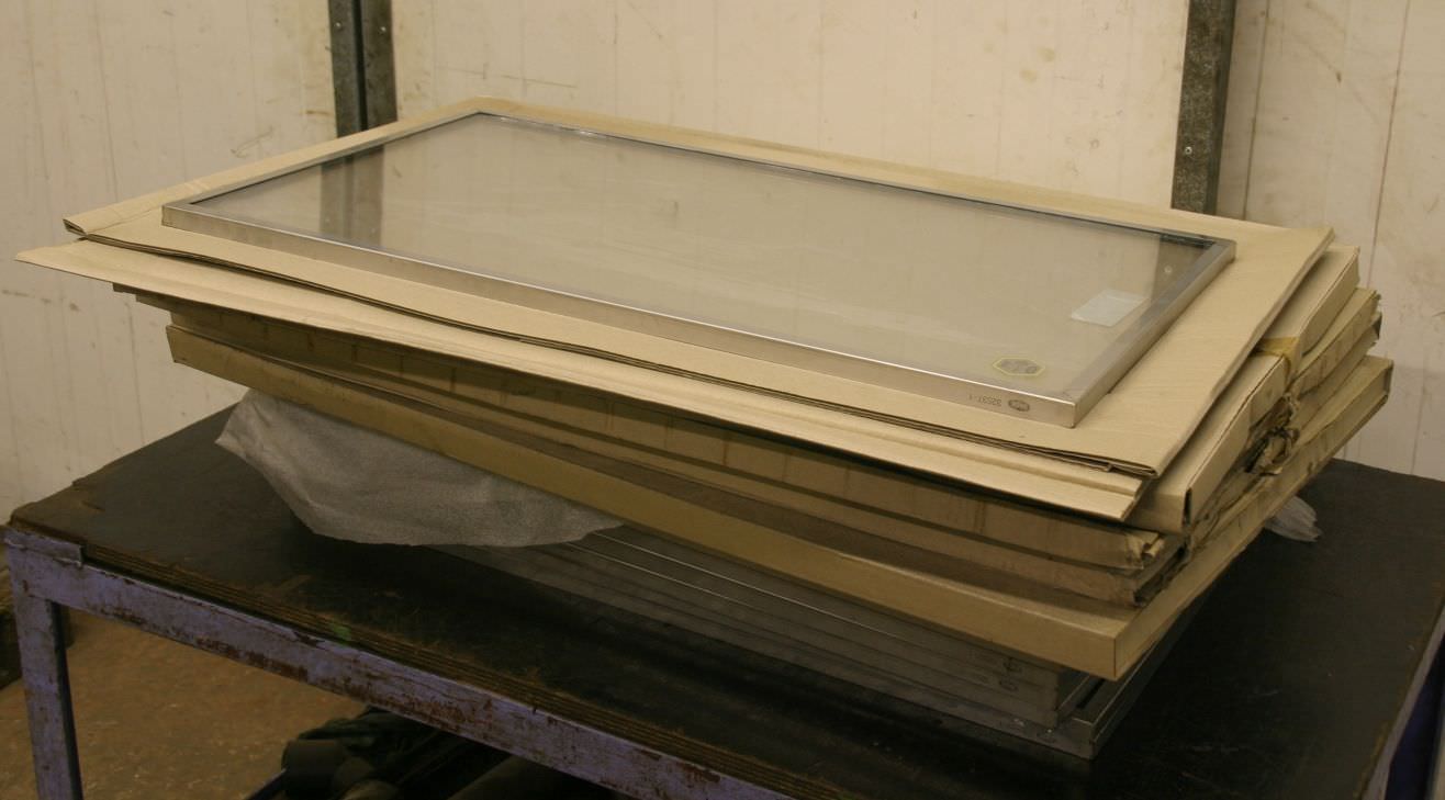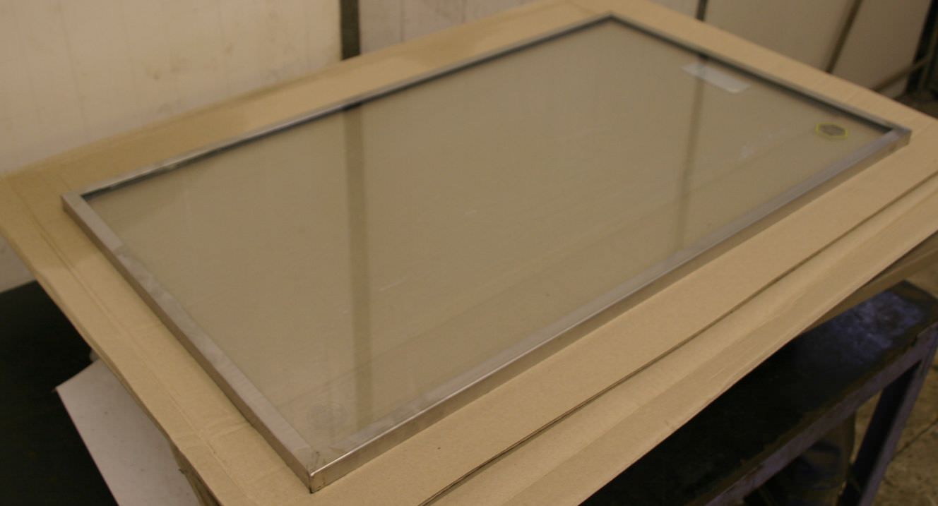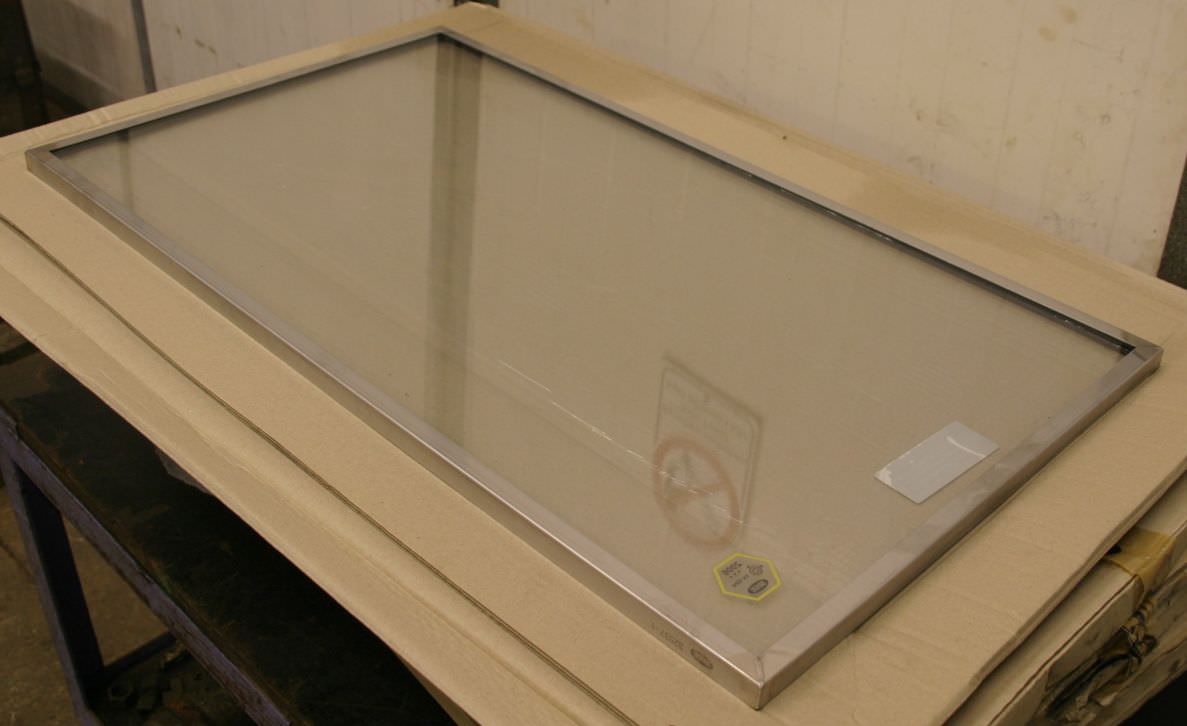 Security windows, security enclosures -for machine tools, grinding machines, machining centers -Frame: made of stainless steel -Dimensions: 387 x 438 mm -Frame: 475 x 425 mm -Glass thickness: 20 mm -Number: 8 discs available Price: per piece -Weight: 6 kg/piece