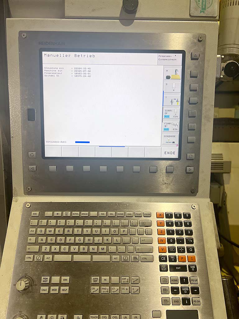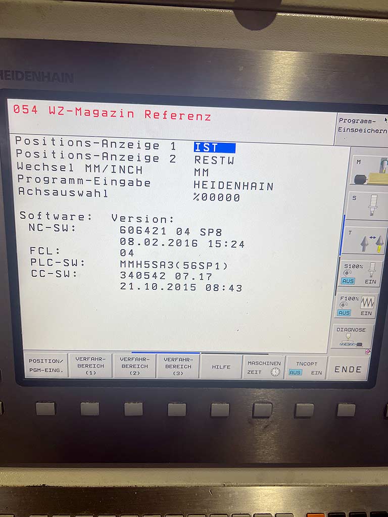 Доступен вертикальный POS с 5-осевым центром обработки с ЧПУ. Ход X/Y/Z: 670 мм/820 мм/600 мм, диаметр вращающегося стола: 800 мм, максимальная нагрузка на столе: 1200 кг, положения инструментов: 96, держатель инструмента: HSK-63, скорость: 18000 об/мин, ось A: -100/120, ось C: 360, вес: примерно 20000 кг, контроль: Heidenhain, рабочие часы: 22177 ч, часы работы шпинделя: 9601ч. Включая измерение инфракрасного зонда, IKZ и лазерного инструмента Blum. Доступна документация. Осмотр на месте возможен.