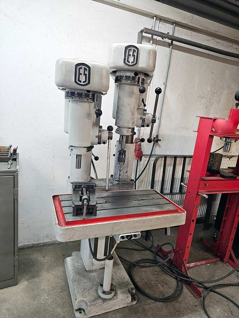 Доступна колонная буровая машина с двумя колоннами Ecker und Schmidt. Количество шпинделей: 2, емкость сверления в стали: 23 мм, глубина горловина: 330 мм, ход бурения: 120 мм, максимальная высота заготовки: 750 мм, конус шпинделя — MK1, диаметр колонны: 130 мм, размеры таблицы X/Y: 760 мм/360 мм. Размеры машины X/Y/Z: примерно 1100 мм/1150 мм/2100 мм, вес: примерно 700 кг. Осмотр на месте возможен.
