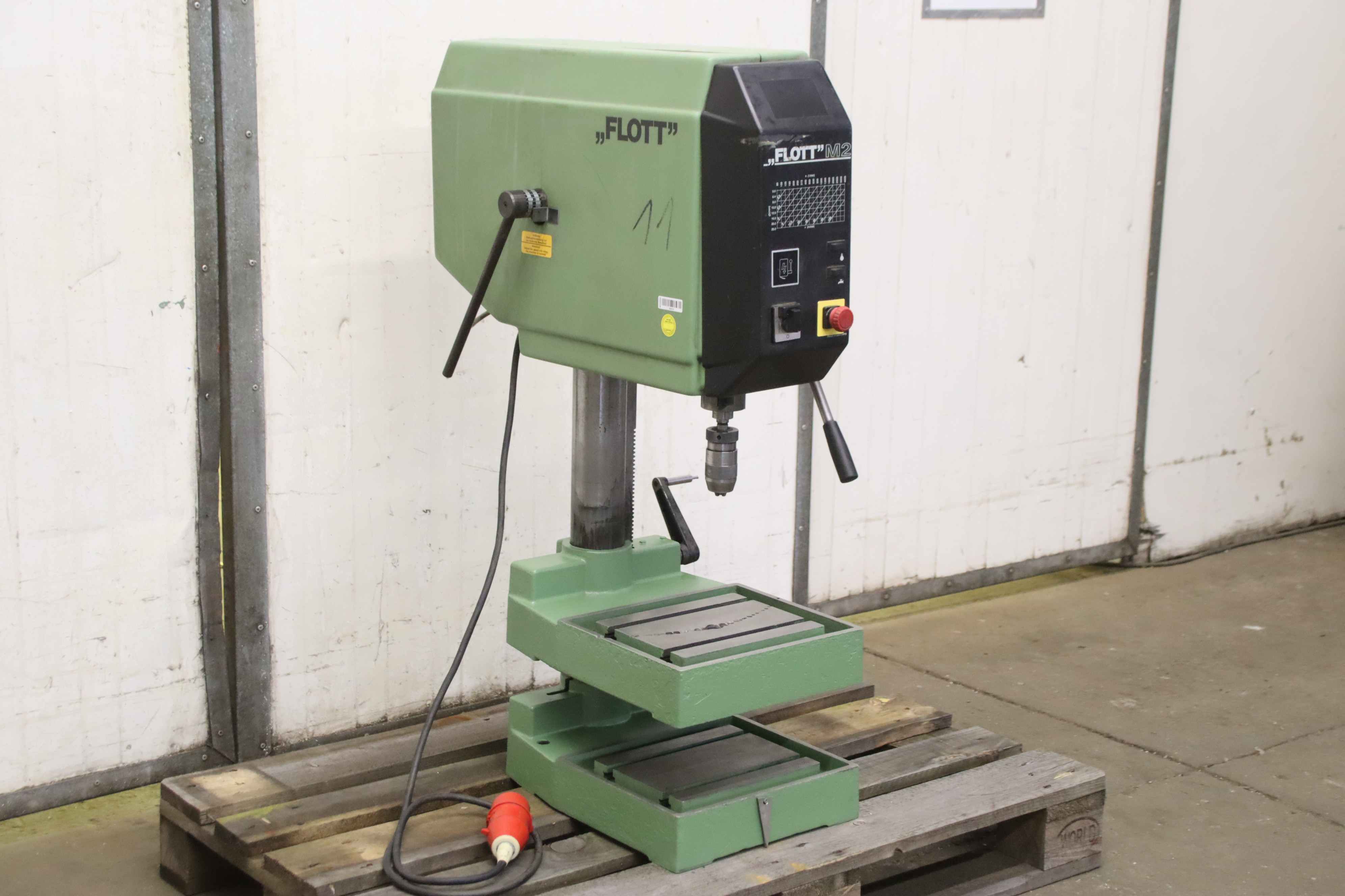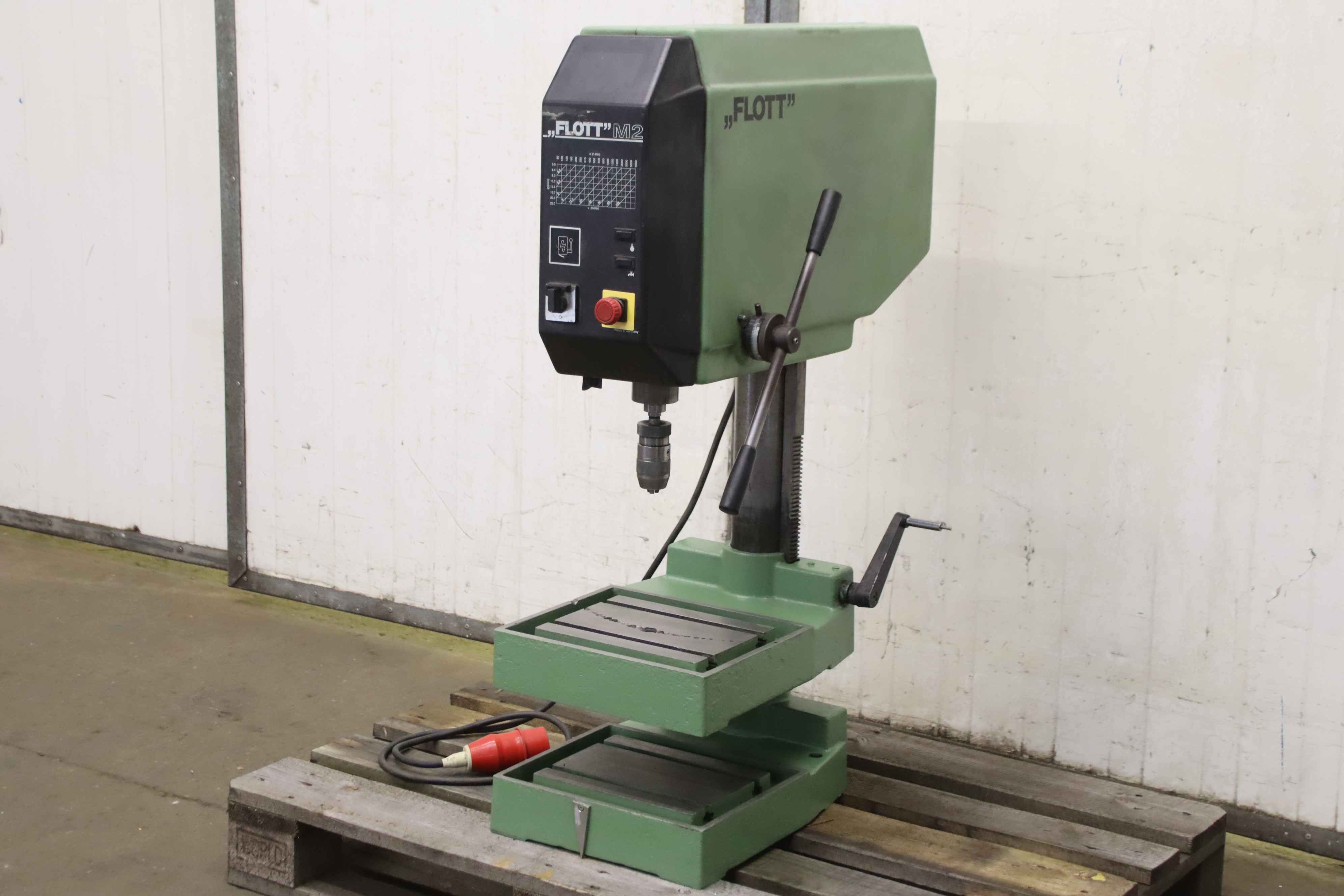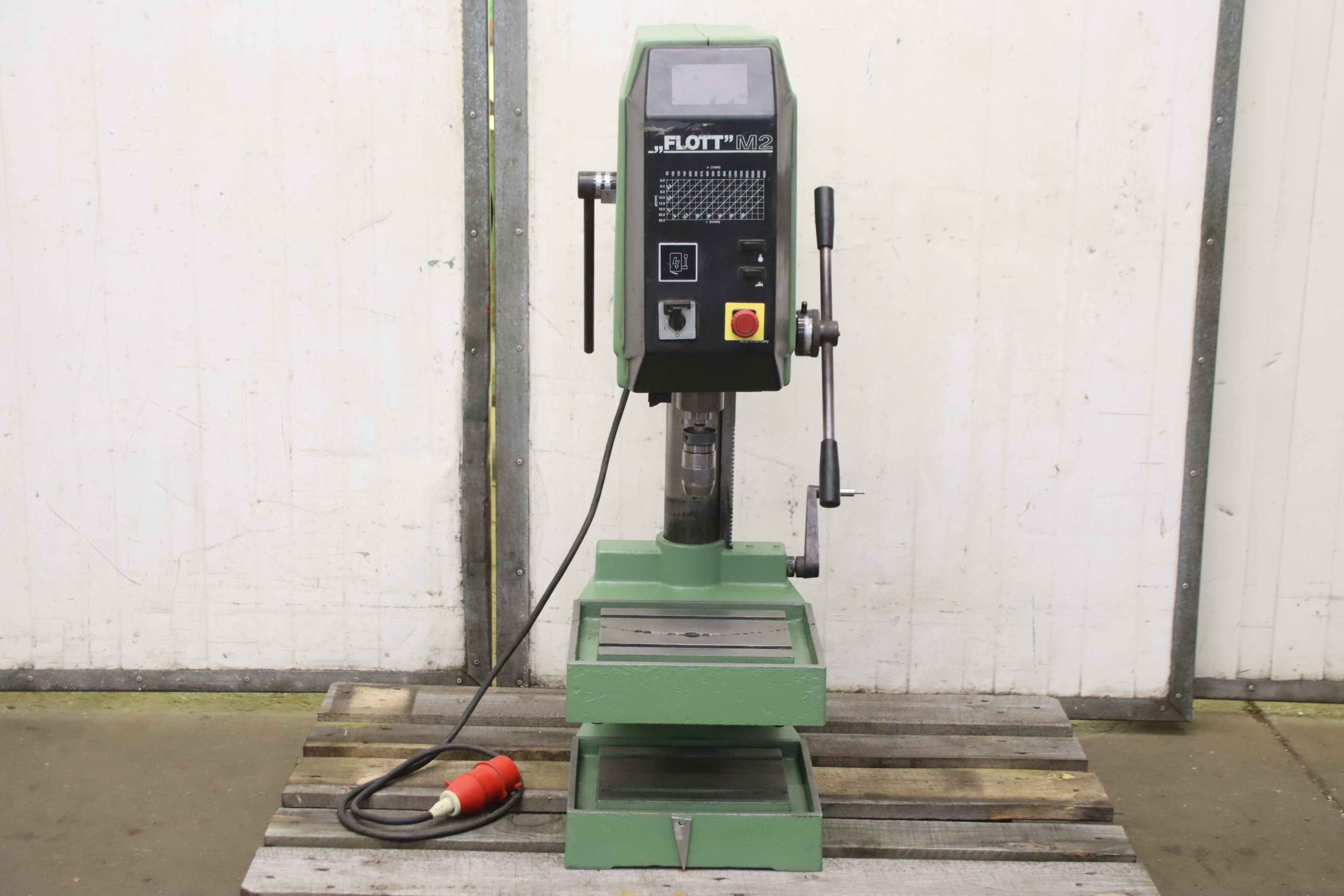 Bench drill, stand drill, pillar drill, pillar drill-Manufacturer: Flott, bench drill type M2 ST-Clamping table: 260 x 200 mm-Travel: 310 mm-Spindle holder: MK2 with drill chuck 3-16 mm-Projection: 240 mm-Speeds: 400 - 3500 rpm-Pillar: diameter 82 mm-Spindle stroke: 100 mm, depth stroke with fine adjustment-Motor power: 0.75 kW-Voltage: 400V-Dimensions: 750/340/H1100 mm-Weight: 135 kg