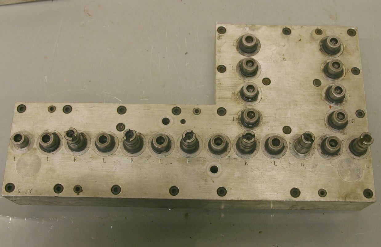 Multi-spindle head, drill beam, multi-spindle drill head, articulated multi-spindle head, row drilling machine, dowel drill head, dowel drilling machine, drilling gearbox -Number: max. 21 drill bits -Recording: M8 -right/left: rotating alternately -Spacing between rows of drill bits: 32 mm -Drill bit spacing: 96 mm -Number: 2 drill heads available Price: per piece -Dimensions: 415/220/H90 mm -Weight: 12 kg/piece