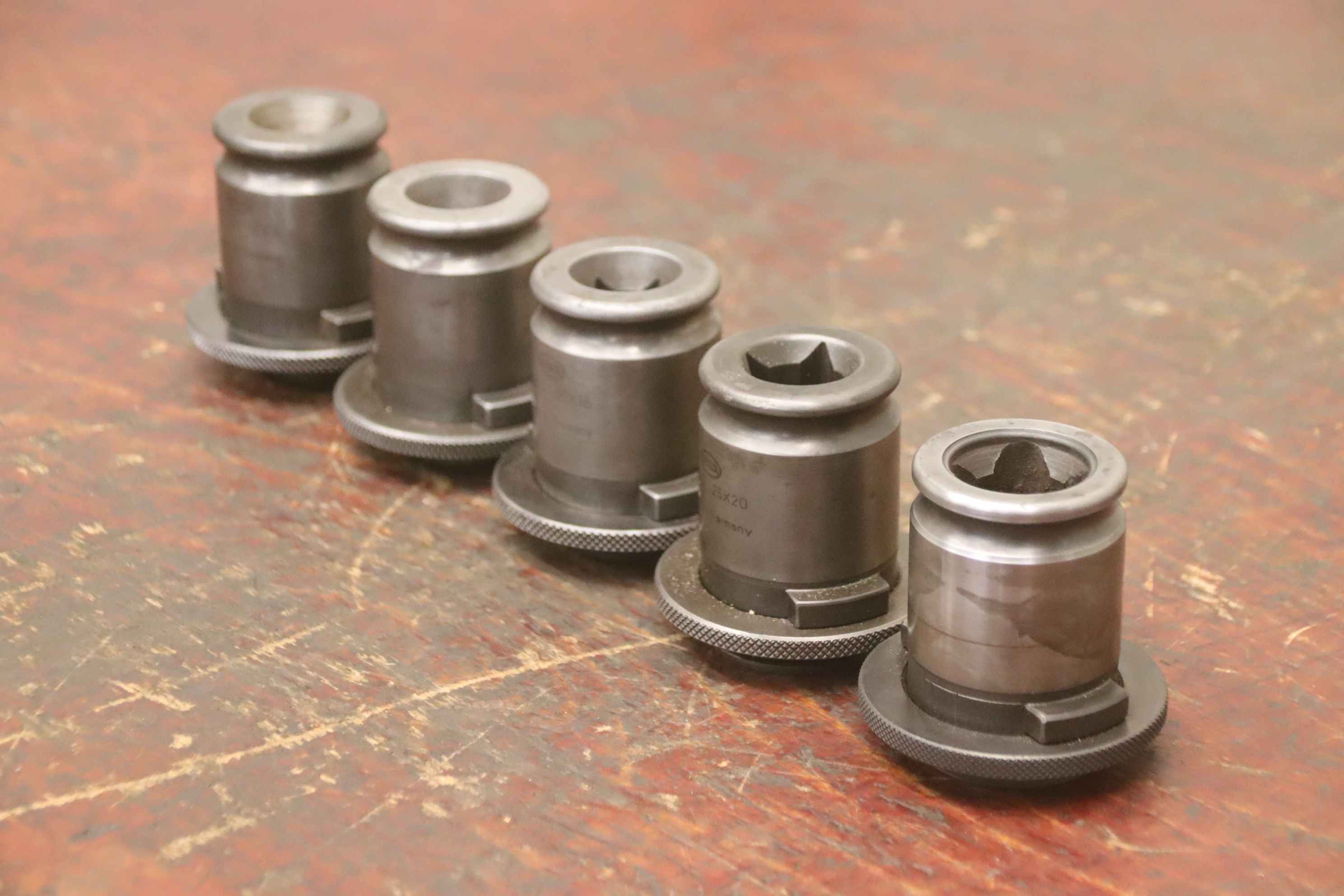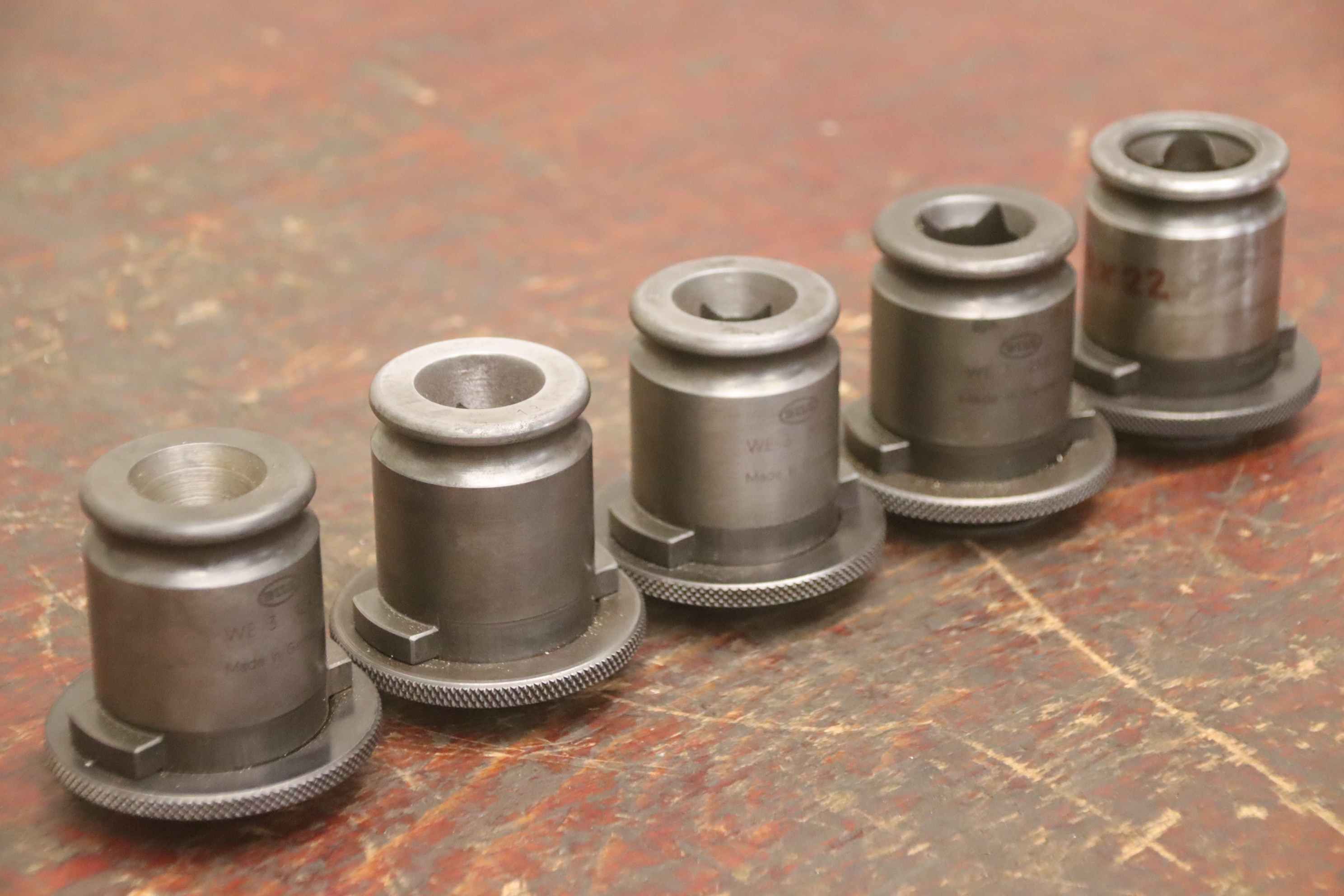 Quick-change chuck, quick-change holder, quick-change head, keyless drill holder, quick-change insert, interchangeable inserts, milling holder, collet chuck, reducing sleeves, attachment holder, thread quick-change insert-Manufacturer: Bilz, thread quick-change insert 5 pieces-Type: WE 3 12x9 / WE 3 16x12 / WE 3 20x16 / WE 3 25x20 / WE 3 28x22-Design/Size: see photos-Price/Delivery: complete-Transport dimensions: 220/140/H75 mm-Weight: 3.8 kg