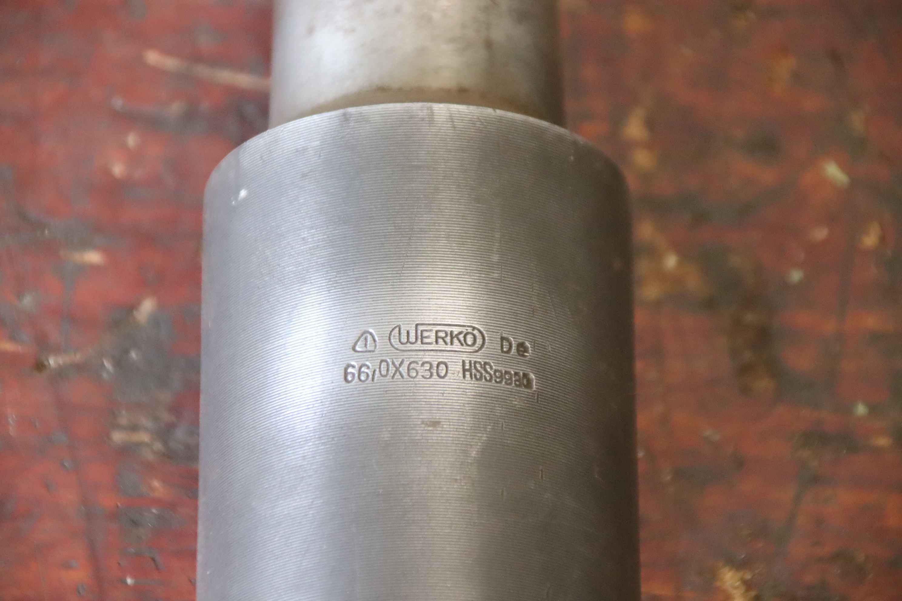 Reamer, twist drill, drill bit-Manufacturer: Werkö, twist drill Ø 66.0 mm-Recording: MK5-Type: Two-cutter 66.0 x 630 HSS-on request: different sizes/quantities available from additional stock-Transport dimensions: Ø 66 x 780 mm-Weight: 10.6 kg