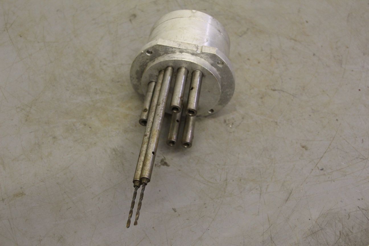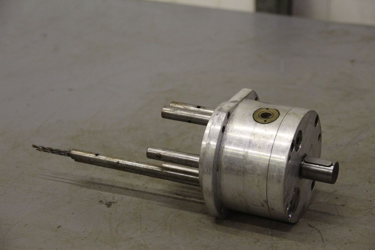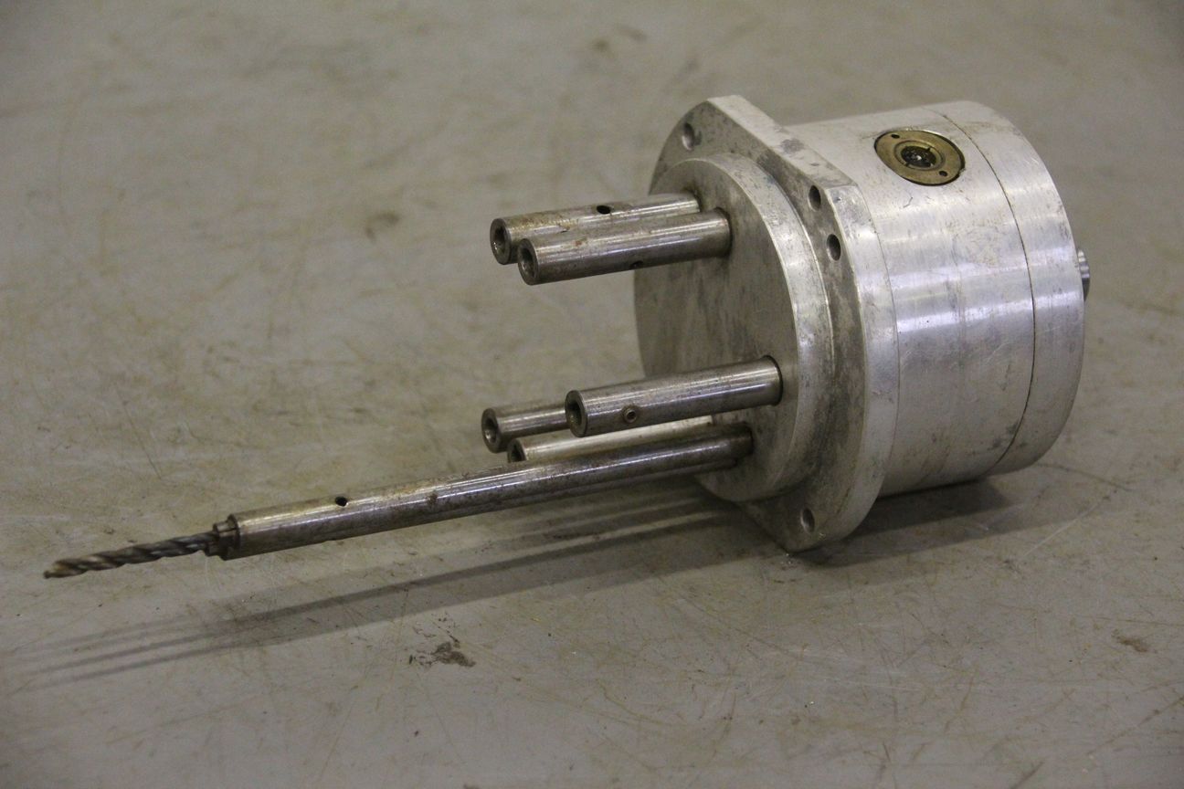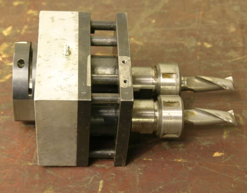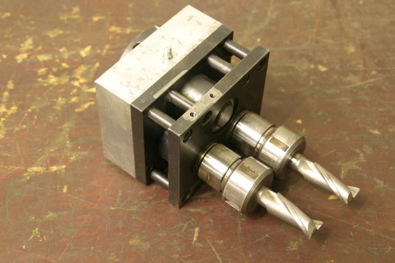 Multi-spindle head, multi-spindle drilling head, drilling gearbox -Multi-spindle head -Number: max. 2x drill bits/milling cutters -largest hole pattern spacing: 42 mm -Top opening: Ø 45 mm -Built-in collets: Ø 16 mm -Multi-spindle heads are variable tools -for various machining operations such as drilling, thread cutting, countersinking, reaming, -with which multiple holes can be machined at once -Dimensions: 120/110/H220 mm -Weight: 5.6 kg