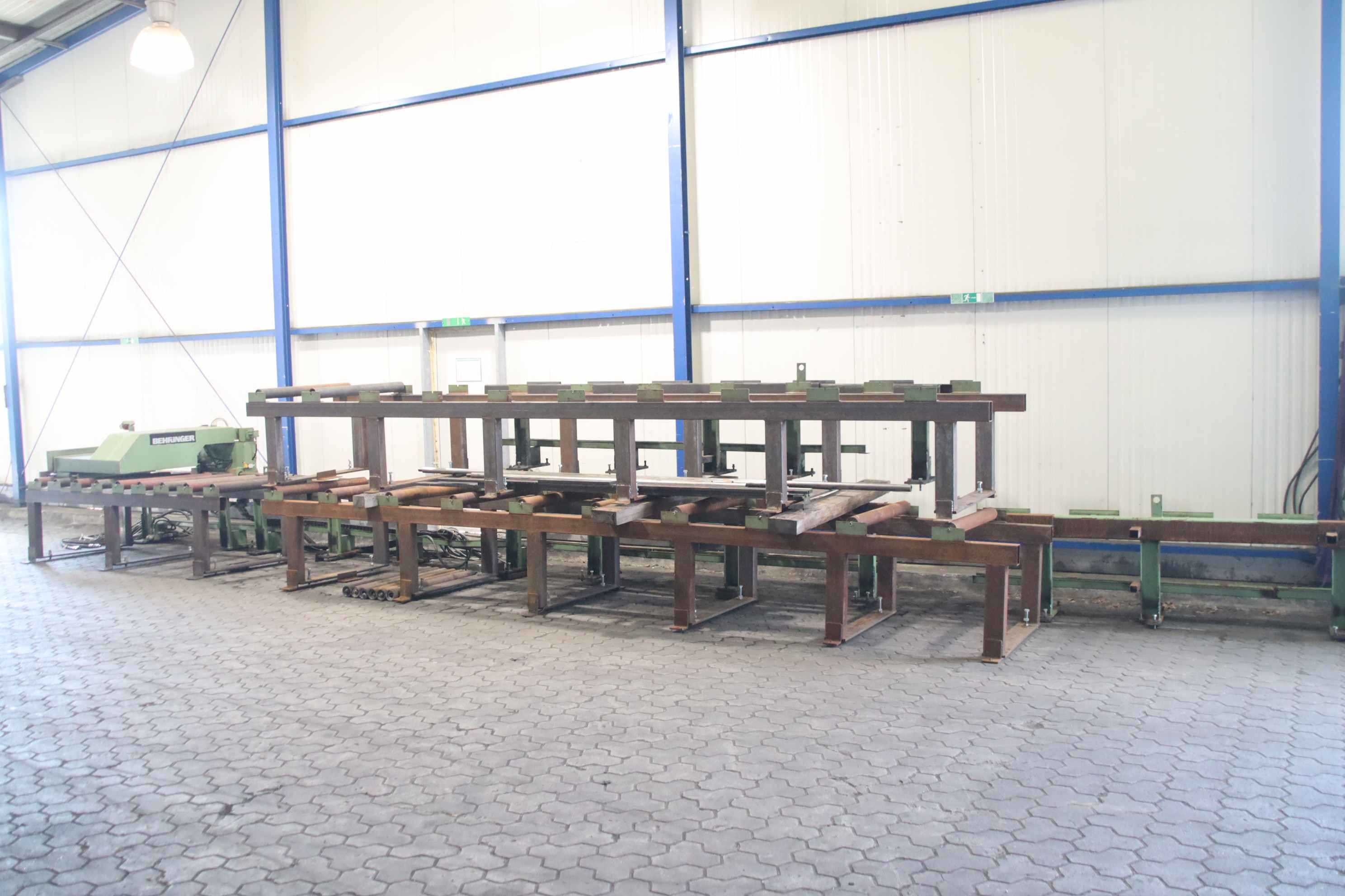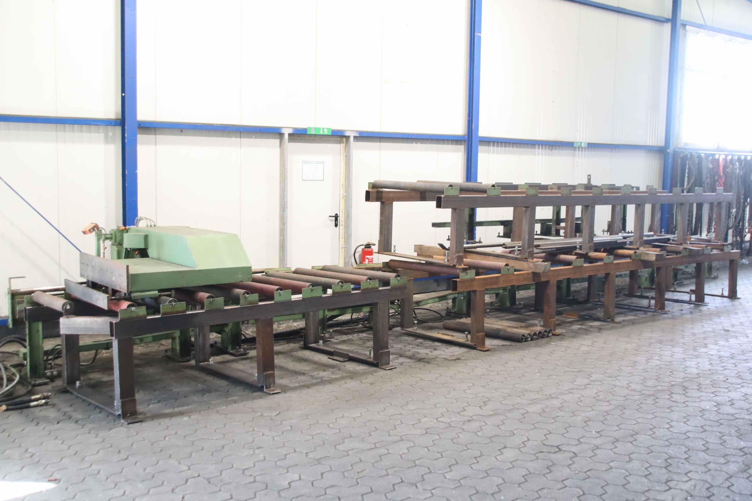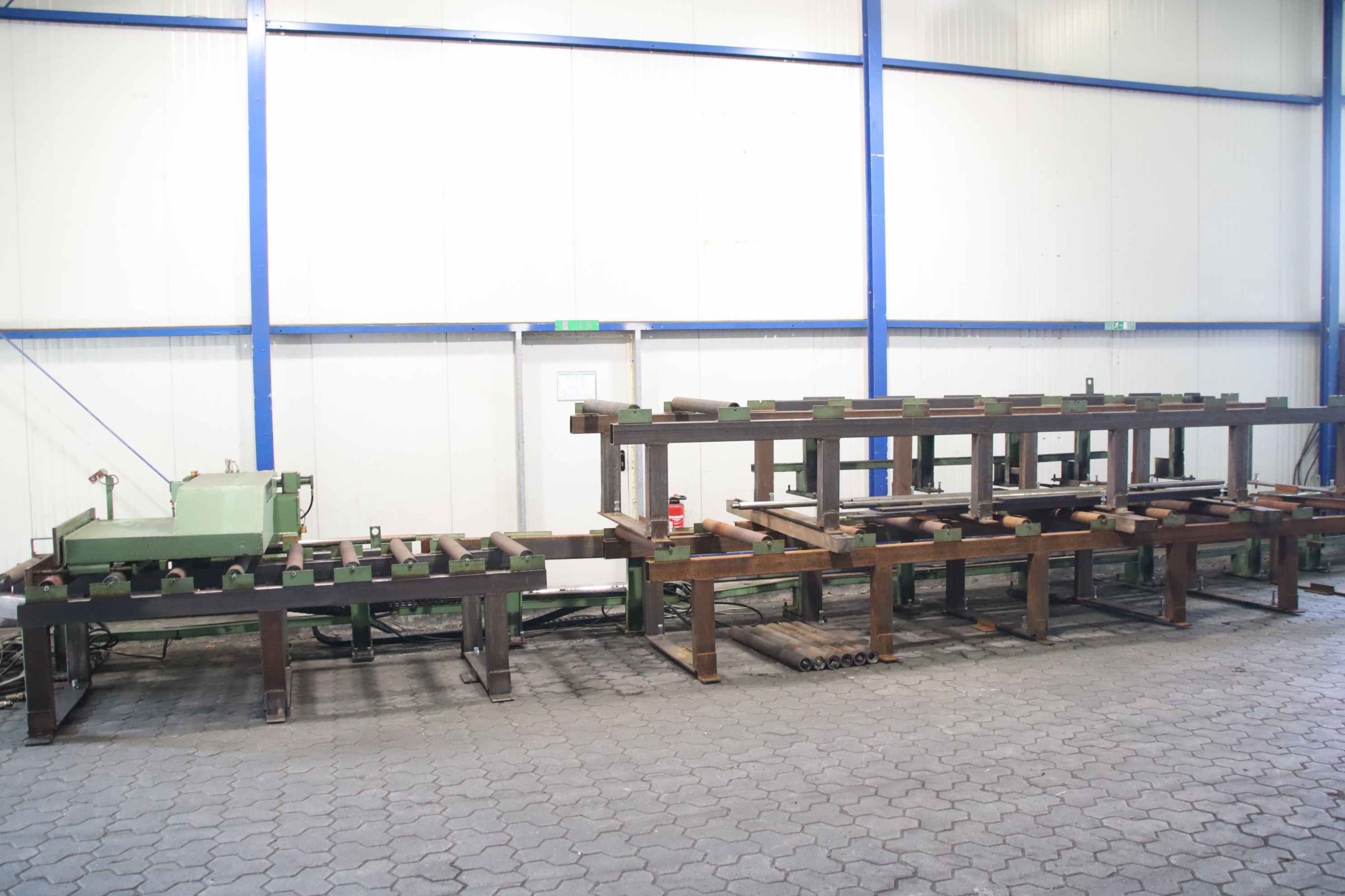 Roller conveyor, conveyor track, roller conveyor belt, roller track, saw roller block, saw roller block, saw horse, saw roller conveyor, length stop, longitudinal stop, saw stop, material stop, motorized length stop, controlled length stop -Manufacturer: Behringer, saw stop length stop with roller conveyors -Rolls: Ø 90 x 1065 mm -Roll spacing: 310 mm -Individual components/accessories: incl. 5 spare rollers see photos -Price/Delivery: complete -Total dimensions: 15040/1800/H1230 mm -Total weight: 3300 kg