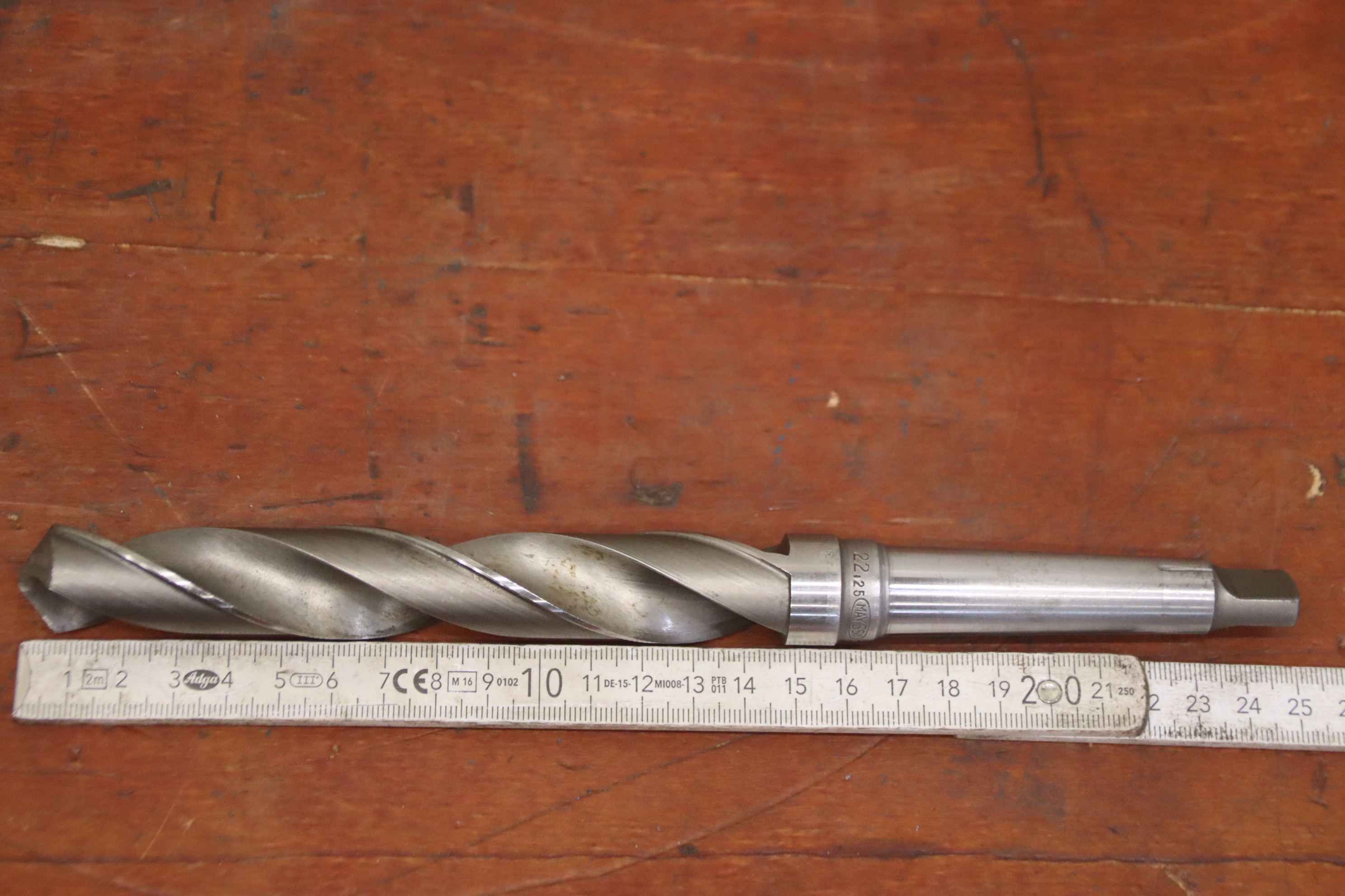 Drill bits, twist drills, drill bits-Manufacturer: Maysso, twist drill 2 pieces Ø 18.75 / 22.5 mm-Type: double cutter, MK2 mounts-Price/tax: complete-on request: different sizes/quantities available from additional stock-Transport dimensions: 250/40/H25 mm-Weight: 0.7 kg