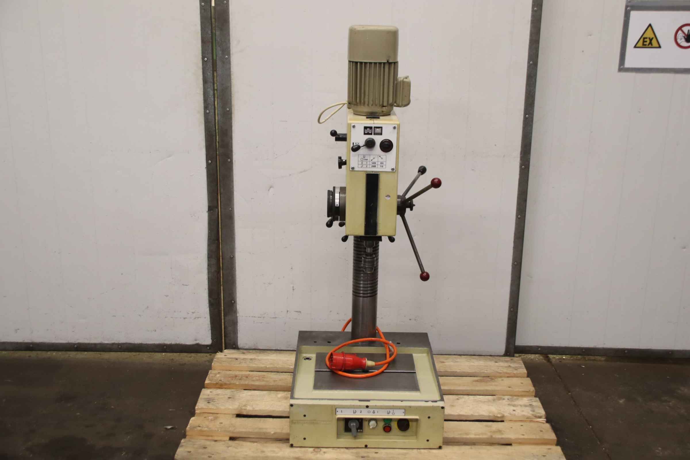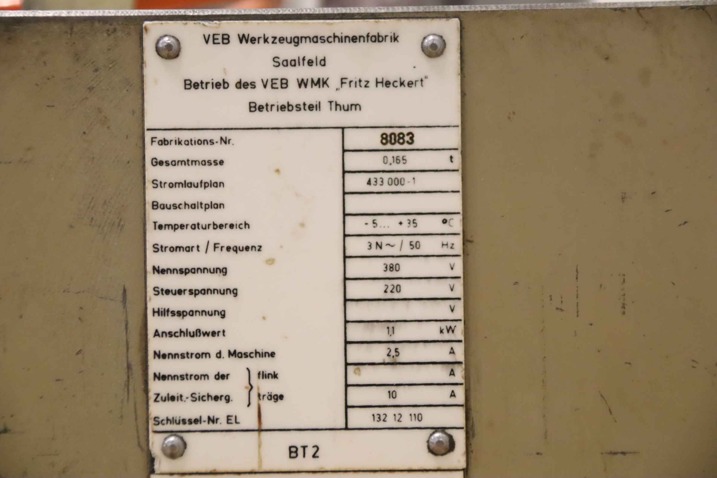 Bench drill, pillar drill, column drill, column drill -Manufacturer: WMW Heckert, bench drilling machine type BT 2 -Clamping table: 340 x 280 mm -Travel: 350 mm -Spindle holder: MK2 -Projection: 215 mm -Speeds: 355/710/1400/2800 rpm -Column: diameter 93 mm -Spindle stroke: 100 mm / depth stop with fine adjustment -Motor: VEM 0.8/1.0 kW with brake -Voltage: 380 V -Number: 2x drill available -Price: per piece -Dimensions: 550/480/H1270 mm -Weight:157 kg/piece