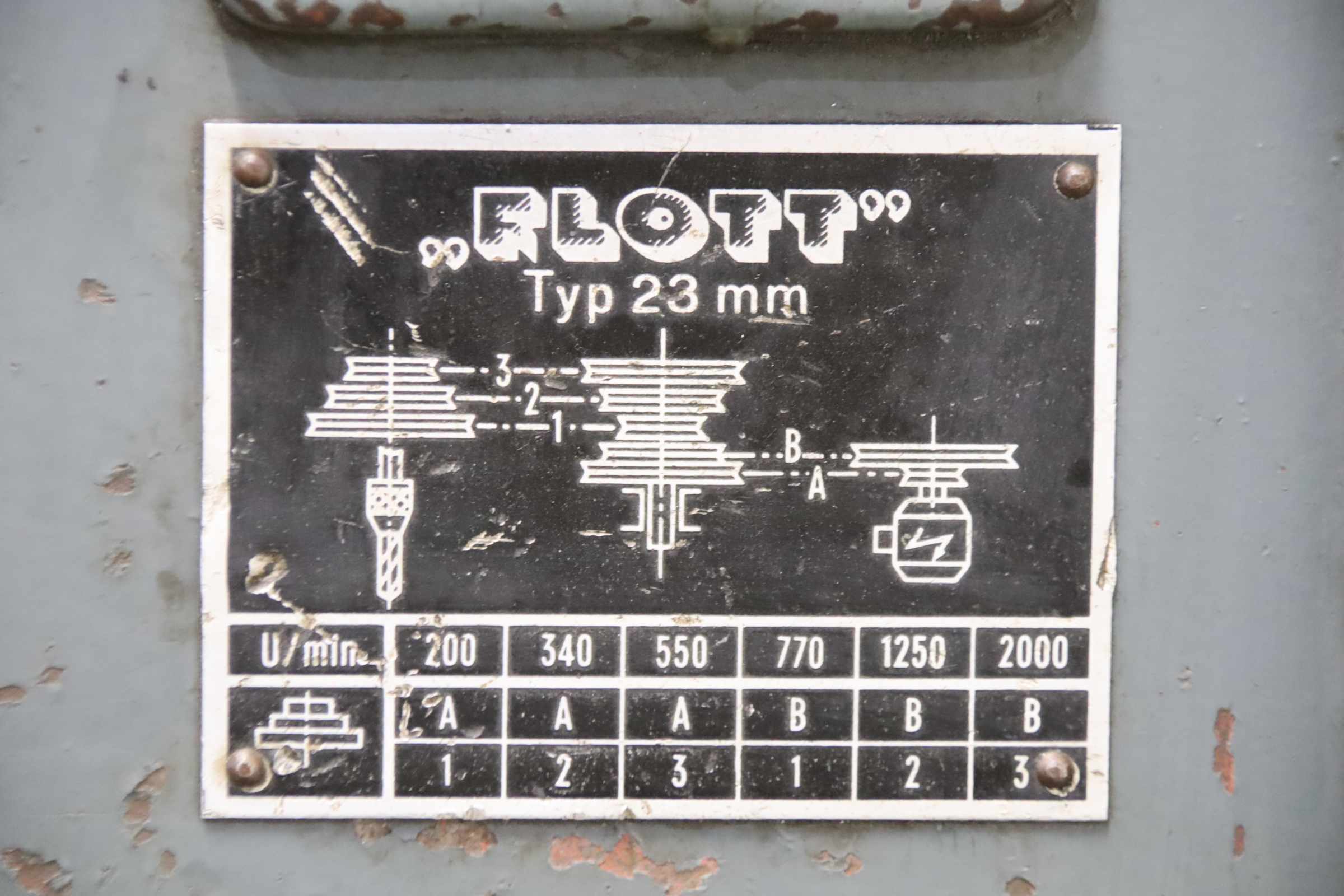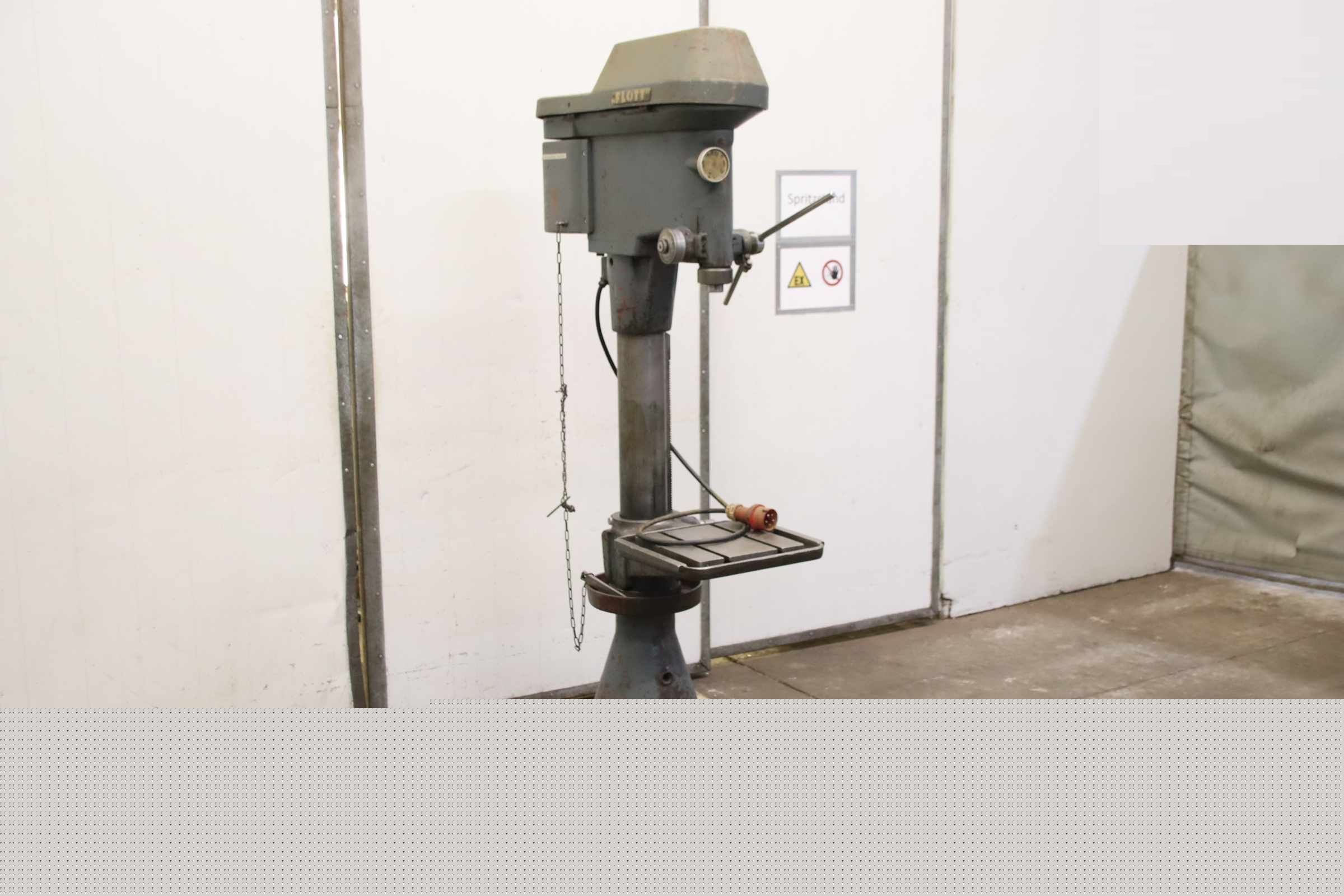 Drilling machine, bench drill, pillar drill, column drill -Manufacturer: Flott, Pillar drill type 23 mm -Spindle mount: MK3 -Motor: 1.1 kW -Speed adjustment: via V-belt -Speeds: 200 - 2000 rpm -Table size: 300 x 300 mm -Travel distance: 440 mm -Spindle stroke: 145 mm -Protrusion: 300 mm -Column Ø: 125 mm -Dimensions: 900/450/H1900 mm -Weight: 306 kg