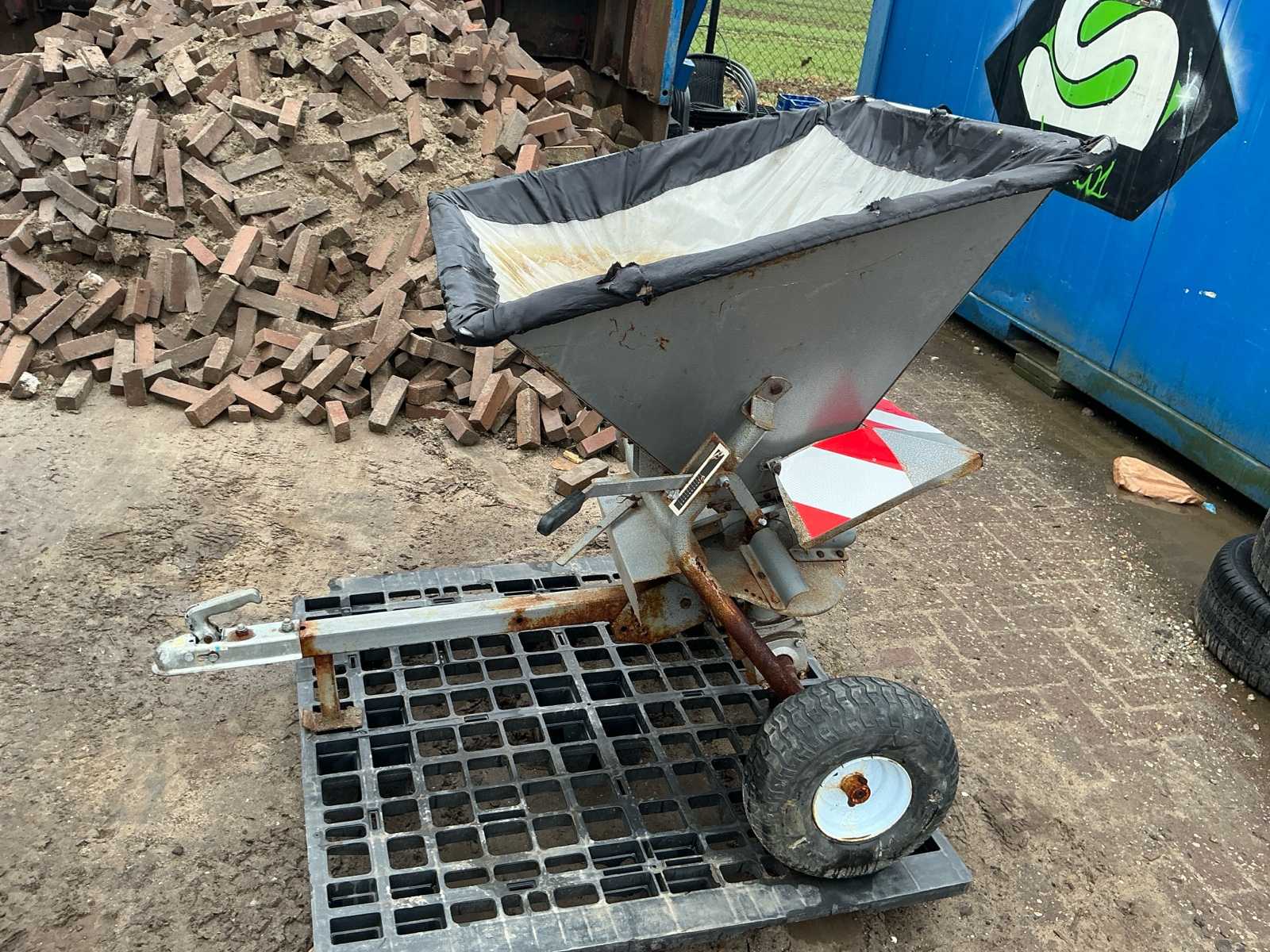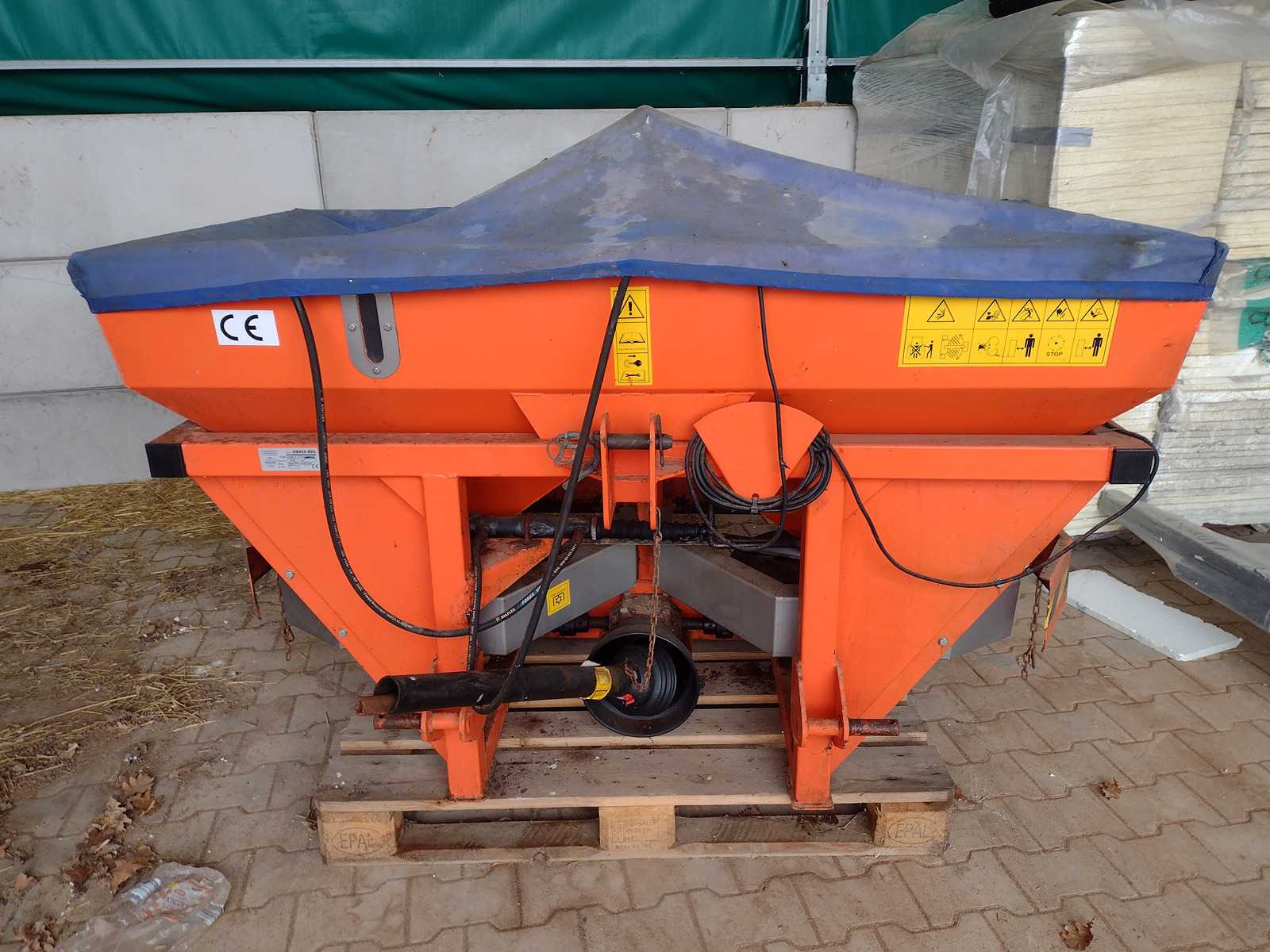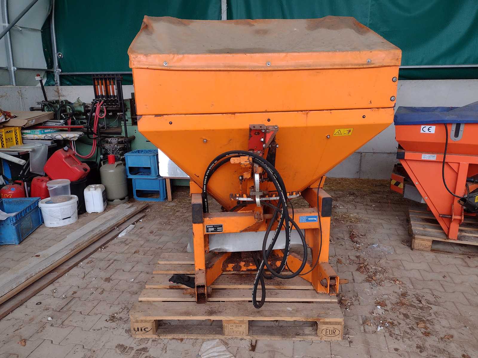 Salt spreader matev SPR-H/M 120 ST for municipal and agricultural winter road maintenance. Three-point hitch with PTO drive (540 rpm) and manual spreading rate adjustment. Equipped with lighting unit, tarpaulin and drive shaft. Spreading width approx. 1 to 6 m. Compact design with plastic container and even distribution via disc spreading system. Suitable for tractors in municipal use, on farms or in winter service. Auction-ID: 04E-MH3-1