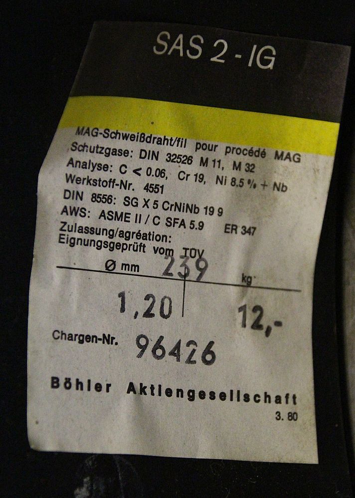wire electrode, welding wire, welding wire -Manufacturer: MTC, welding wire G 19 9 Nb Si 1.4551i -Type: MT-347 O1.2mm -Dimension: O 300/110 mm -Weight reel: 15.7 kg