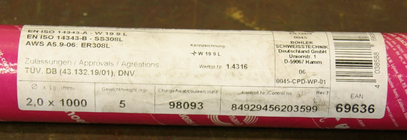 TIG welding rod, welding wireStainless, IK-resistant (wet corrosion up to 350 °C). Corrosion-resistant like similar low-carbon and stabilized austenitic 18/8 CrNi (N) steels/cast steel grades. Cold toughness down to -196 °C. Connections and surfacing of similar stabilized and non-stabilized austenitic CrNi (N) and CrNiMo (N) steels/cast steel grades. Connections and surfacing on cold-tough matching/similar austenitic CrNi (N) steels/cast steel grades.-net weight: 5 kg-Number: 2x package available-Price: per package-Weight complete: 5.2 kg/package