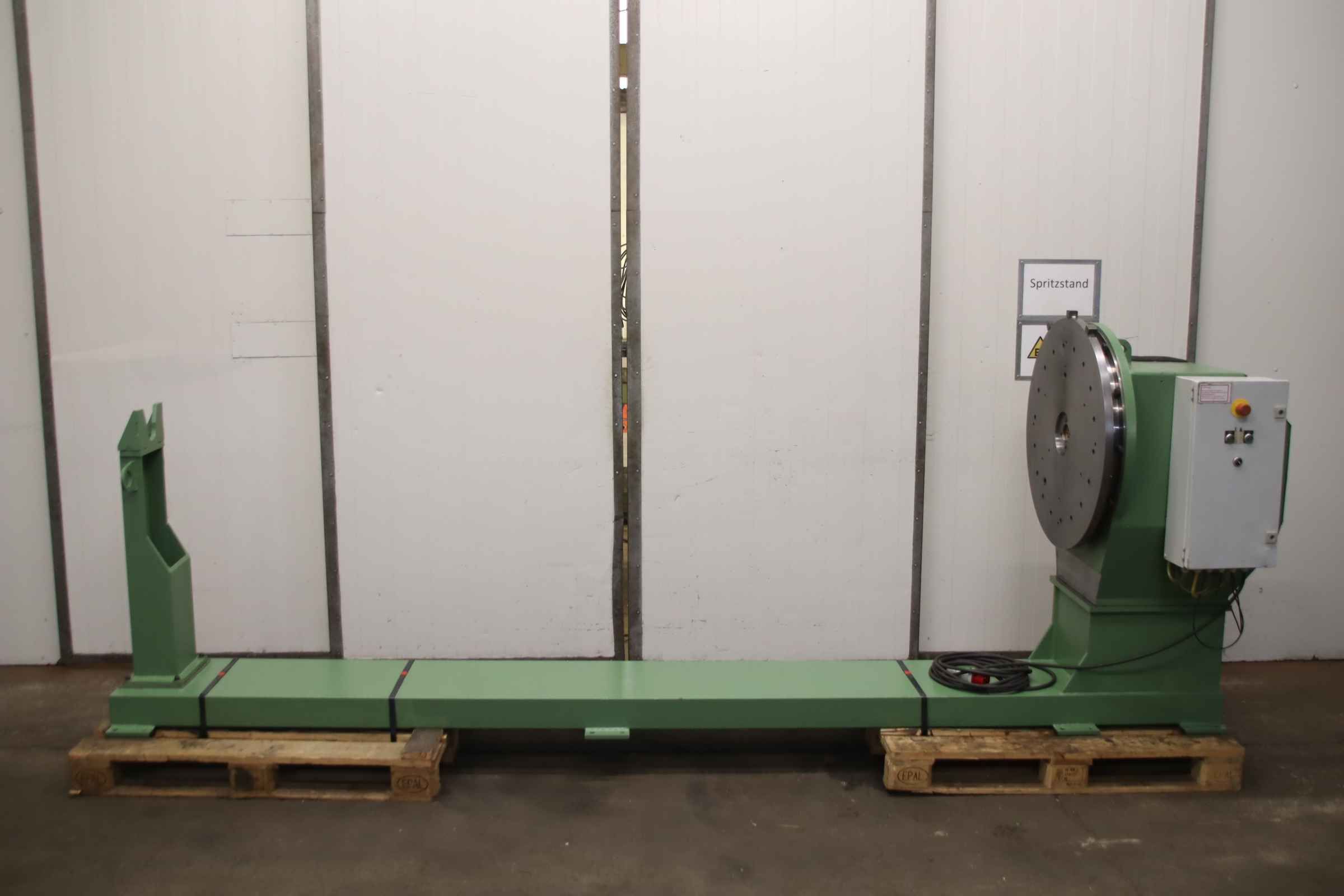 Container turning device, welding turning device, welding turning device, welding device, welding turntable, welding turntable and tilting table, welding turning device, welding turntable tilting table -Welding turning device: turning length 3130 mm -Turntable: Ø 800 mm -Drive: Servo Motor 1/1.6 kW with cooling, see photo nameplate -Rotation direction: right/left rotation -Transport dimensions: 3890/900/H1420 mm -Weight: 880 kg