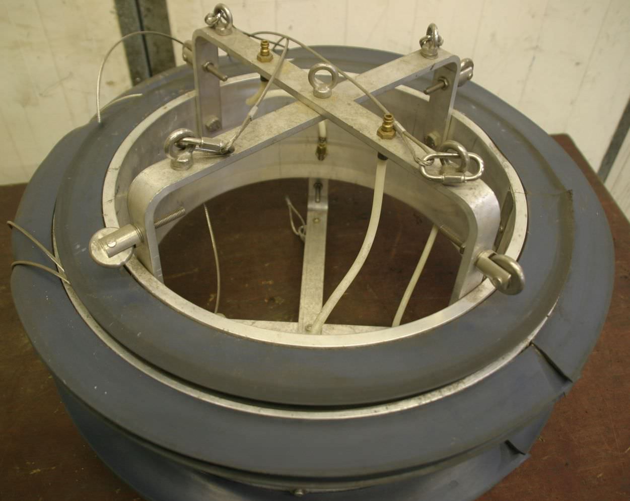 Pipe welding accessories, forming gas welding equipment, forming gas welding aid -Diameter: 600 mm -Rubber sealing lip -with transport rollers for disassembly from the pipe to be welded -Dimensions: 650 x 450 mm -Weight: 18 kg