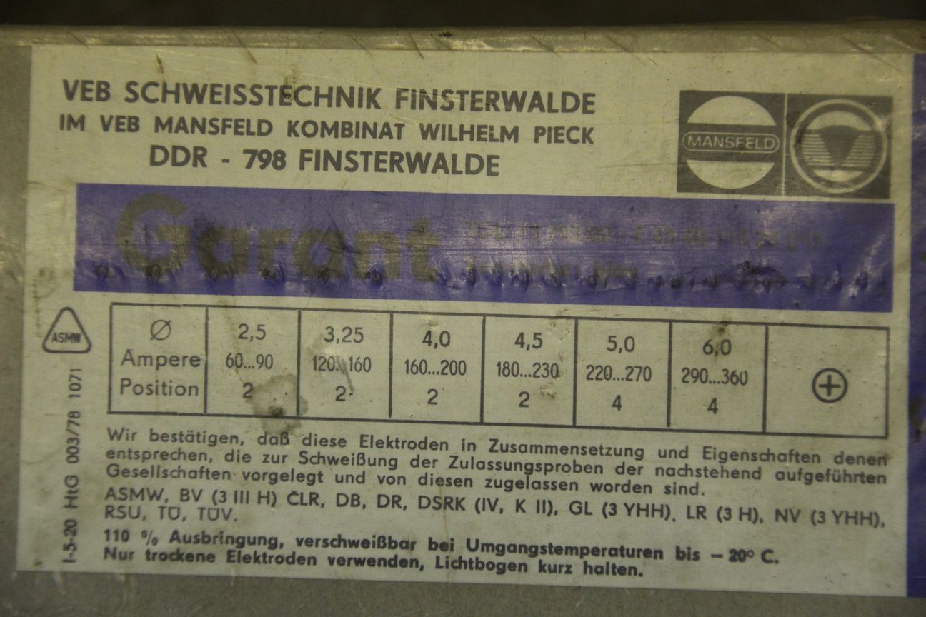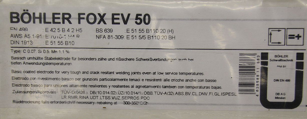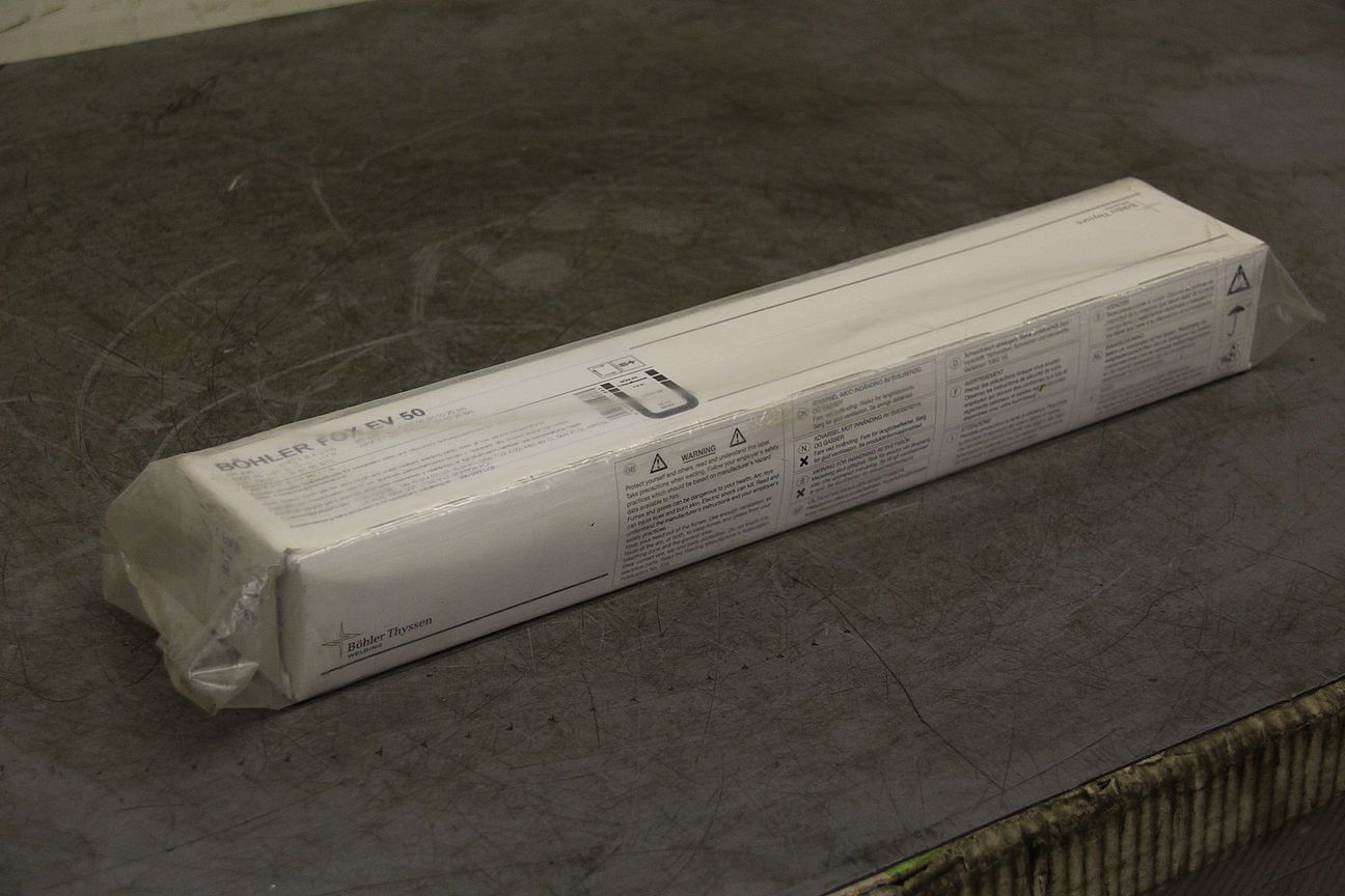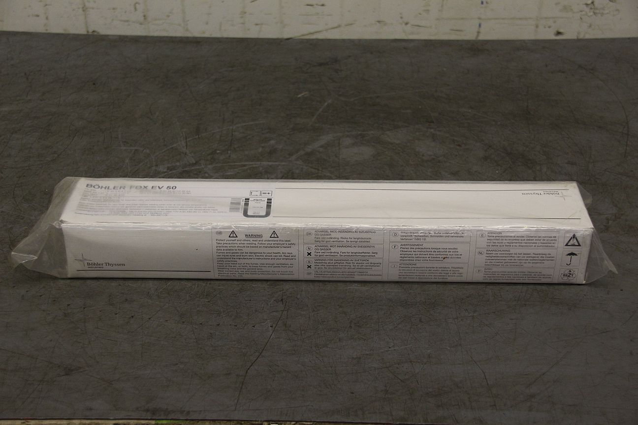 Stick electrodes 4.0 x 450 -Type: FOX EV 50 -Analysis: C .07 Si 0.5. Mn 1.1% -Price: per package -Number: 17 packages available -Weight per package: 5.8 kg