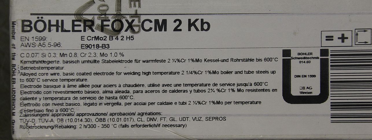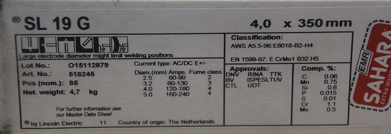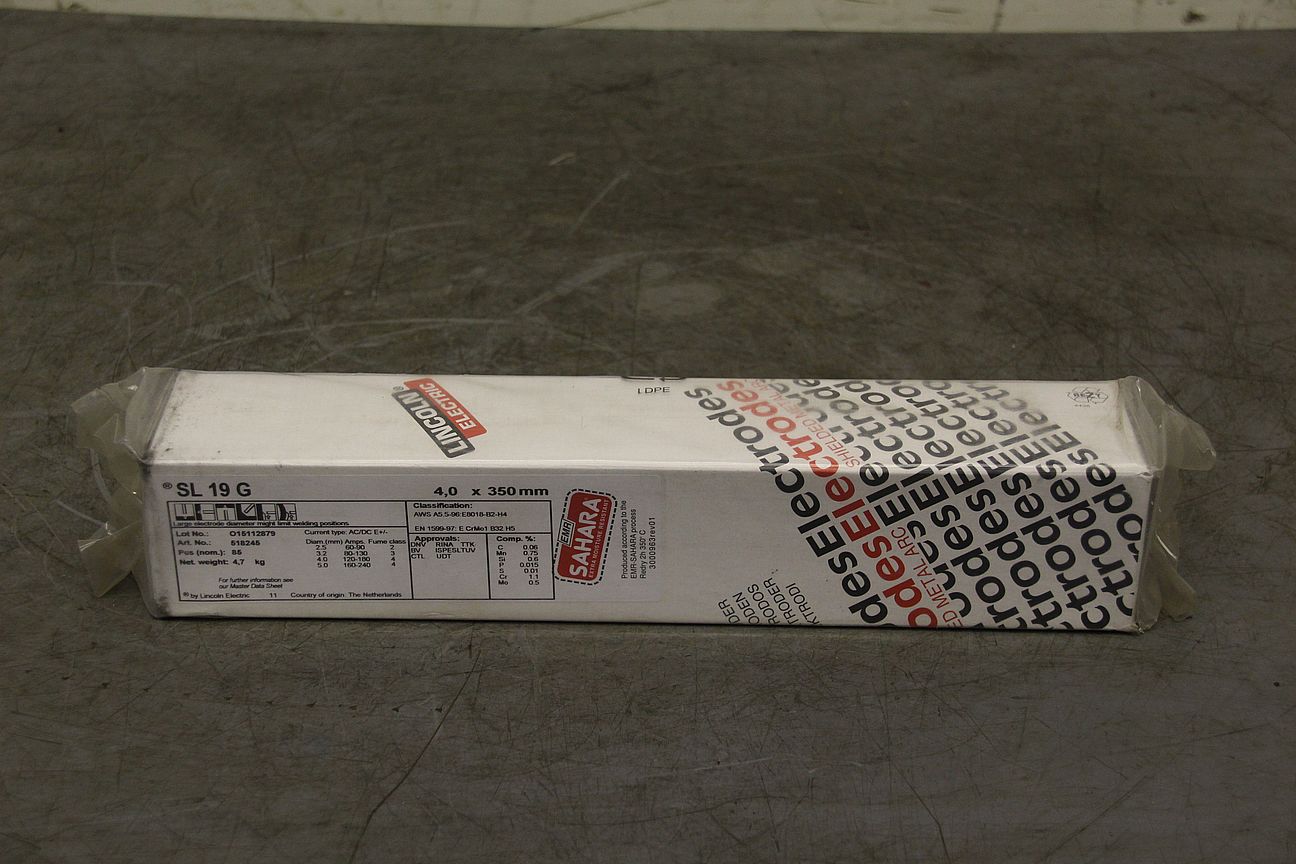 Stick electrodes, welding electrodes 4.0 x 350 -Type: SL 19 G -AWS: A5.5-96:E8018-B2-H4 -Price: per package -Number: 5 packages available -Weight per package: 4.8 kg
