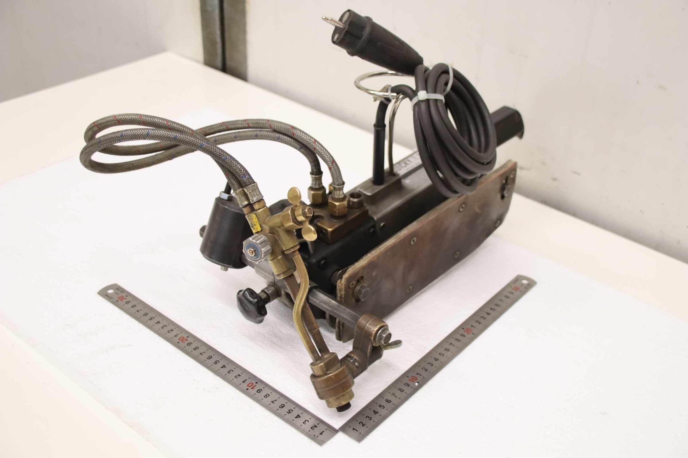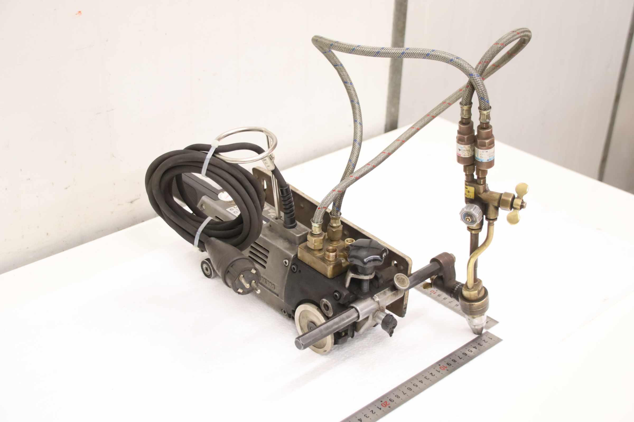 Flame cutting system, torch, oxyfuel cutting system, machine cutting torch, flame cutting machine, cutting torch, cutting machine, oxyfuel cutting machine, gas cutting torch -Manufacturer: Messer Griesheim, machine cutting torch, flame cutting machine -Type: Quicky Electronic -Cutting speed: adjustable -Voltage: 220 V 40 W -Dimensions: 580/280/H370 mm -Weight: 7.8 kg