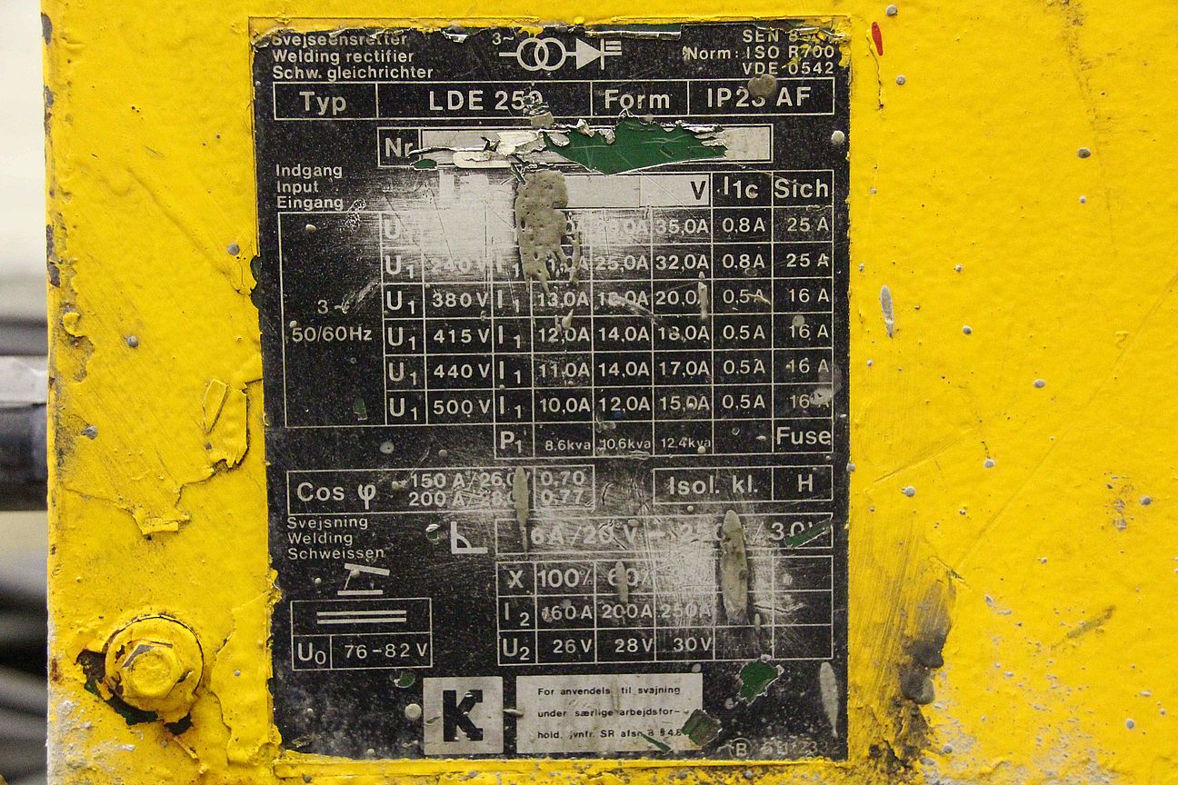 Welding rectifier, electrode welding machine, electrode welding rectifier -Manufacturer: Migatronic, welding rectifier type LDE 250 -Welding power: max. 250 A -Welding cable with electrode clamp -ground cable -Dimensions: 860/680/H650 mm -Weight: 164 kg