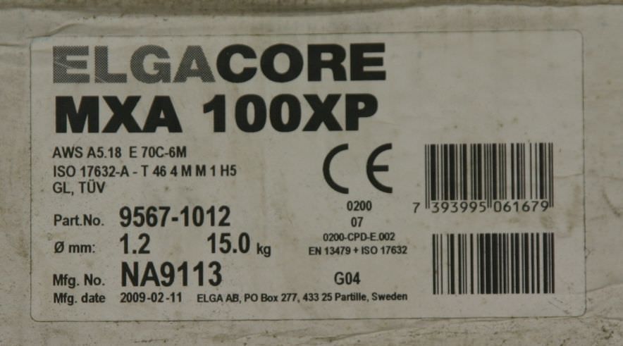 Wire electrode, welding wire, welding wire-Manufacturer: Elga, protective gas wire electrode cored wire Elgacore DWA 50 Ø1.2 mm-Type: Elgacore DWA 50 Ø1.2 mm-Dimensions: Ø 200/55 mm-Weight roll: 5.1 kg