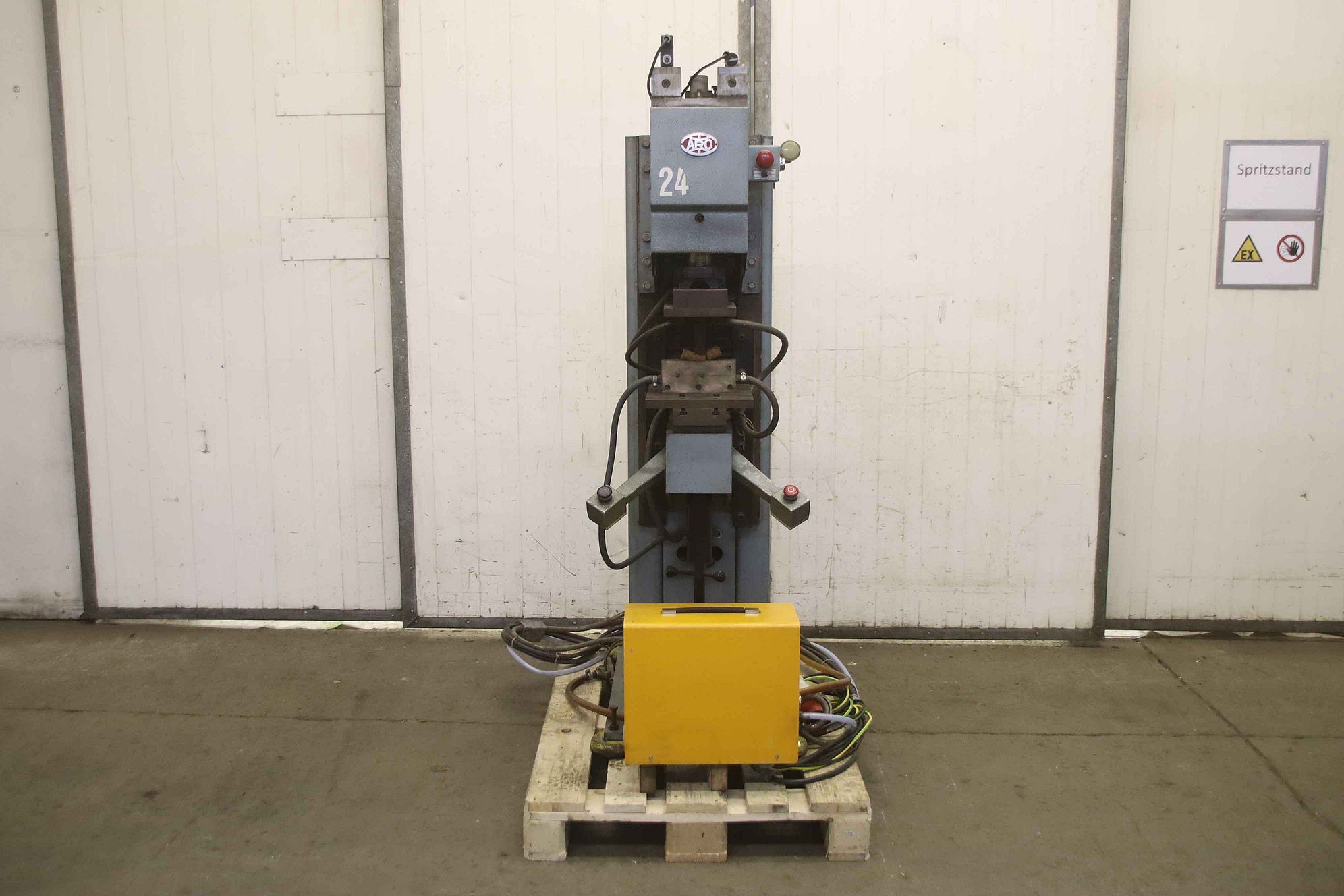 Spot welder, spot welding machine, spot welding machine, spot welding tongs, spot welding machine, projection welding machine, projection welding machine-Manufacturer: Aro, projection welding machine, spot welding machine, water-cooled, type N601-Welding power: 65 kVA-Welding control: Aro 25-002-2-Transport dimensions: 1000/510/H1720 mm-Weight: 538 kg