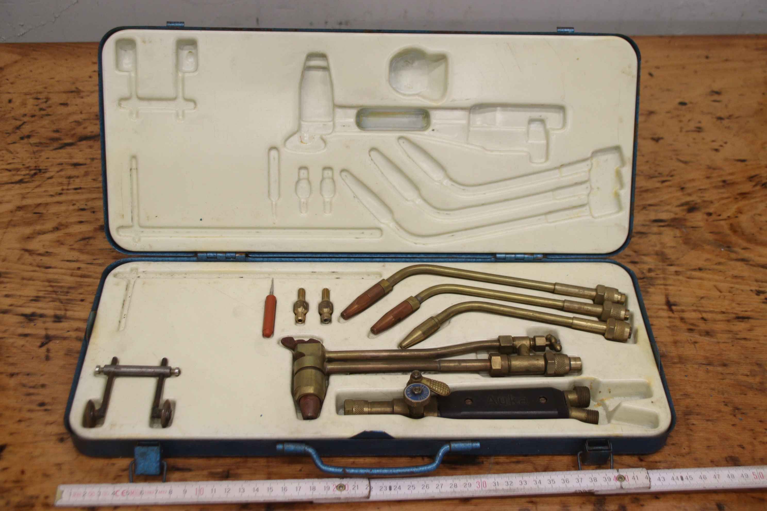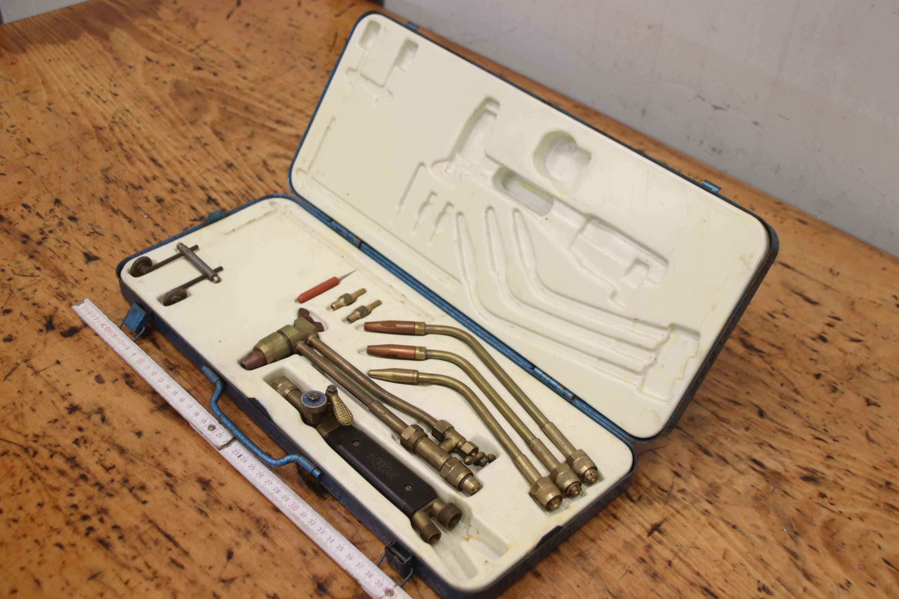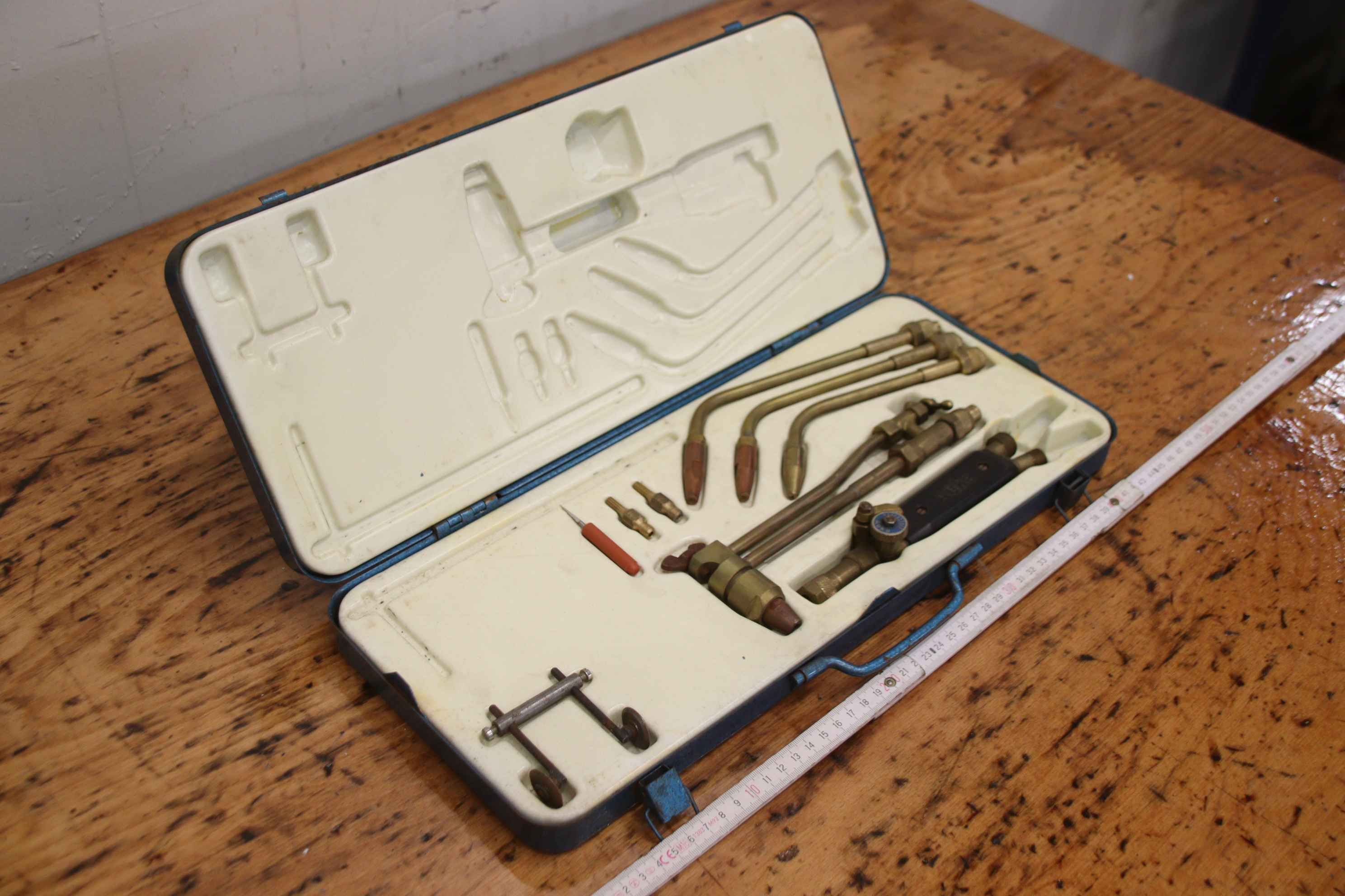 Flame cutting machine, torch, oxy-fuel cutting machine, cutting torch, welding torch, hand cutting torch, welding set-Manufacturer: Auka Rhöna, burner set in a tin box-Burner sizes: 2-4 / 4-6 / 6-9 mm-Cutting torch:-Accessories: see pictures-Dimensions case: 450/190/H55 mm-Weight: 2.9 kg