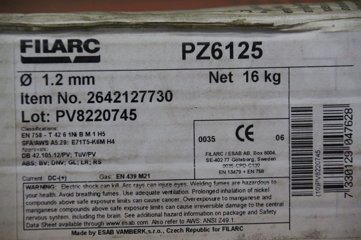 wire electrode, welding wire, welding wire -Welding wire: Filarc PZ6125 -Diameter: 1.2mm -Dimensions: O 300 /100 mm -Weight roll: 16 kg